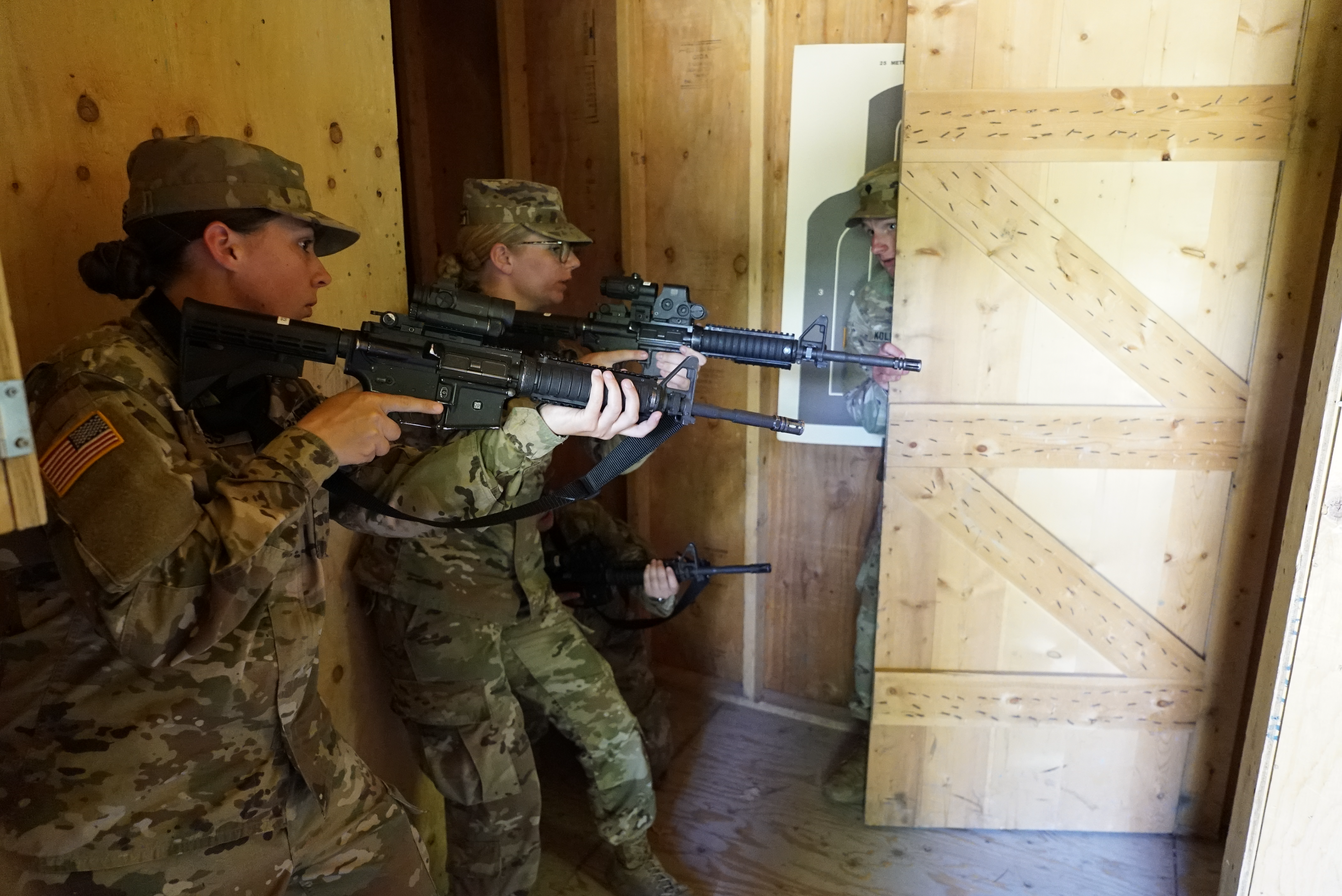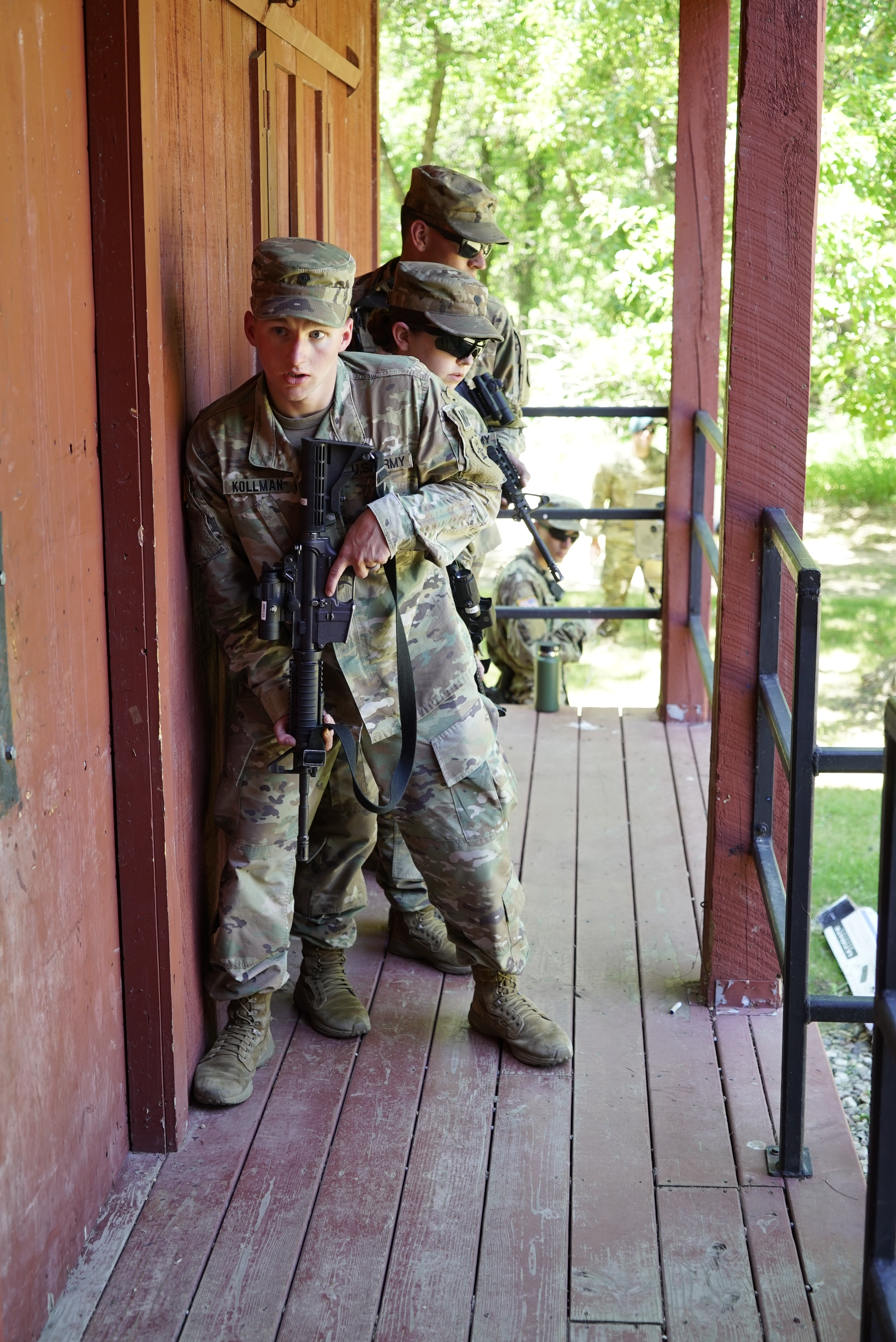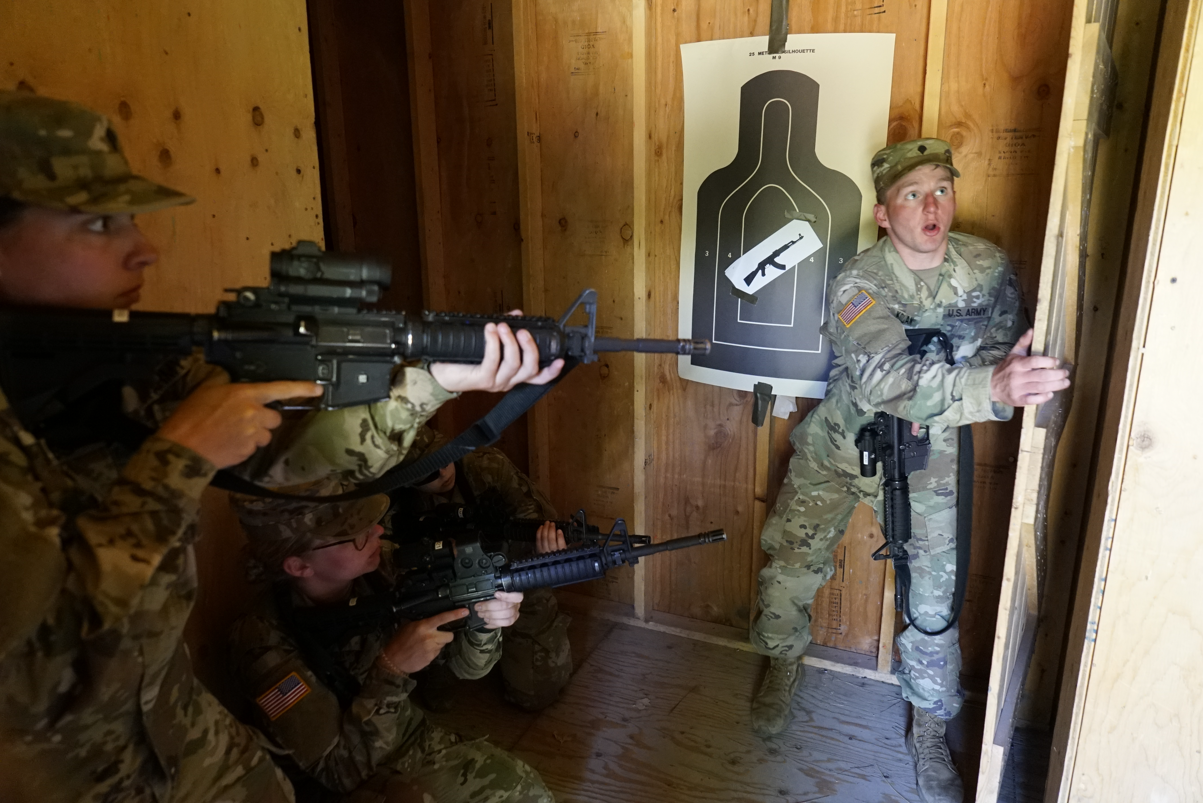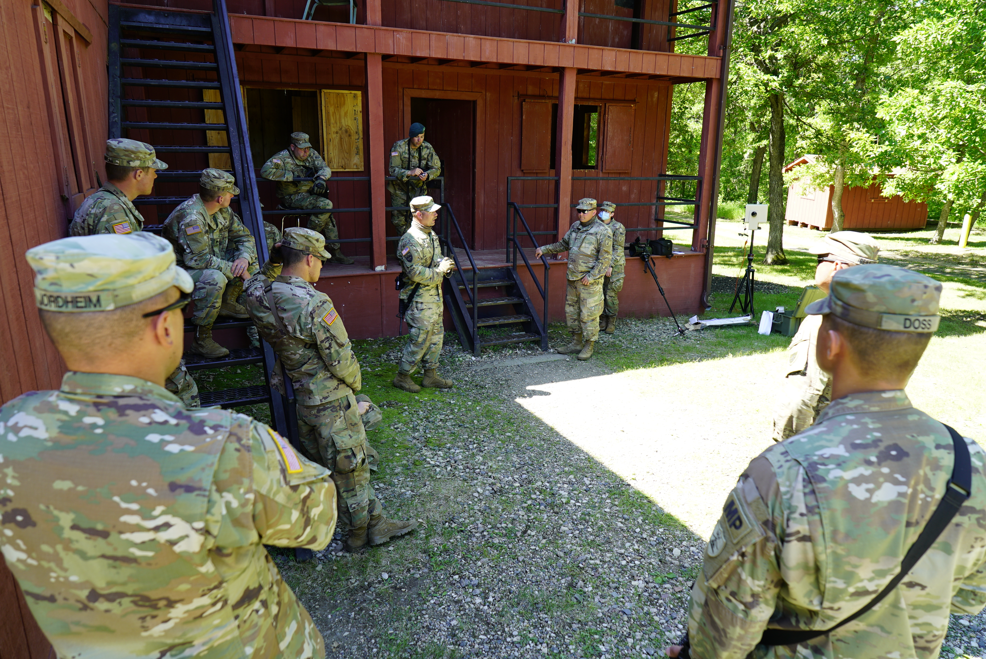 Spc. Austin Hanten, right, and Sgt. Luke Zabka lead a class on clearing a staircase during MOUT training on June 11. (U.S. National Guard photo by Sgt. 1st Class Charles Highland, N.D. National Guard Public Affairs)