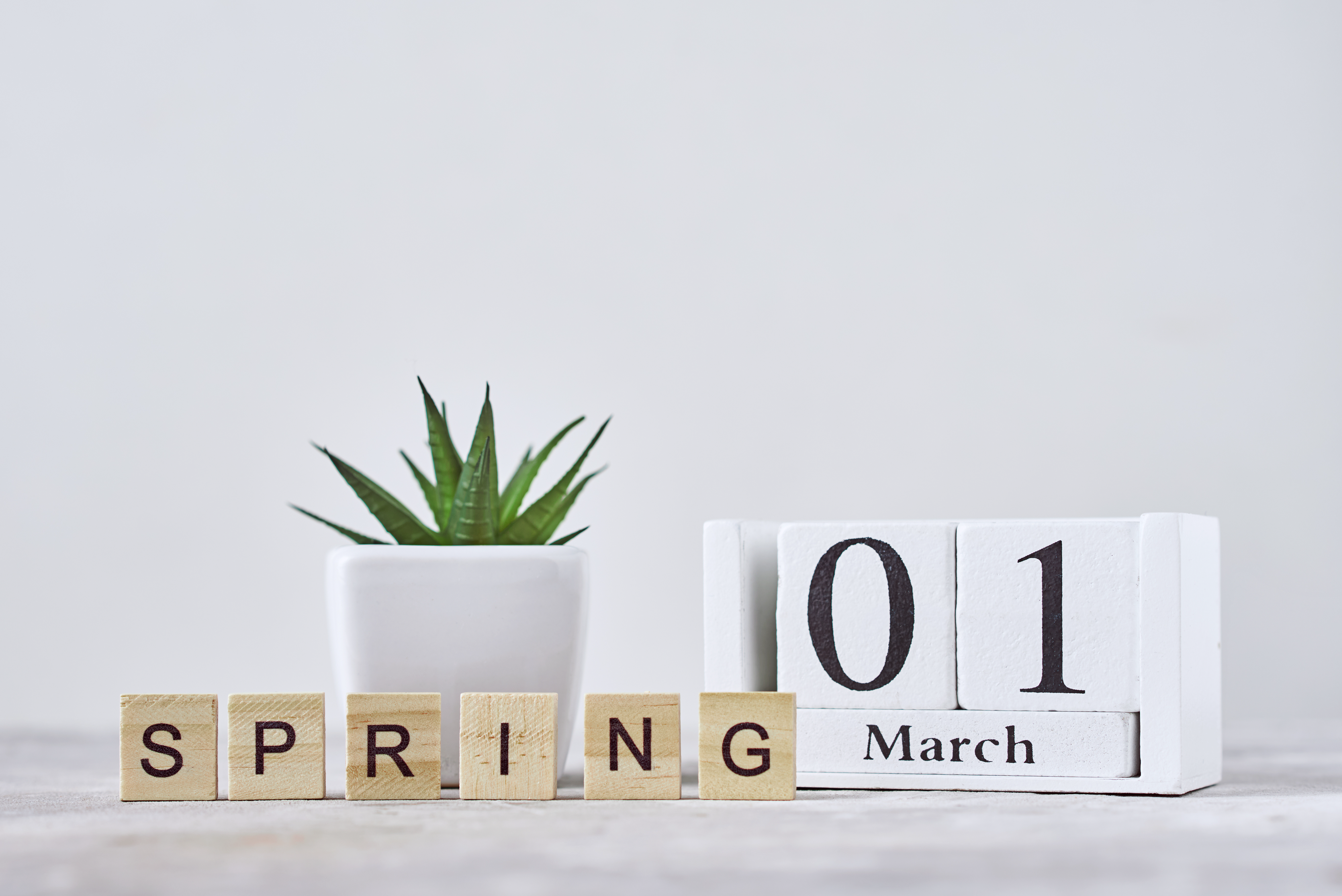 Created with images by nndanko - "Branch with almond blossoms on a brown wooden surface" • Lazy_Bear - "Wooden block calendar with date 1 march and plant on the table. Spring concept"
