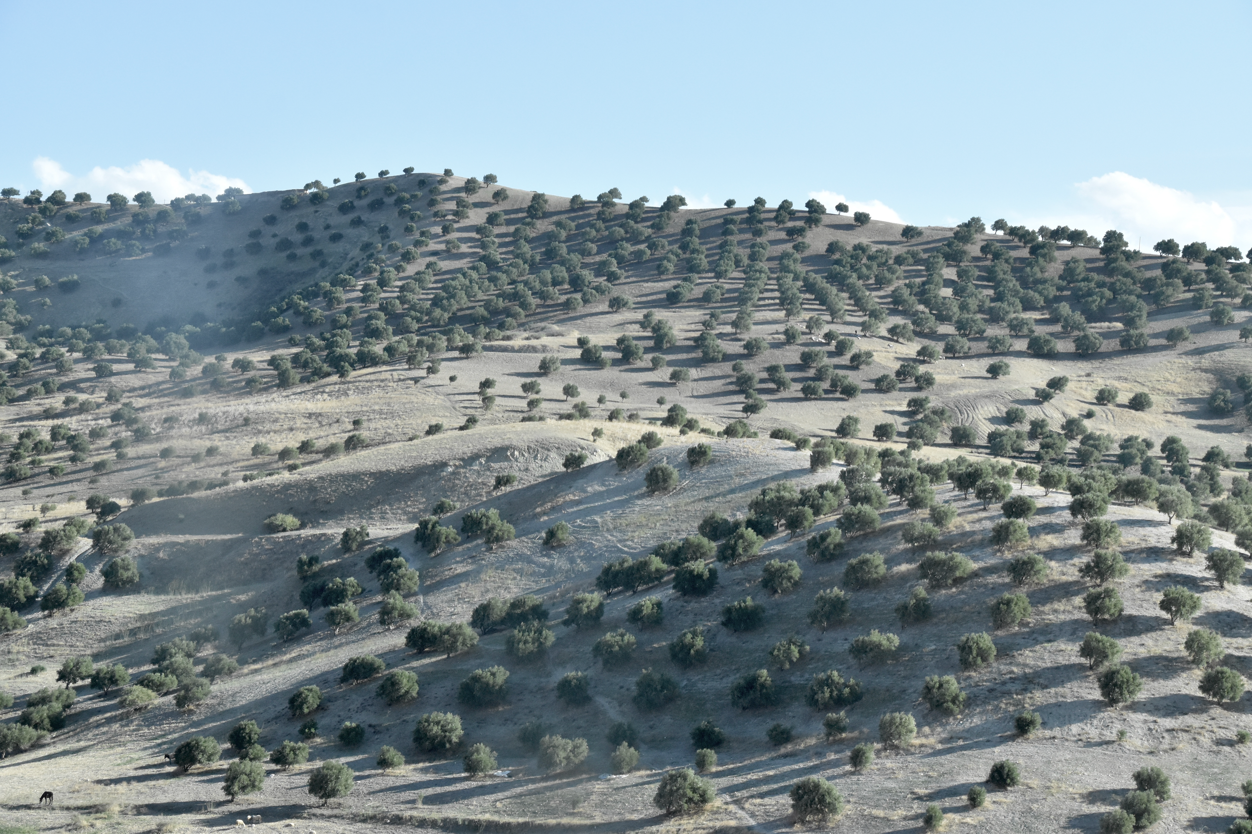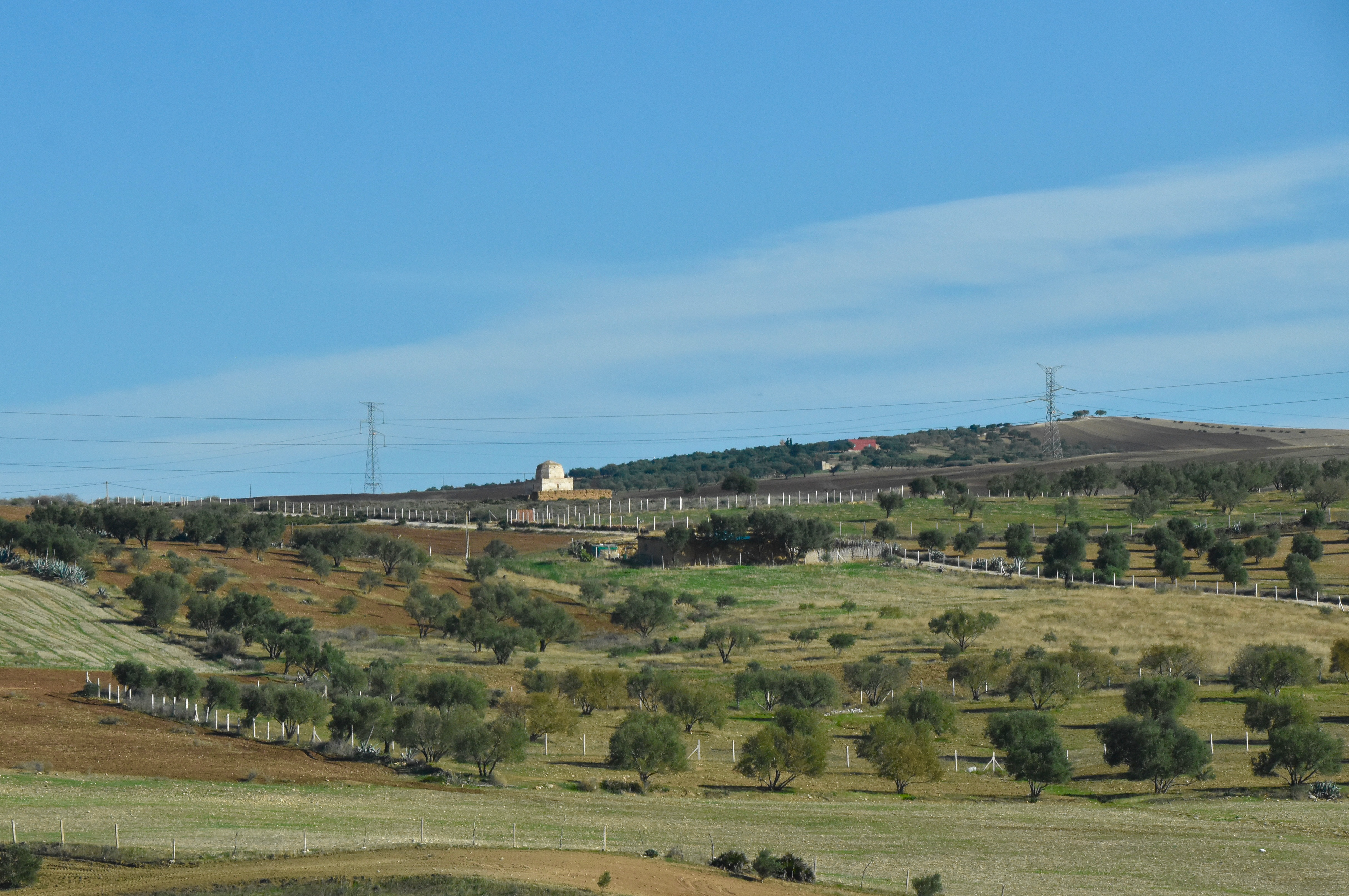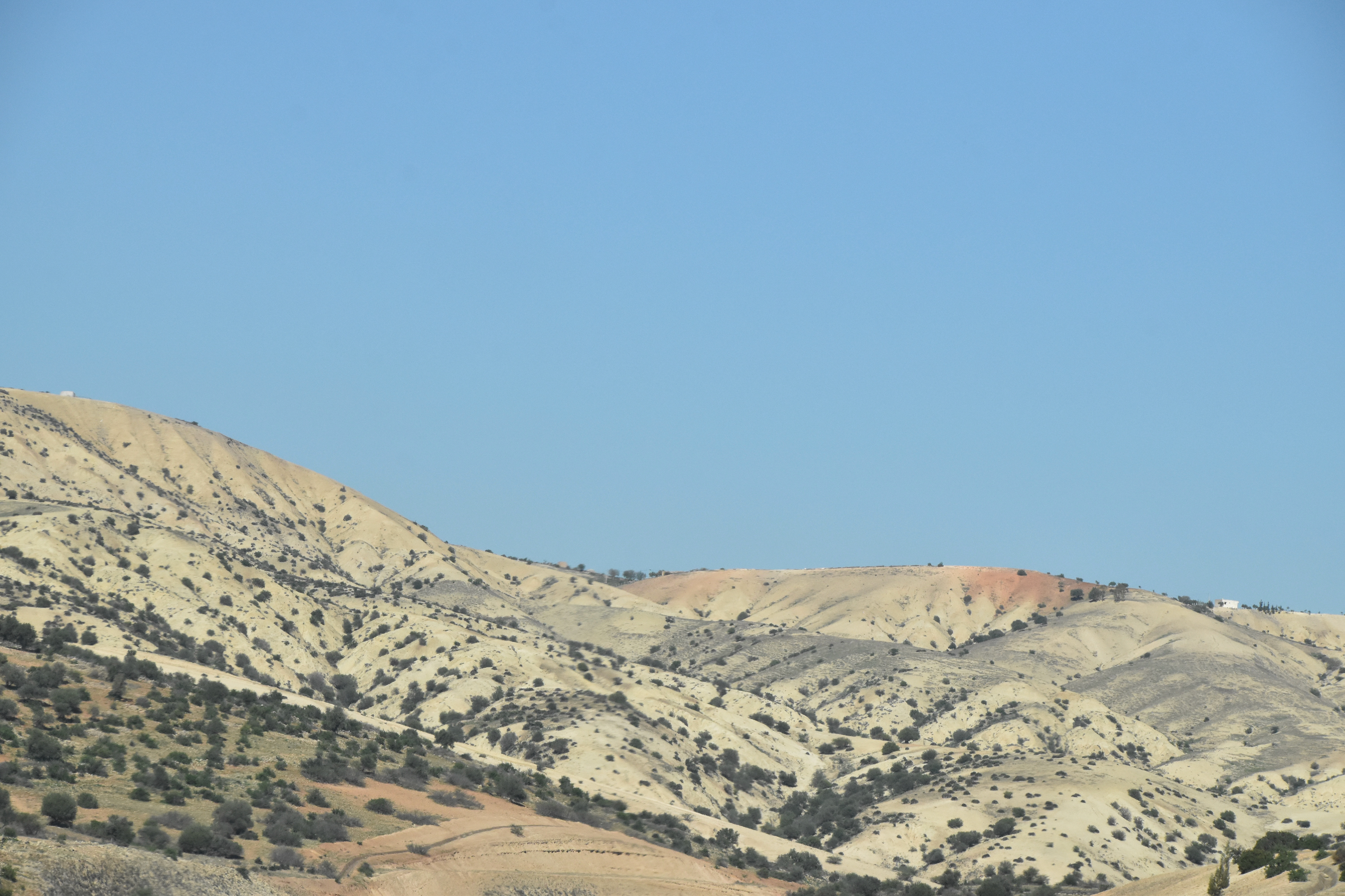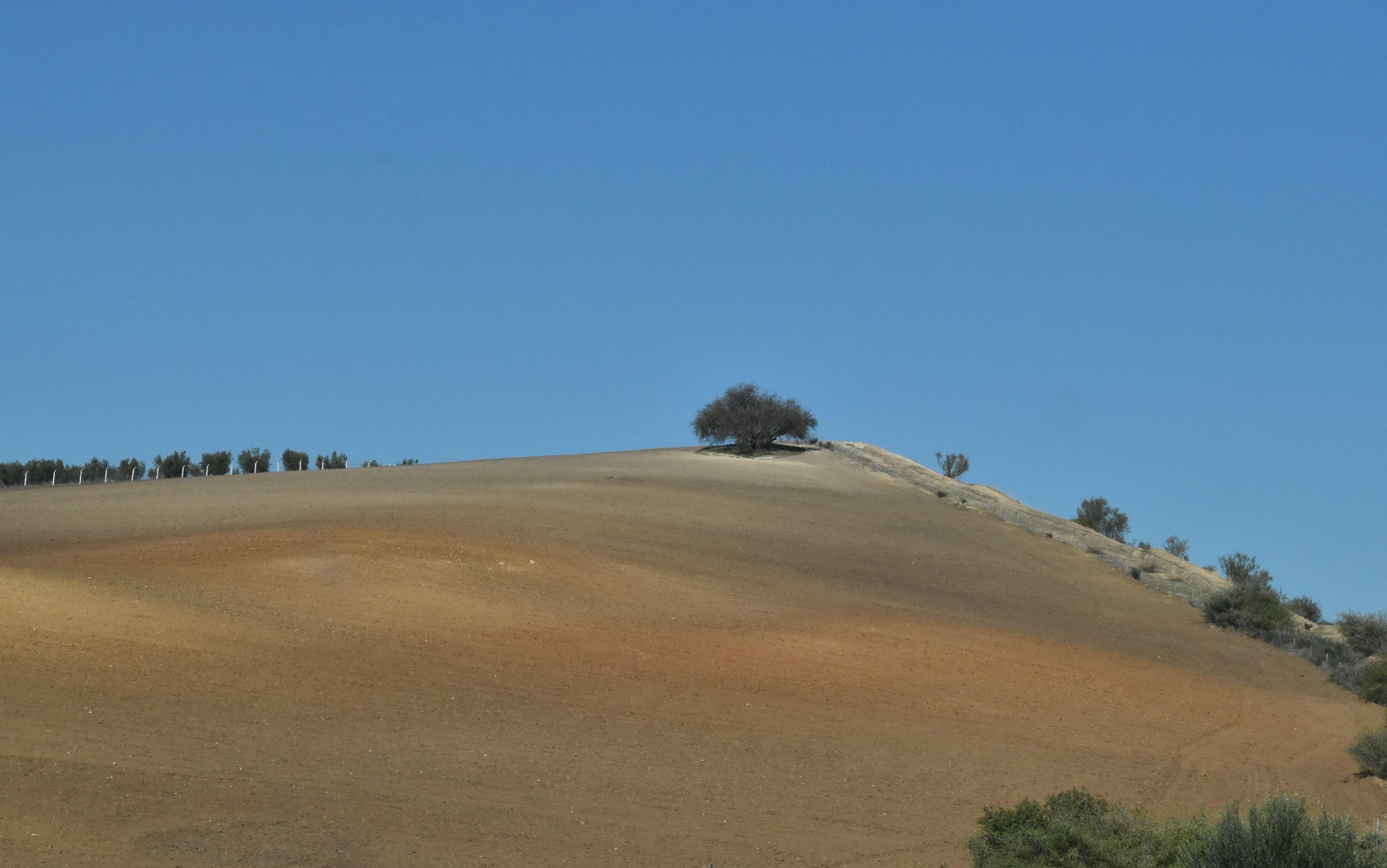 De chaque côté de cette voie rapide, des cultures à perte de vue, mosaïques de bruns, de jaunes, d’ocres, de blancs, de roses… fraîchement labourés, mouchetés d’oliviers en pleine période de cueillette. Paysages de sable.