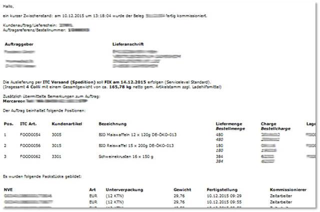 Nach erfolgter Kommissionierung des Auftrags wird eine Kommissionier-Meldung an die Schnittstelle gegeben, bzw. an den vom Kunden definierten Verteiler geschickt.