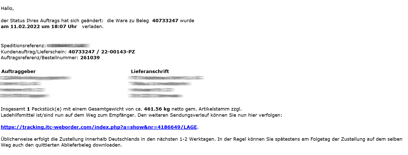 Versandmeldung per E-Mail inklusive Tracking Link (Innerdeutscher Systemverkehr und KEP Dienste). Auf Wunsch wird dieses Dokument auch direkt an den Empfänger geschickt.