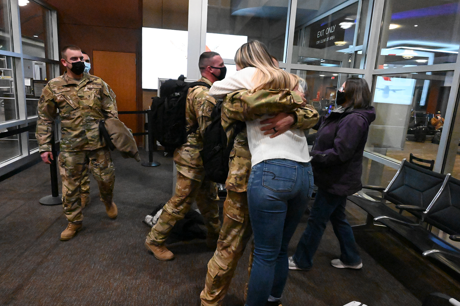 Technical Sergeant Garrett Rix, 119th Civil Engineer Squadron, hugs his wife as Staff Sgt. Wyatt Koenig, Staff Sgt. Jacob Cuchna, and Staff Sgt. Joseph Castiglione follow him into the Hector International Airport, Fargo, N.D., Dec. 28, 2021. The Airmen returned from a six-month deployment to Africa.