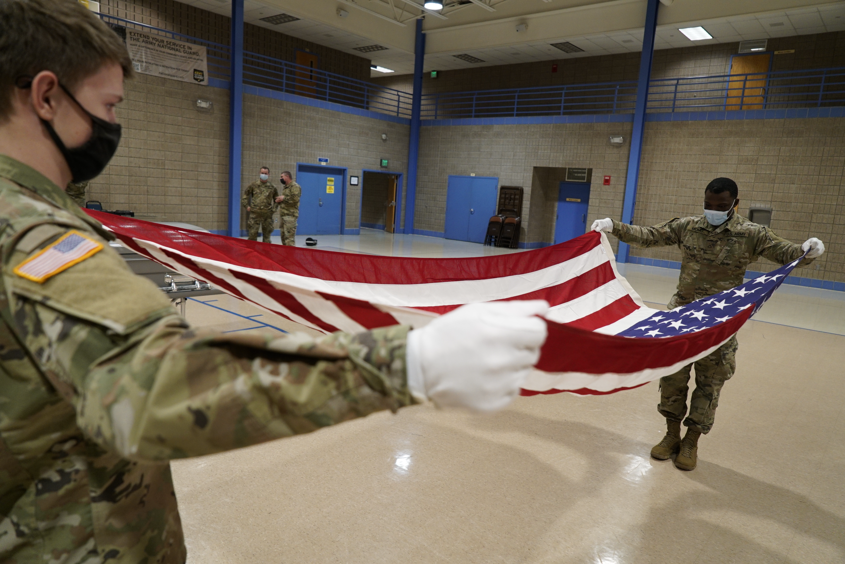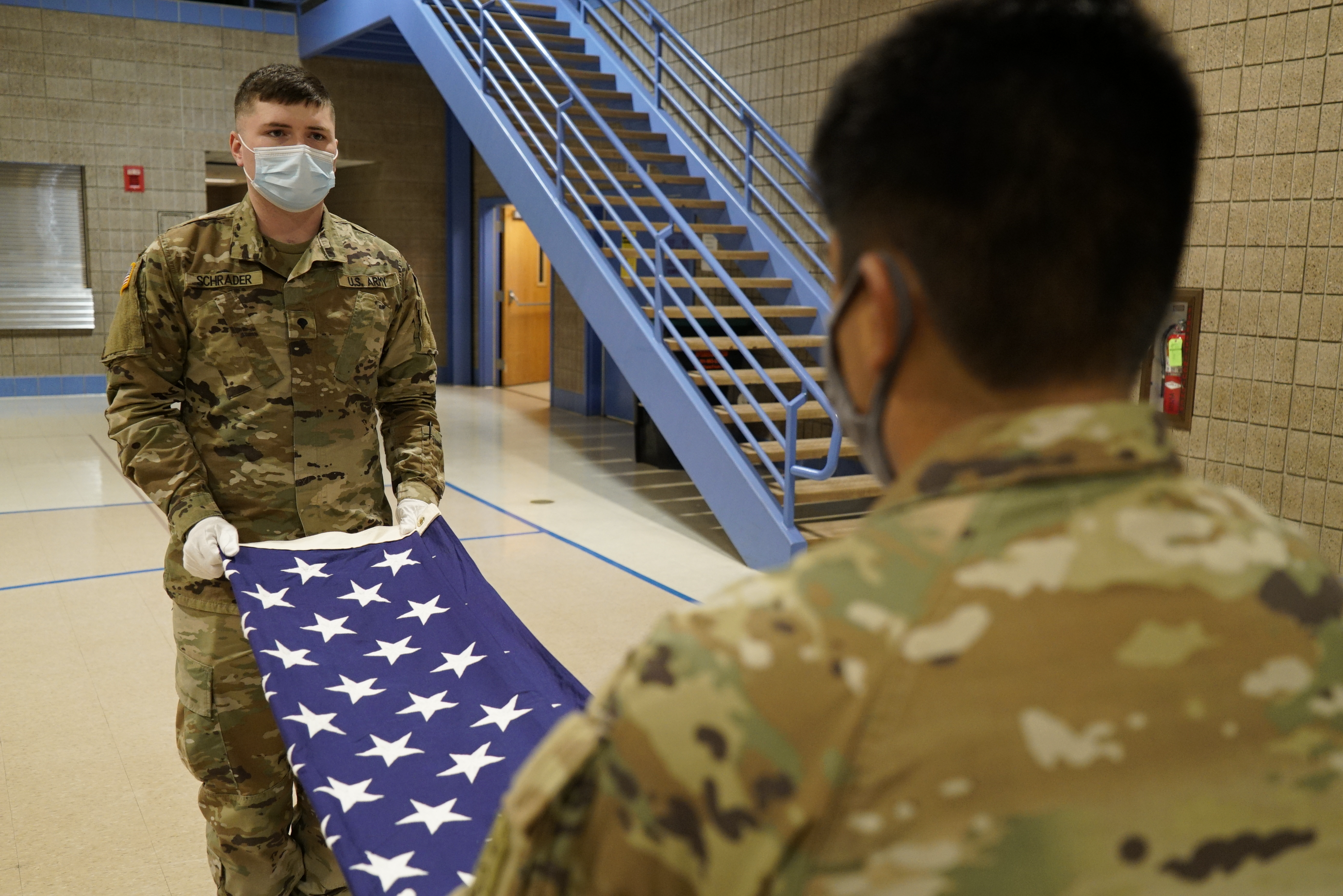 Private Michael Mehlhoff, 131st Military Police Battalion, left, and Pfc. Melvin Momo, 131st Military Police Battalion, unfurl the U.S. flag during a three-day military funeral honors course at the Raymond J. Bohn armory, Bismarck, Jan. 5, 2022.