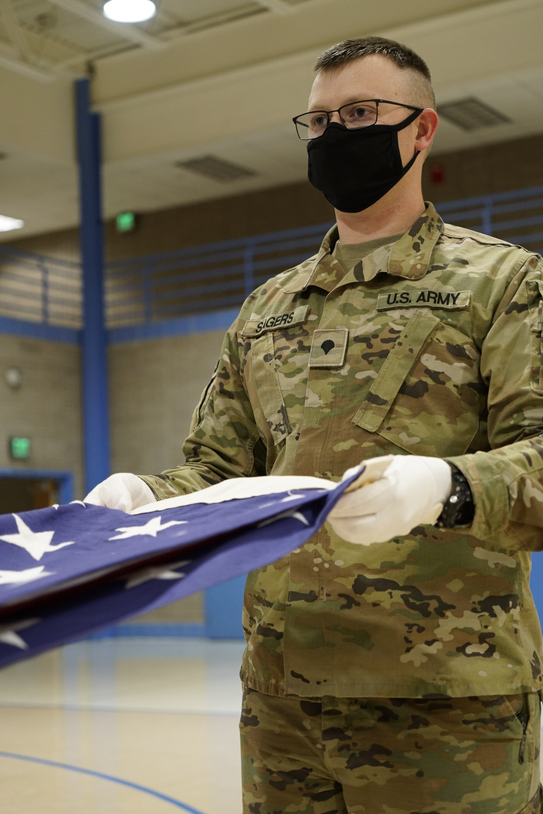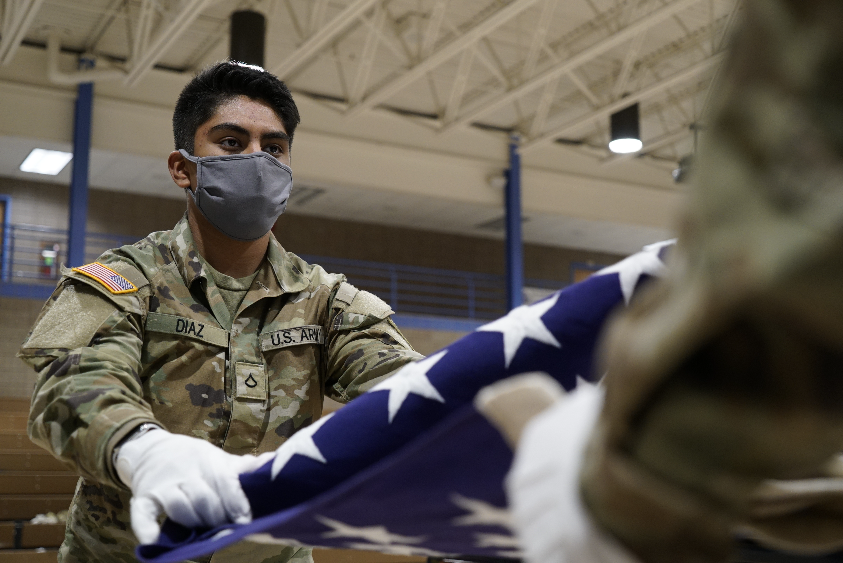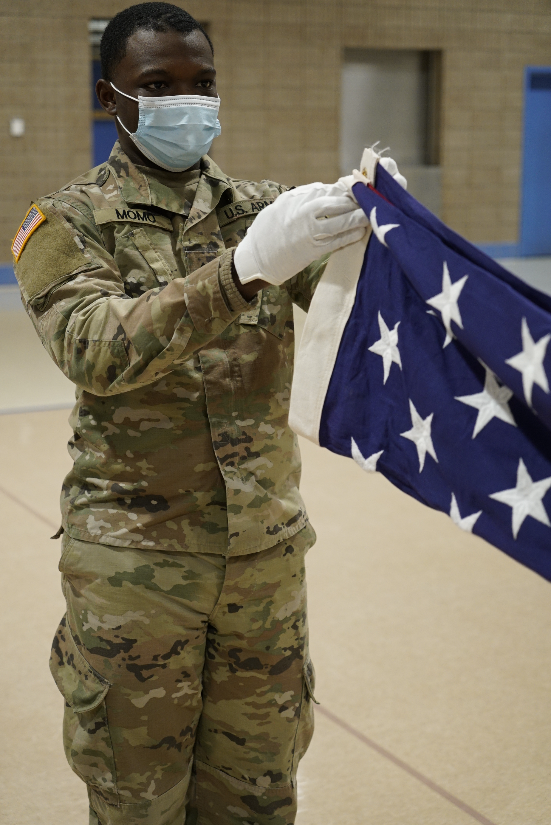 Private First Class Israhias Diaz, 957th Engineer Company, folds the flag during a three-day military funeral honors course at the Raymond J. Bohn armory, Bismarck, Jan. 5, 2022.