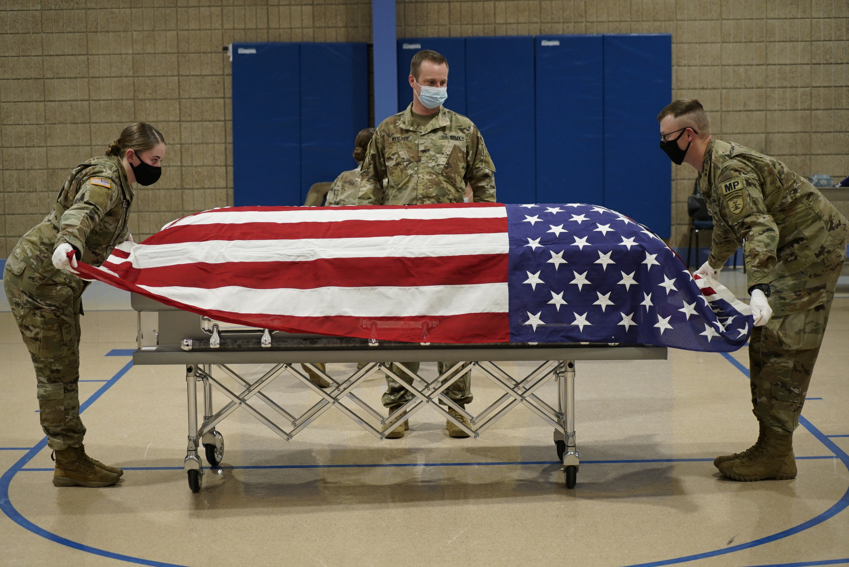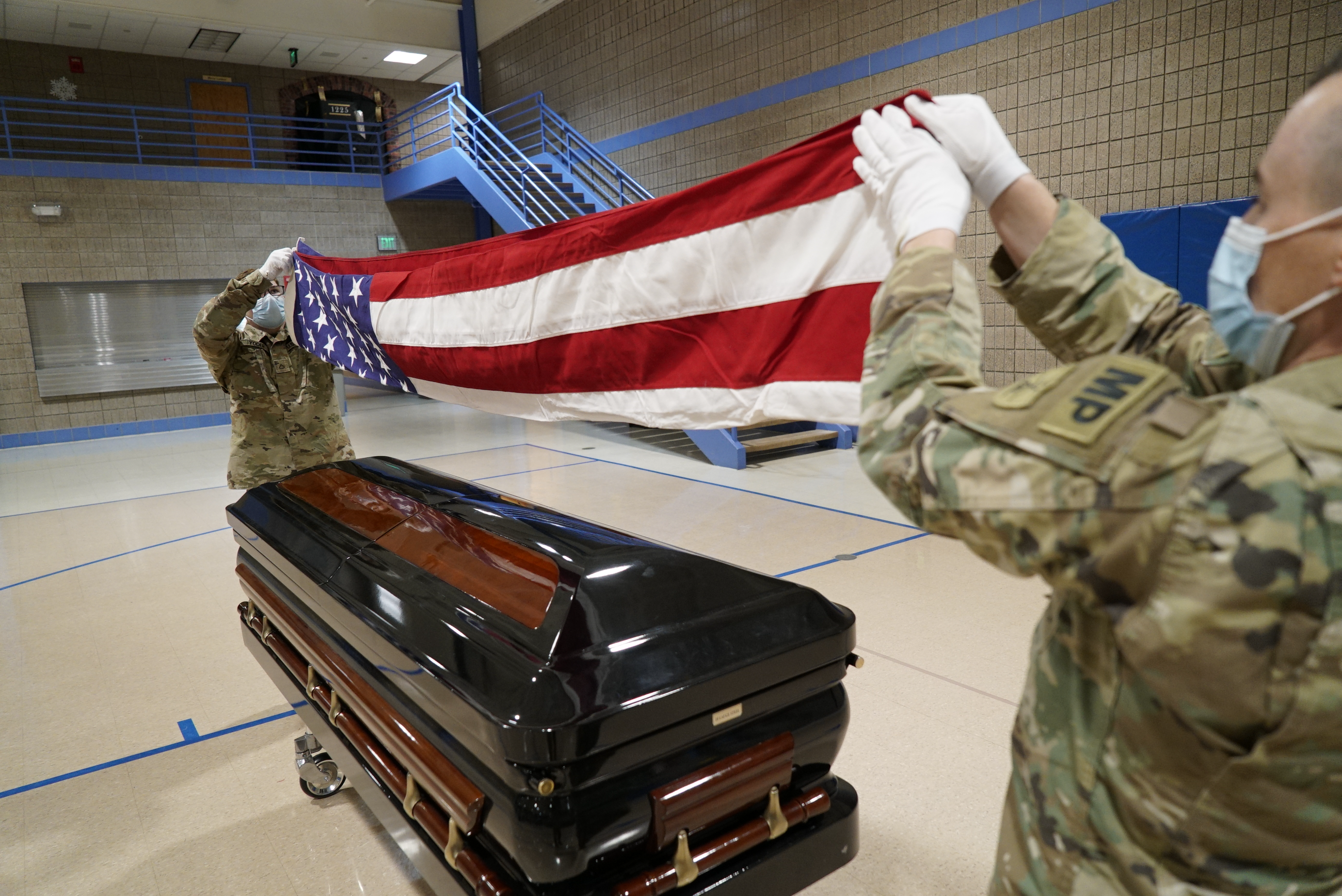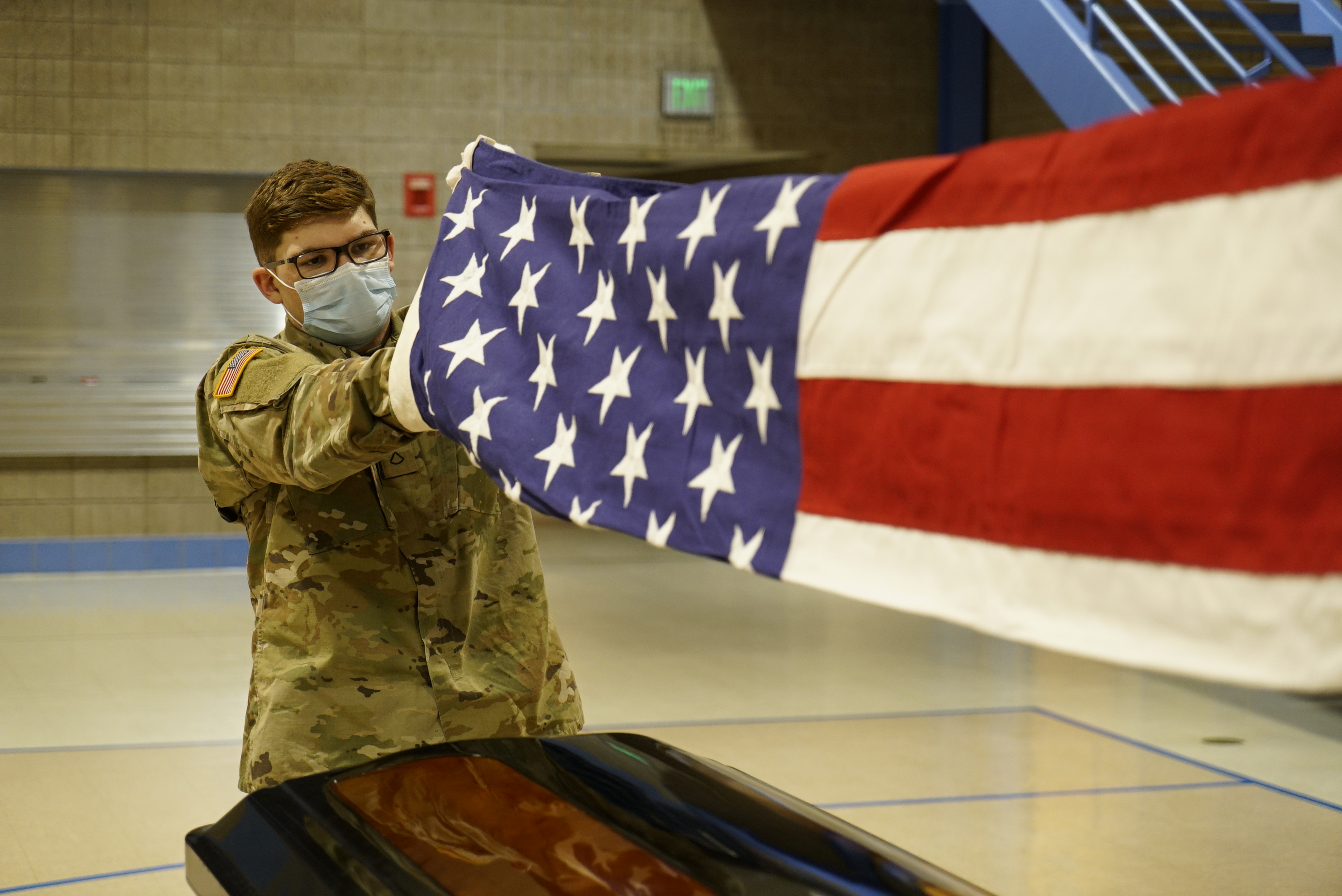 Private First Class Brian Yodder, left, and Staff Sgt. Daniel Rick, both of the 816th Military Police Company, lift the flag from a coffin during a three-day military funeral honors course at the Raymond J. Bohn armory, Bismarck, Jan. 5, 2022.