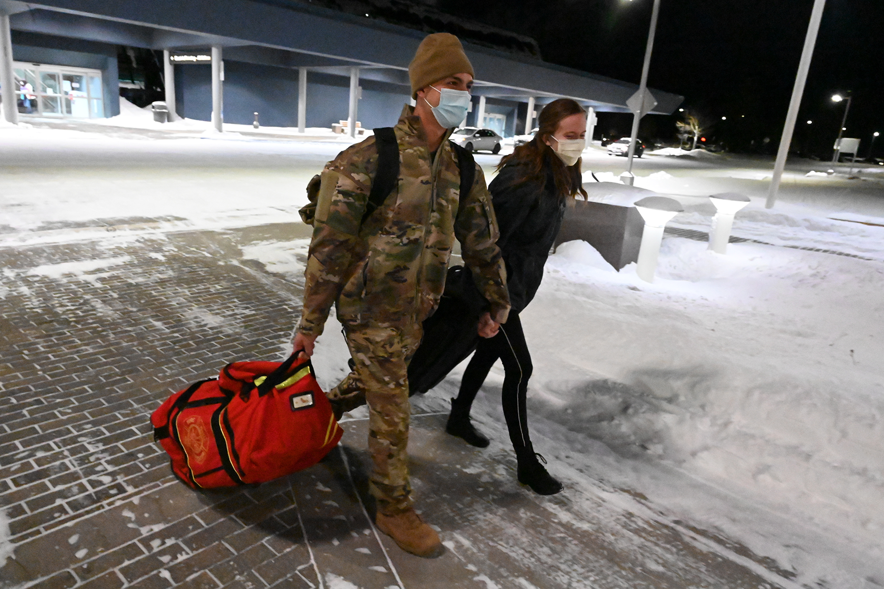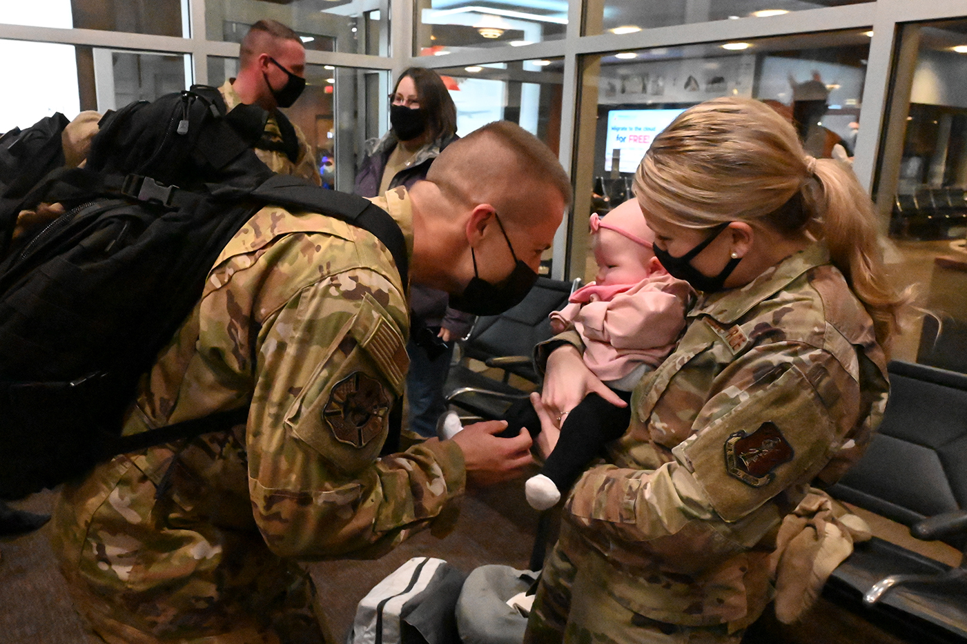 Top: Tech. Sgt. Garrett Rix, a fire fighter assigned to the 119th Civil Engineer Squadron, is greeted by his sister Master Sgt. Taylor Voelker, 119th Force Support Squadron, and her daughter at Hector International Airport, Fargo, N.D., Dec. 28, 2021. Rix returned home after completing a six-month deployment to Africa. (National Guard photo by Chief Master Sgt. David H. Lipp, 119th Wing)