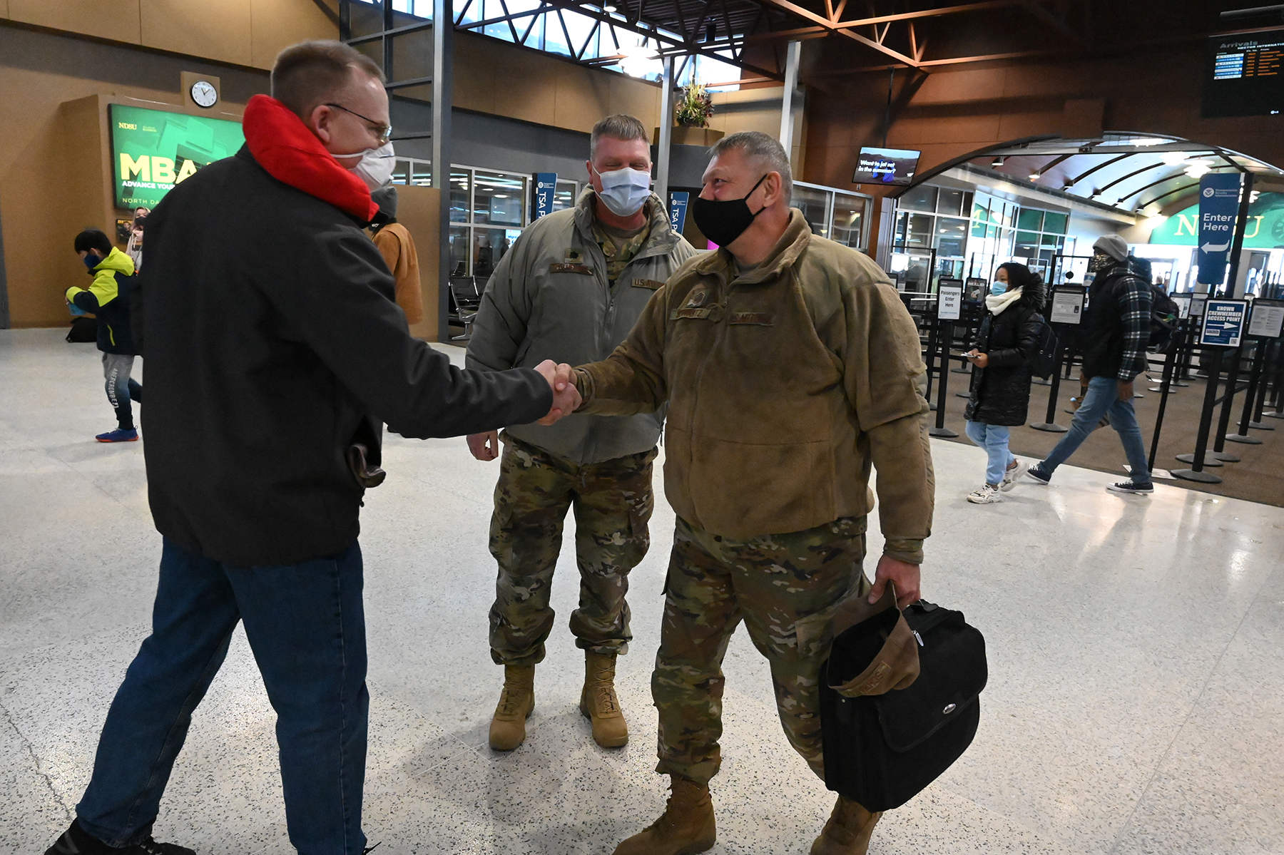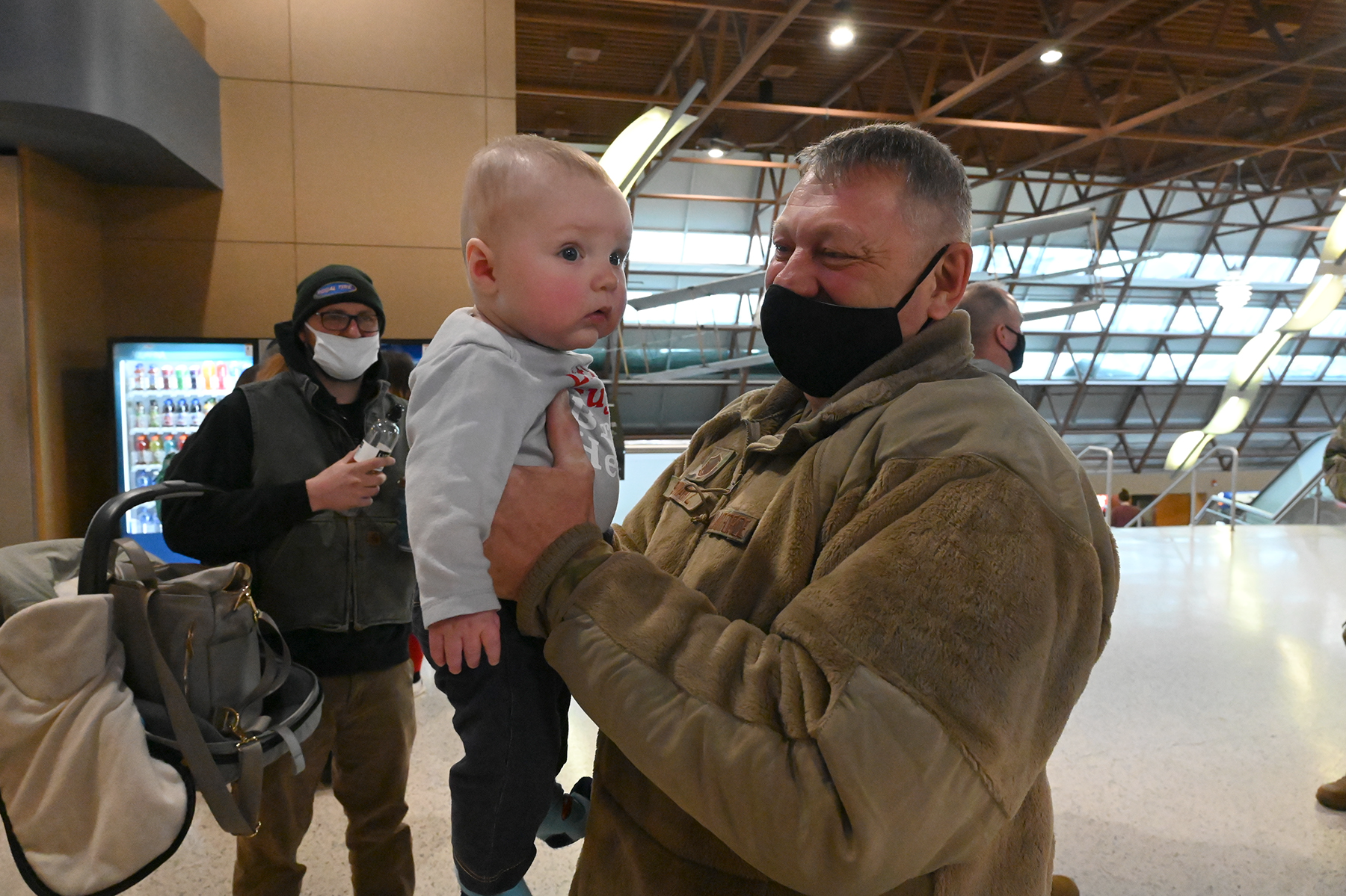 Master Sergeant Steven Schwartz, of the 119th Civil Engineer Squadron, right, is greeted by his grandson, family, and friends at the Hector International Airport, Fargo, N.D., upon his return from a six-month deployment to southwest Asia, Jan. 5, 2022. He met his grandson before he deployed, but you can still see the smile behind the mask as they enjoy a happy reunion.