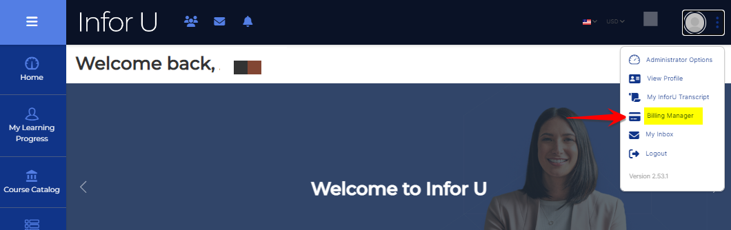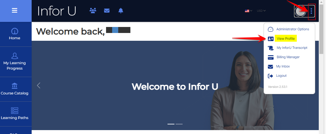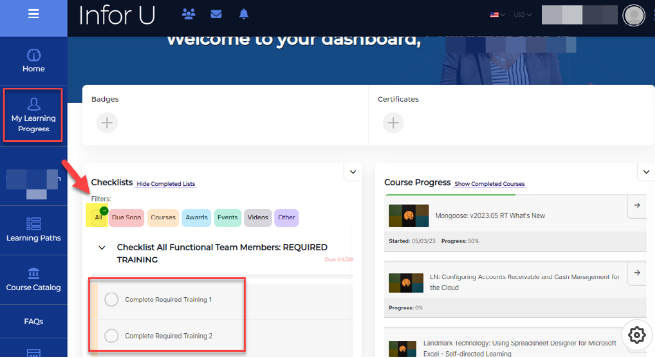 On the left-hand side navigation panel you can see “My Learning Progress” where you will find display of the courses you are enrolled in, assigned, courses in progress, and completed courses.