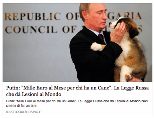 - I titoli urlati e sopra le righe. Ad esempio, nella notizia N°1 si legge: “Mille Euro al Mese per chi ha un Cane. La legge russa che dà lezioni al mondo”. Oltre agli errori ortografici possiamo constatare l’eccessiva enfasi posta nella frase "La legge russa che dà lezioni al mondo”.
