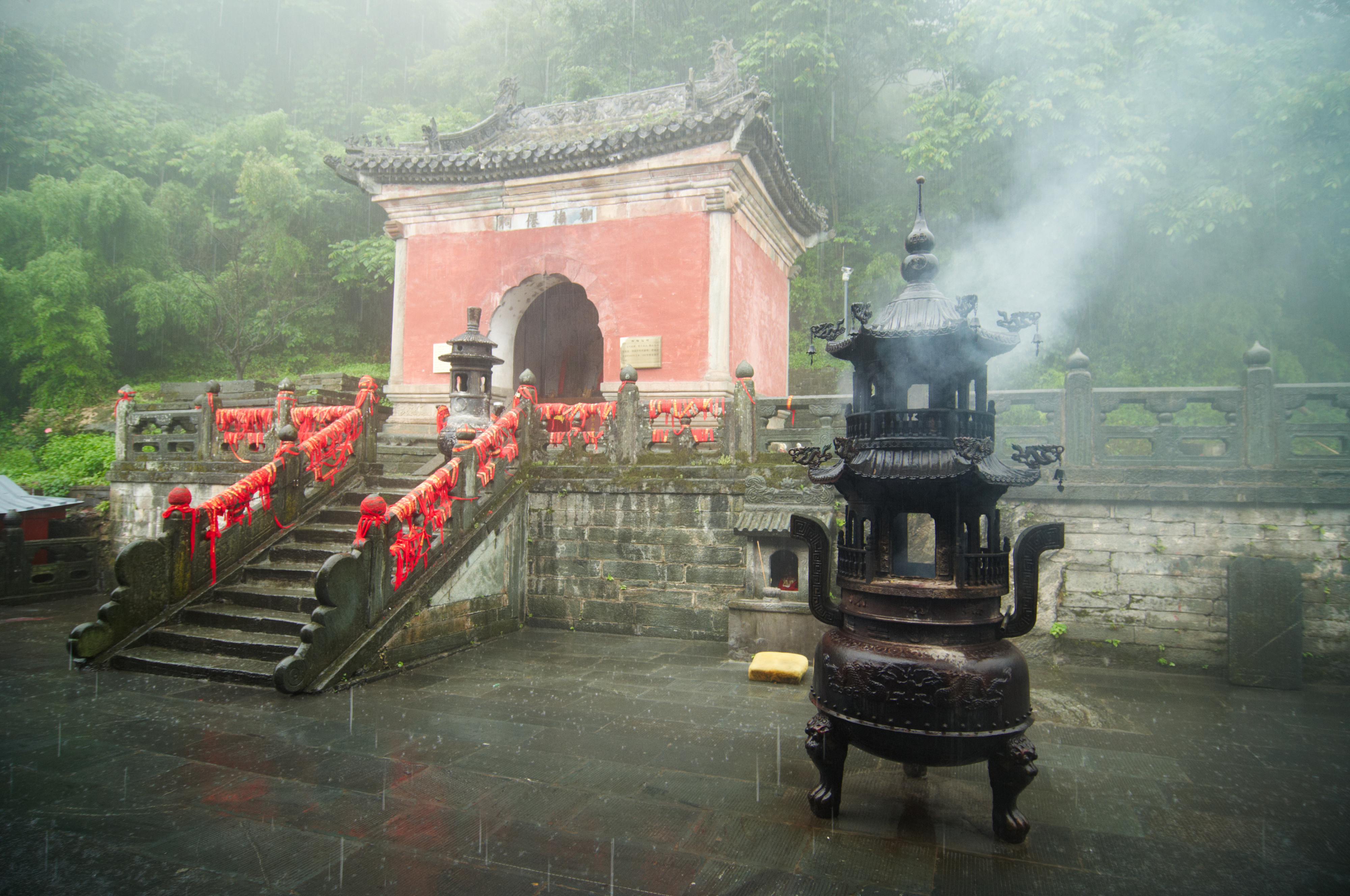 Created with images by Nhan - "Street view local visitor and tourist Wudang shan Mountains." • sandsun - "Beautiful architecture in Ancient Wudang temple at rainy day, WudangShan"
