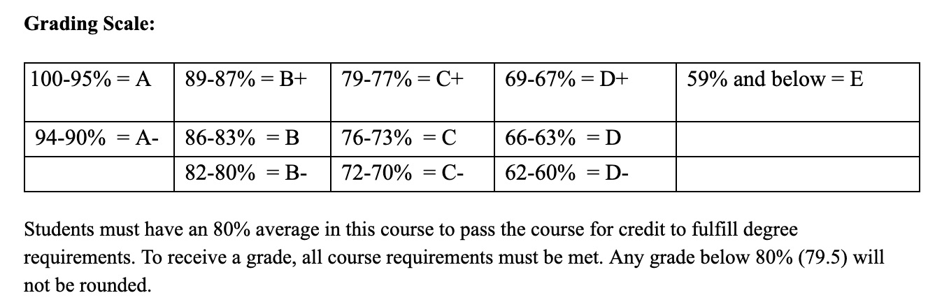 - This course follows the university grading system: A, A-, B+. etc. Incomplete grades will only be given for legitimate reasons such as severe illness or family crisis with 80% of course work completed. Late Policies differ per assignment. The following are important to note: Late proposals/outlines/papers may be accepted at the instructor's discretion in consultation with the student.