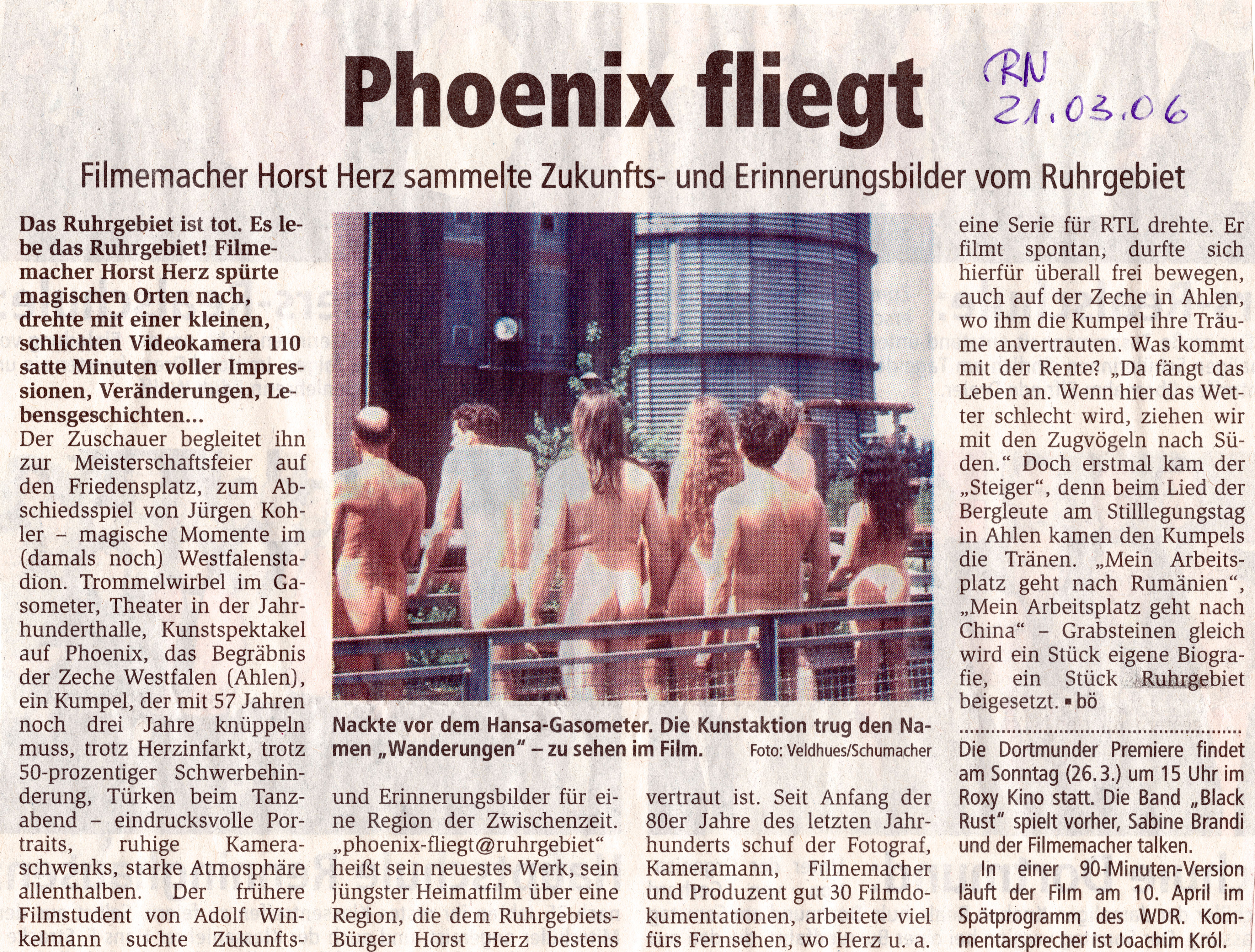 PHOENIX – FLIEGT (DVCAM / DigiBeta, 115´, 2010), Langzeitbeobachtung 2001 - 2010, gefördert vom Filmbüro NRW und der Filmstiftung NRW. Koprod.: WDR (Red. Felix Kuballa) und dem Sender Phoenix. Sprecher: Joachim Król. Sendetitel: "Kultur statt Kohle". Zum Inhalt: Über den Strukturwandel und die Rolle von Kunst und Kultur im Ruhrgebiet. Dokumentarische Filmcollage. Ein Beitrag zur Diskussion um die Zukunft eines der größten Ballungszentren.