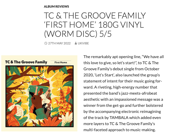 "First Home delivers as a massively triumphant outing from TC & The Groove Family – sure to be one of the standout releases of the year as well as the official launchpad to far greater successes for the boundlessly talented band" - UK Vibe