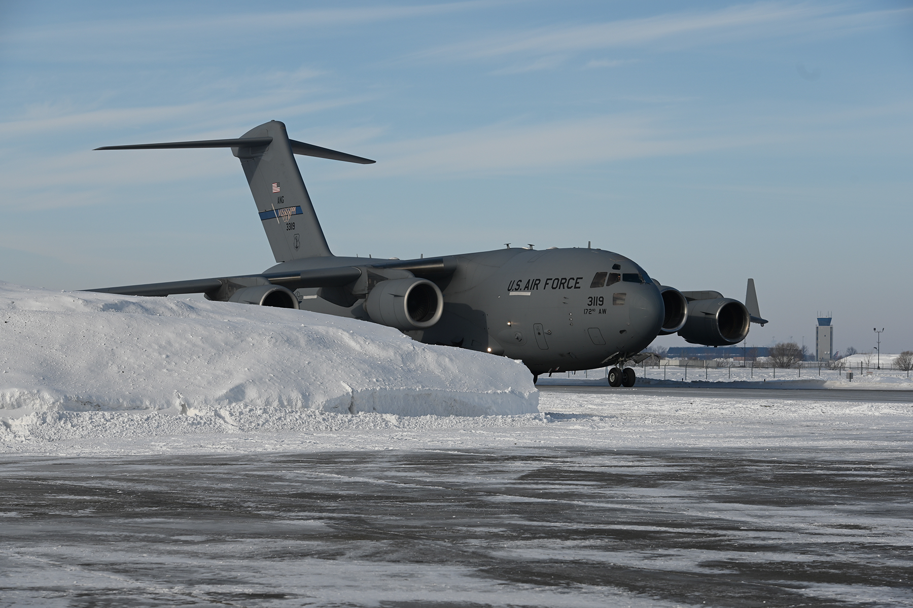 More than 80 N.D. Air National Guard members along with cargo recently departed from the Air National Guard Base in Fargo, bound for the Mississippi Air National Guard's Combat Readiness Training Center (CRTC) in Gulfport, Miss. on Jan. 22. These Happy Hooligans are participating in the annual exercise Southern Strike 20 and are part of a total force, multi-service training exercise hosted by the CRTC and Camp Shelby Joint Forces Training Center near Hattiesburg, Miss. This exercise emphasizes air-to-air, air-to-ground and special operations forces training to prepare for combat. Top photo: A Mississippi Air National Guard C-17 arrives at the Air National Guard Base in Fargo to pick up Airmen and cargo participating in Southern Strike 20.