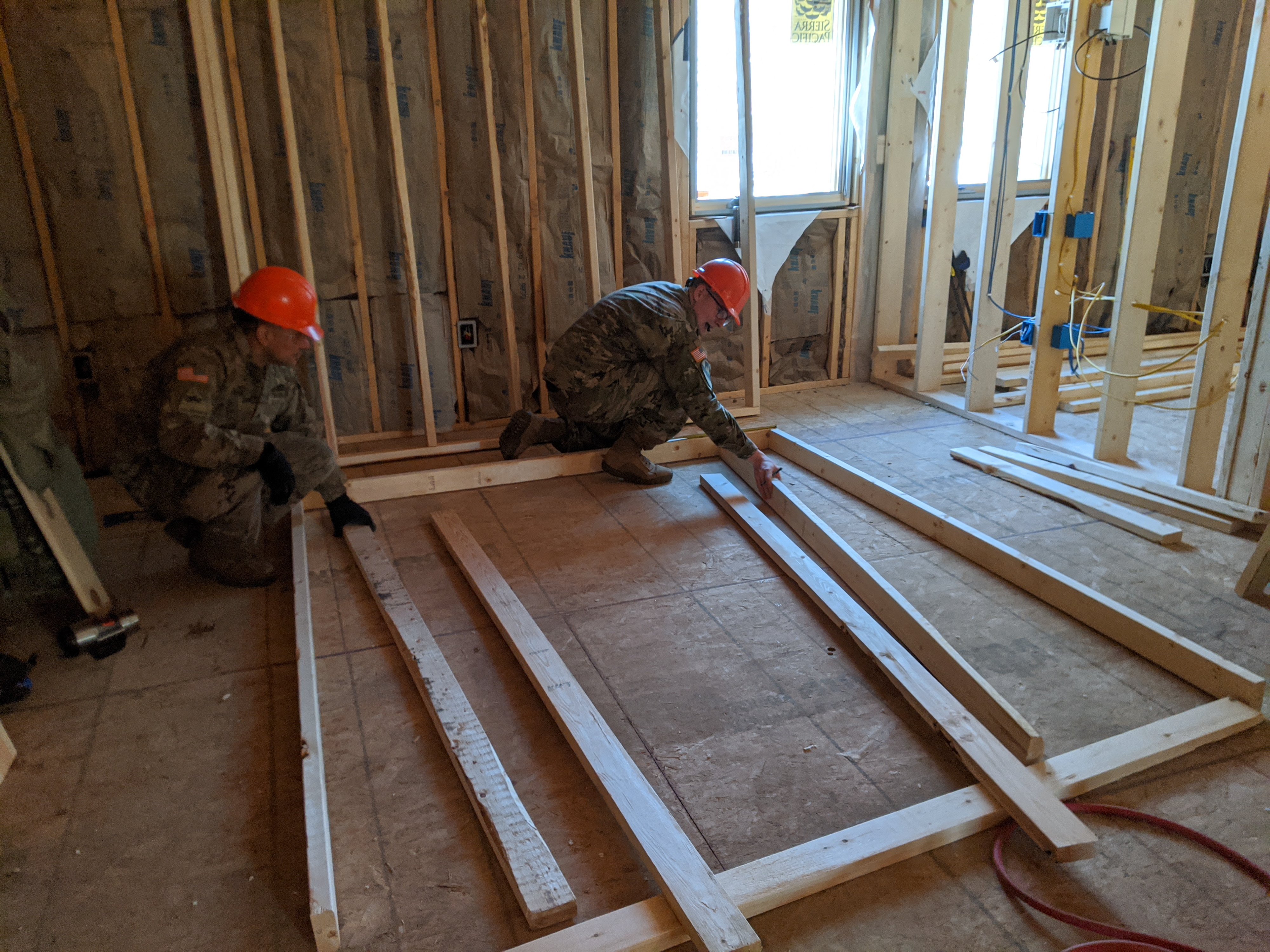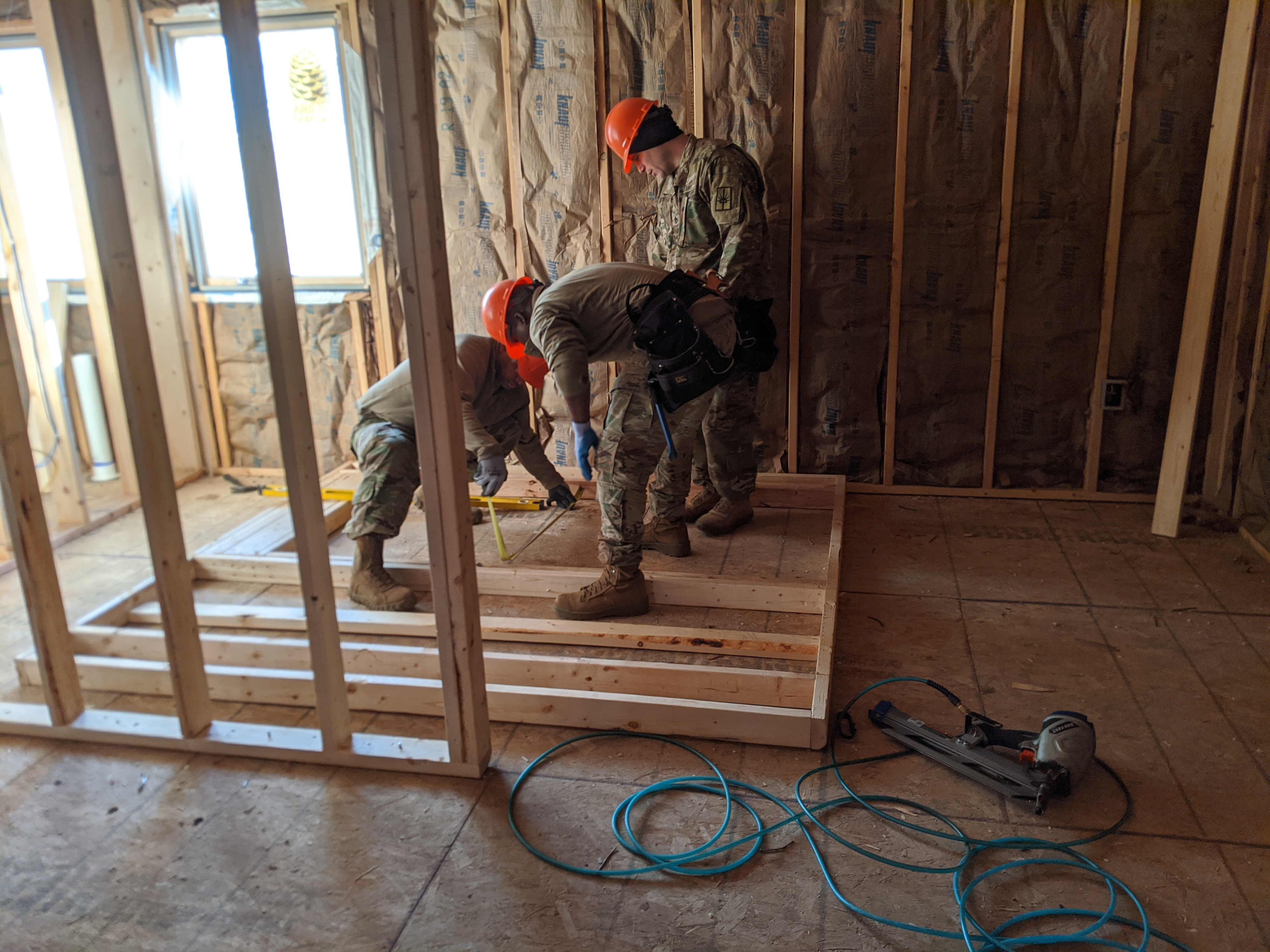 Students with the Construction Engineering Supervisor Advance Leaders Course recently had the opportunity to perform framing tasks on a lodging construction project at Camp Grafton Training Center. Part of the leadership tasks are to schedule next steps in the project in accordance with the construction blueprints and to perform quality control inspections. The course, held at the 164th Regional Training Institute, enables the students to be better equipped to train their squads and assist in directing combat engineer construction missions. Various units in the N.D. National Guard will contribute to the construction of the eight-plexe buildings that will house service members during training.