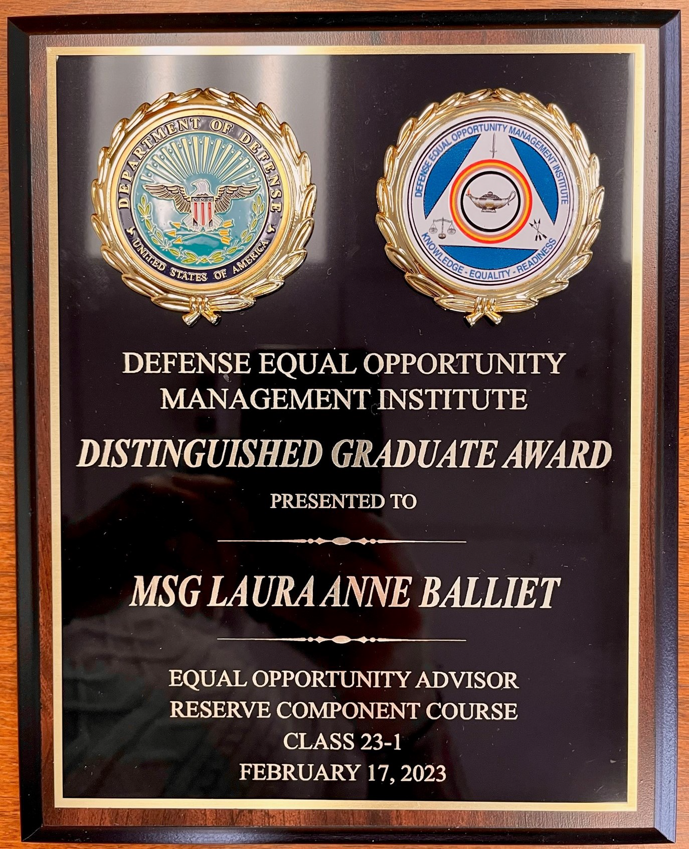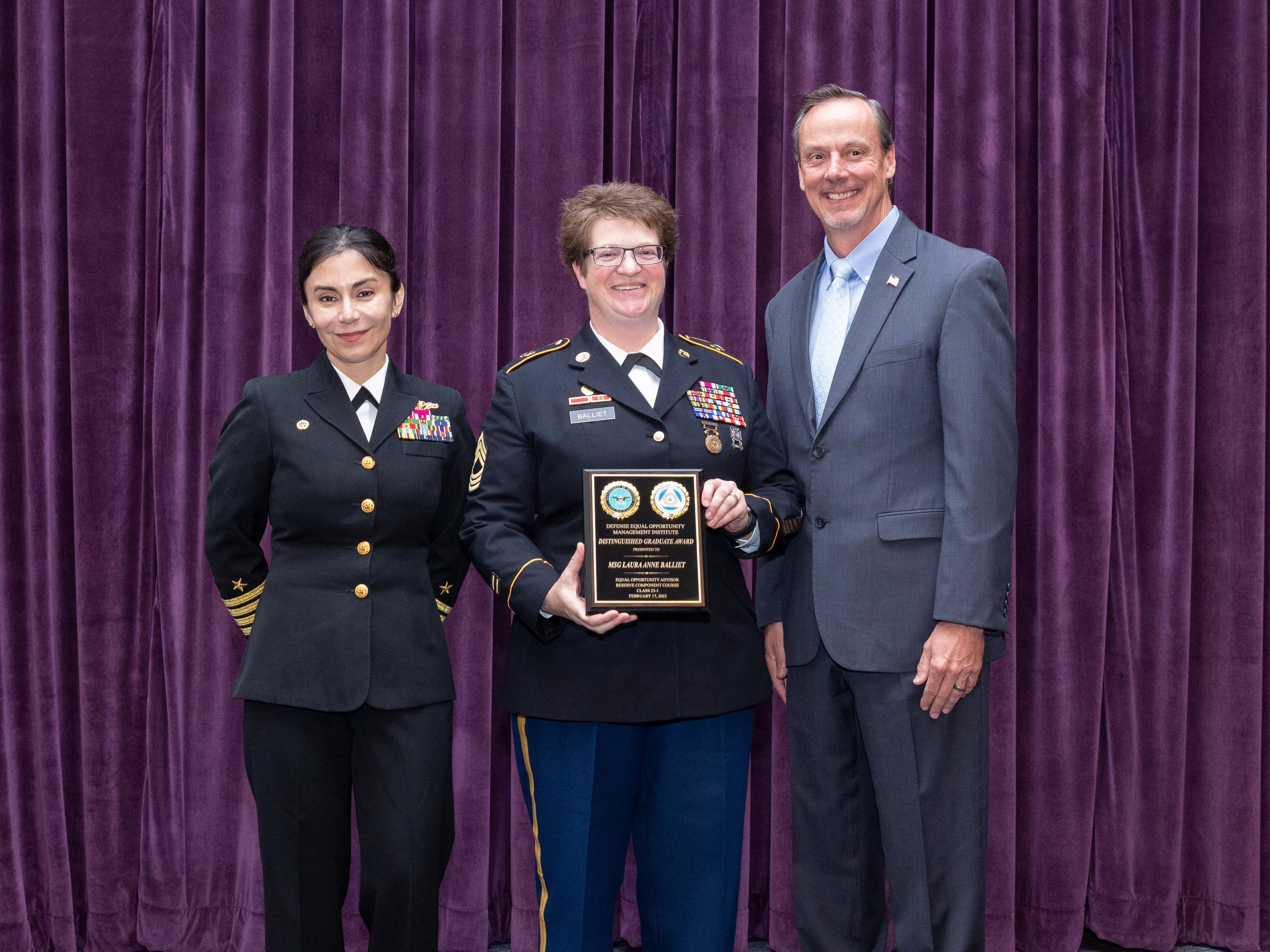 Master Sgt. Laura Balliet, a student in the Defense Equal Opportunity Management Institute’s Equal Opportunity Advisor Reserve Component Course, receives the DEOMI distinguished graduate award during the EOARCC Class 23-1 graduation ceremony on Feb. 17, 2023, at Patrick Space Force, Florida. (Photo by Michael Marks, DEOMI Photographer)