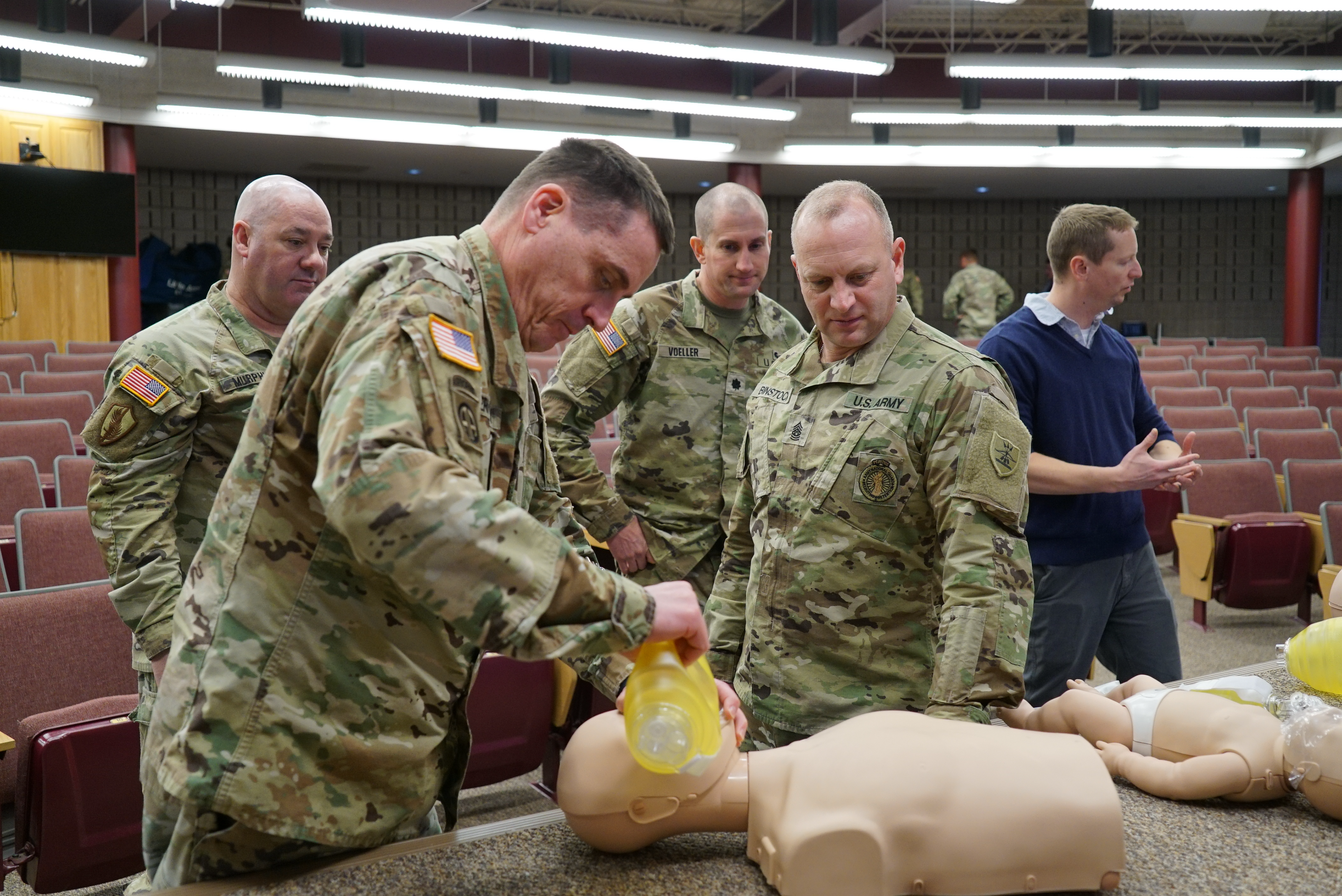 Brig. Gen. Jon Erickson, commander, N.D. Army Component Command, squeezes a Lifesaver Resuscitator Bag, with Command Sgt. Maj. Eric Binstock, N.D. National Guard state command sergeant major, assisting during a cardiopulmonary resuscitation (CPR) and automated external defibrillator (AED) class at the Raymond J. Bohn armory, Bismarck, N.D., Feb. 22, 2023. (National Guard photo by Sgt. 1st Class Charles Highland, N.D. National Guard Public Affairs Office)