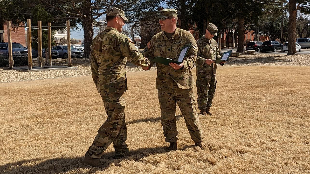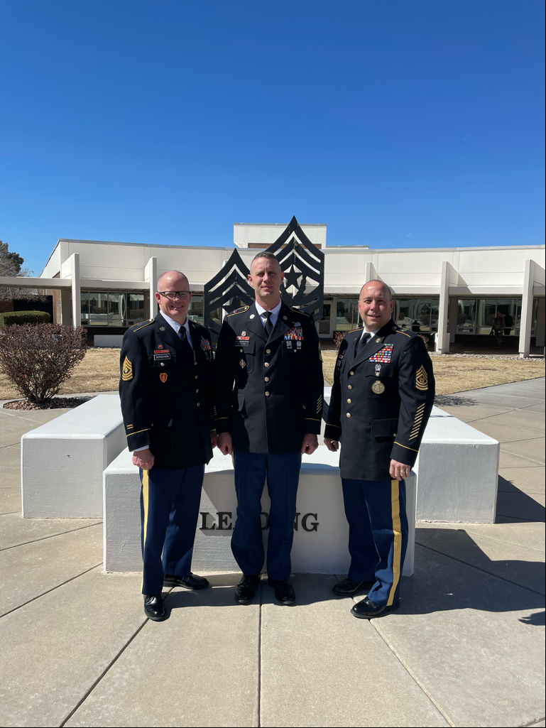 Left to right, 1st Sgt. Bradley Bergeron, 164th Regional Training Institute; Master Sgt. Brock Klettke, 164th Regional Training Institute; and Command Sgt. Maj. Jeffrey Sayler, N.D. Army National Guard Recruiting and Retention Battalion, at the U.S. Army Sergeants Major Academy, Fort Bliss, Texas, Feb. 23, 2023.