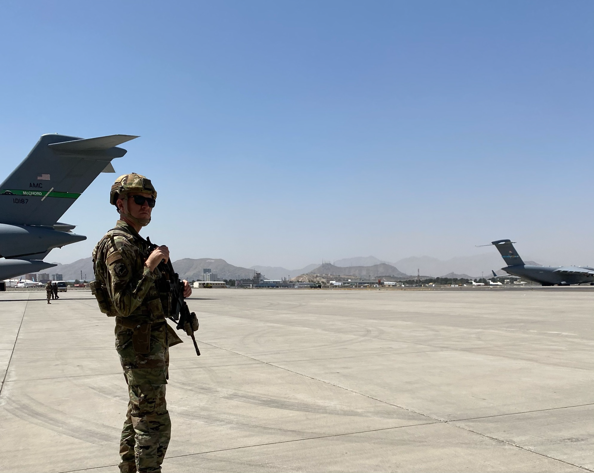 Staff Sgt. Thomas McAndrews, 119th Security Forces Squadron/816th Expeditionary Airlift Squadron, standing watch during Operation Allies Refuge, August 2021, Hamid Karazai International Airport Kabul, Afghanistan. (Photo courtesy of Sgt. McAndrews)