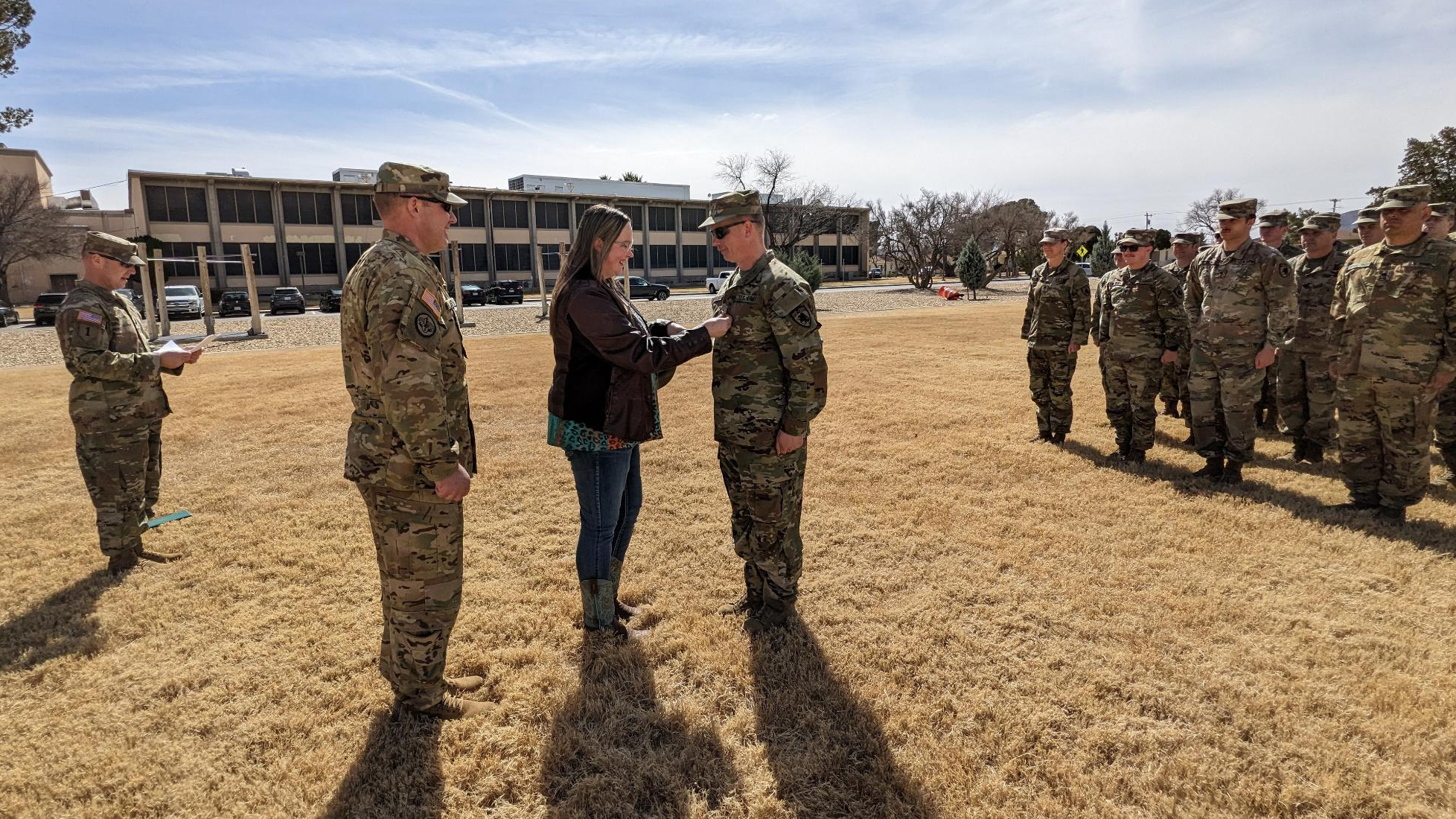 Andrew Stroklund, 1st Battalion, 112th Aviation Regiment (1-112th AVN), was promoted to Chief Warrant Officer 3, in a ceremony presided over by Lt. Col. Russ Sundby, 1-112th AVN commander, Feb. 17, 2023, El Paso, Texas. (National Guard story and photo by Sgt. Michaela C.P. Granger, 1-112th AVN)