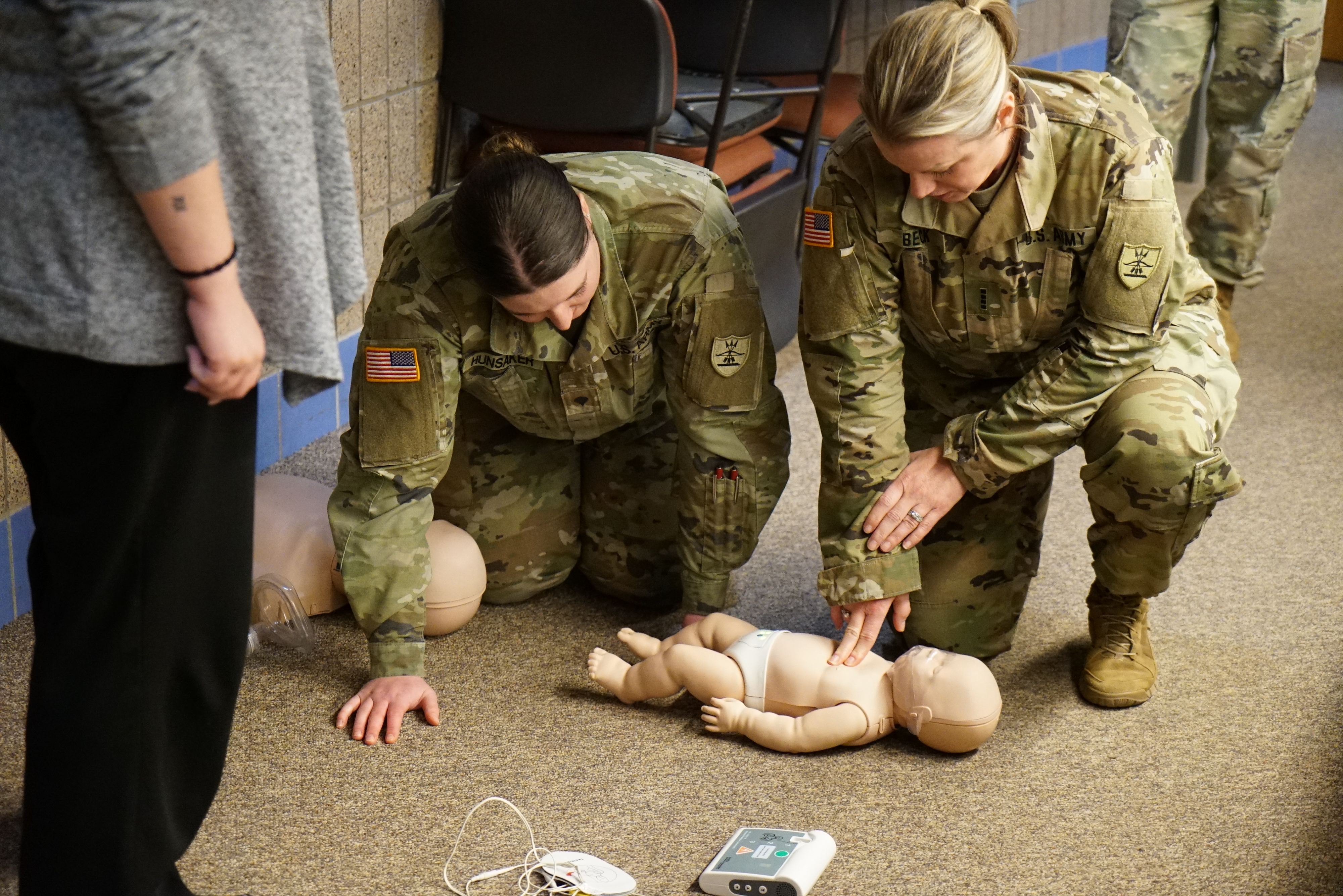 Chief Warrant Officer 4 Kerry Beck, Joint Force Headquaters, right, and Spc. Amber Hunsaker, 131st Military Police Battalion, practice infant cardiopulmonary resuscitation (CPR) at the Raymond J. Bohn armory, Bismarck, N.D., Feb. 22, 2023.