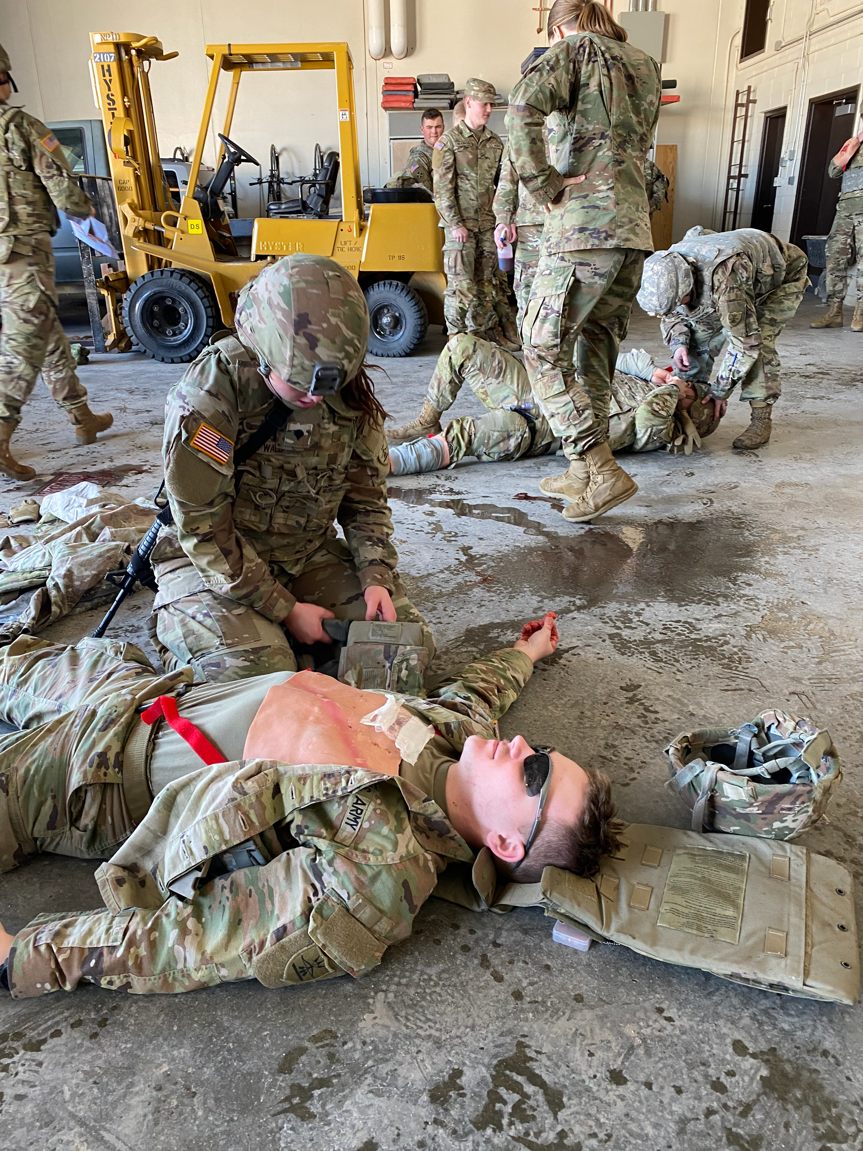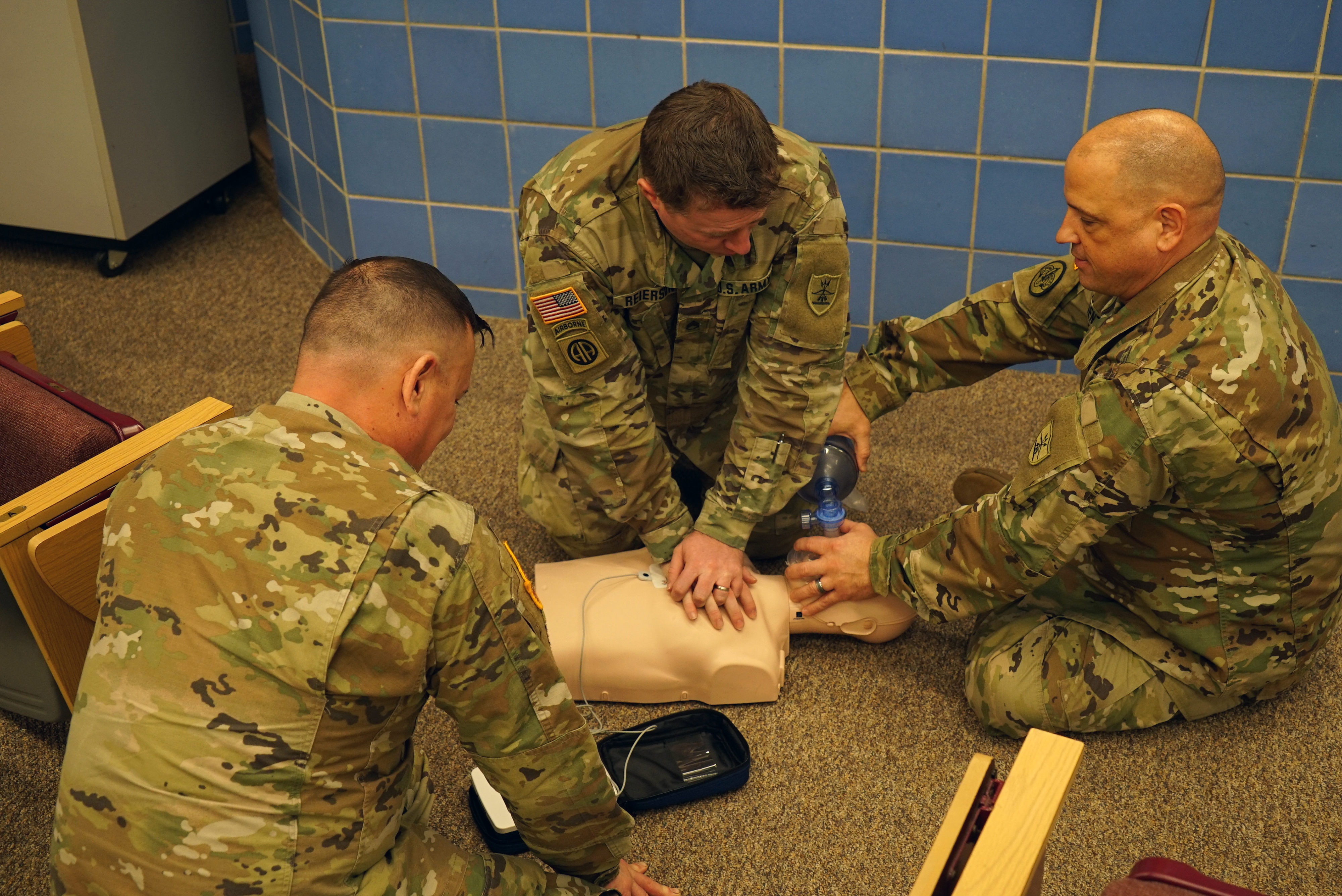 Left to right, Sgt. First Class Derek Delorme, Staff Sgt. Nathan Reierson, Joint Force Headquarters, and Sgt. First Class Brett Gentile, N.D. Army National Guard Recruiting and Retention Battalion, practice working together as a team during a lifesaving class at the Raymond J. Bohn armory, Bismarck, N.D., Feb. 22, 2023.
