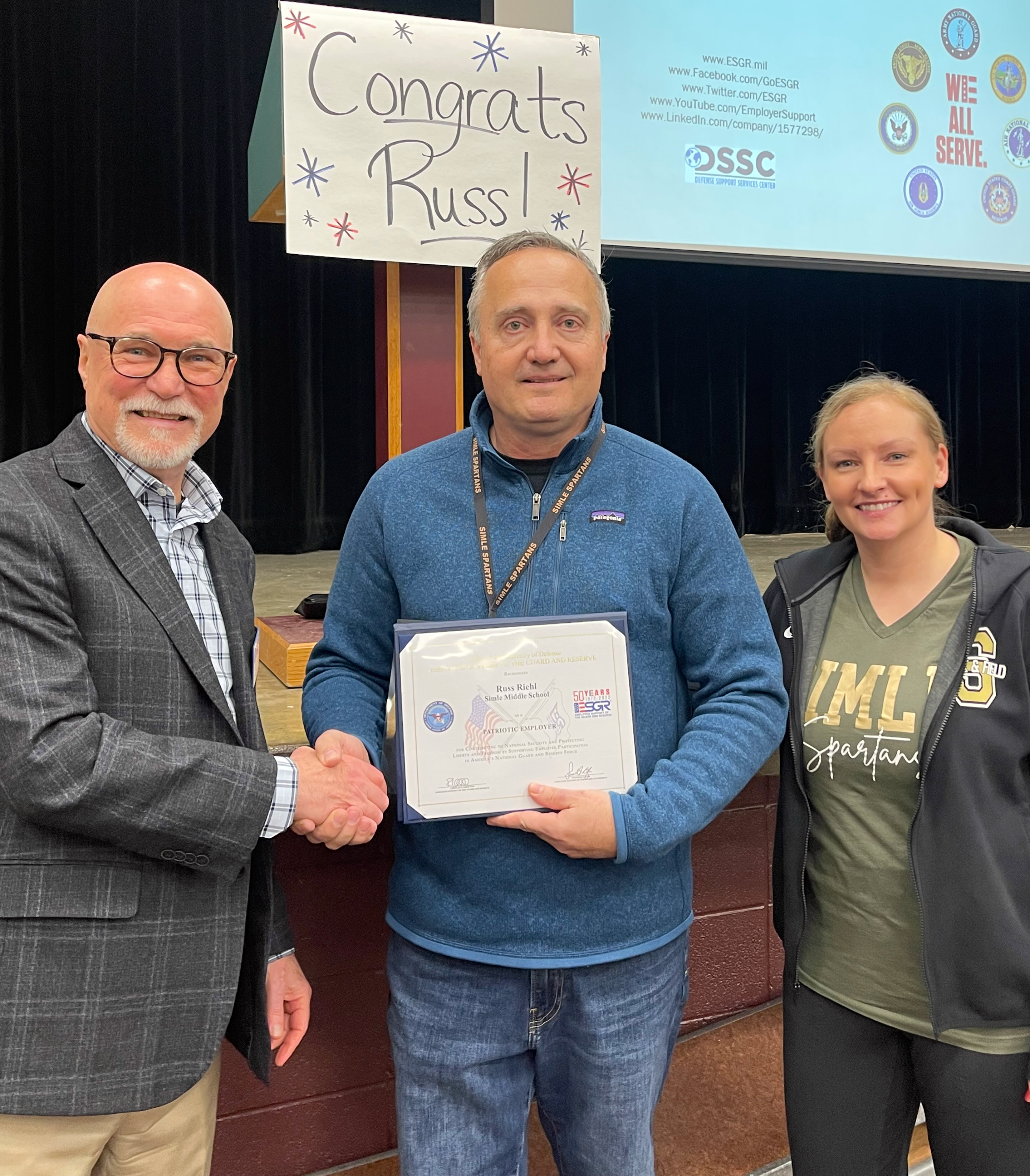 Bismarck Simle Middle School Principal Russ Riehl, center, is congratulated by Rob Keller, ESGR public information officer, on the reciept of his second Patriot Award, Feb. 21, 2023, Bismarck, N.D. Maj. Kalli Swenson, right, a teacher at Simle, nominated Riehl both times for his support of her National Guard service.