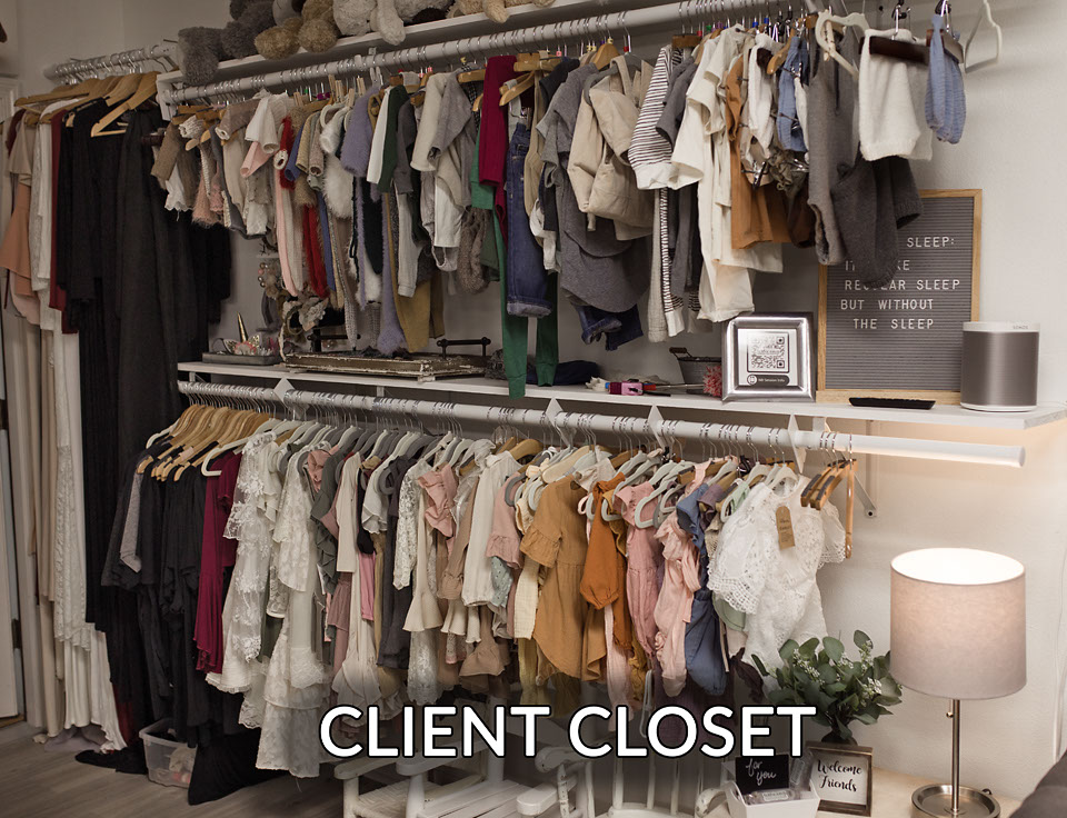 - Client closet for siblings with many dresses and outfits