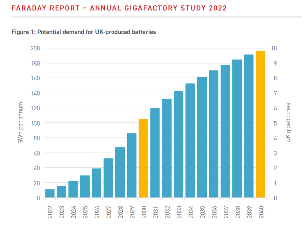 The UK's demand for gigafactories, which are large-scale battery manufacturing facilities, is rapidly increasing due to the growth of the electric vehicle (EV) market. Estimates suggest the UK will need the equivalent of six gigafactories (20 GWh capacity each) by 2030 and potentially ten by 2040 to meet battery demand