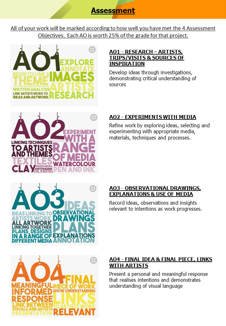 - 60% Portfolio Work - Controlled Assessment comprising of two themes 40% Externally Set Task – 10 hour practical exam.