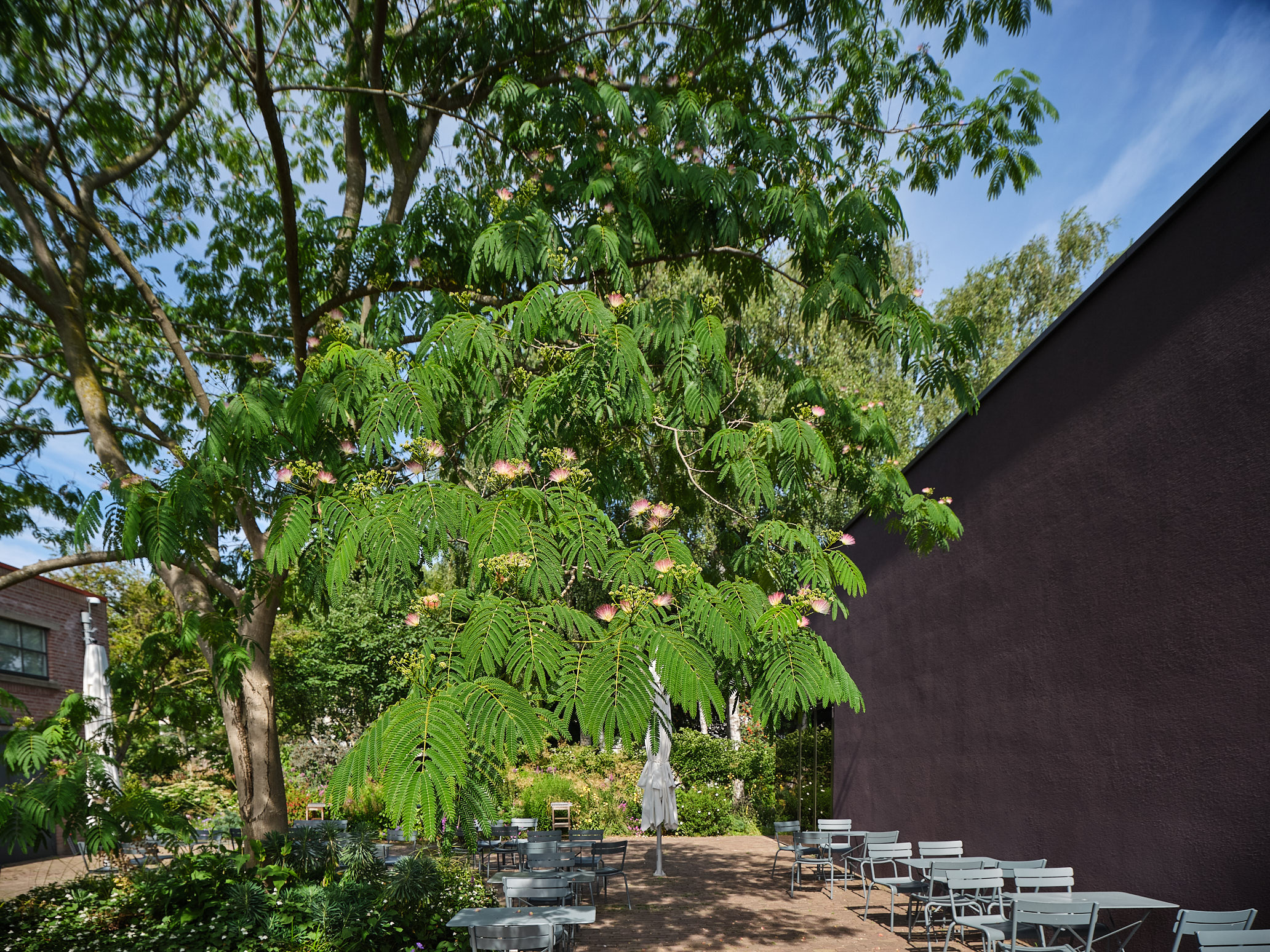 Met blaadjes die lijken op veren en roze, pluimachtige bloemen, is de Perzische slaapboom Albizia een van de mooiste bomen van de museumtuin. Deze van oorsprong tropische soort staat op een beschutte plek en bloeit jaarlijks van juli tot september. De blaadjes vouwen zich open en dicht met het opkomen en ondergaan van de zon. Hieraan ontleent de boom zijn tot de verbeelding sprekende naam.
