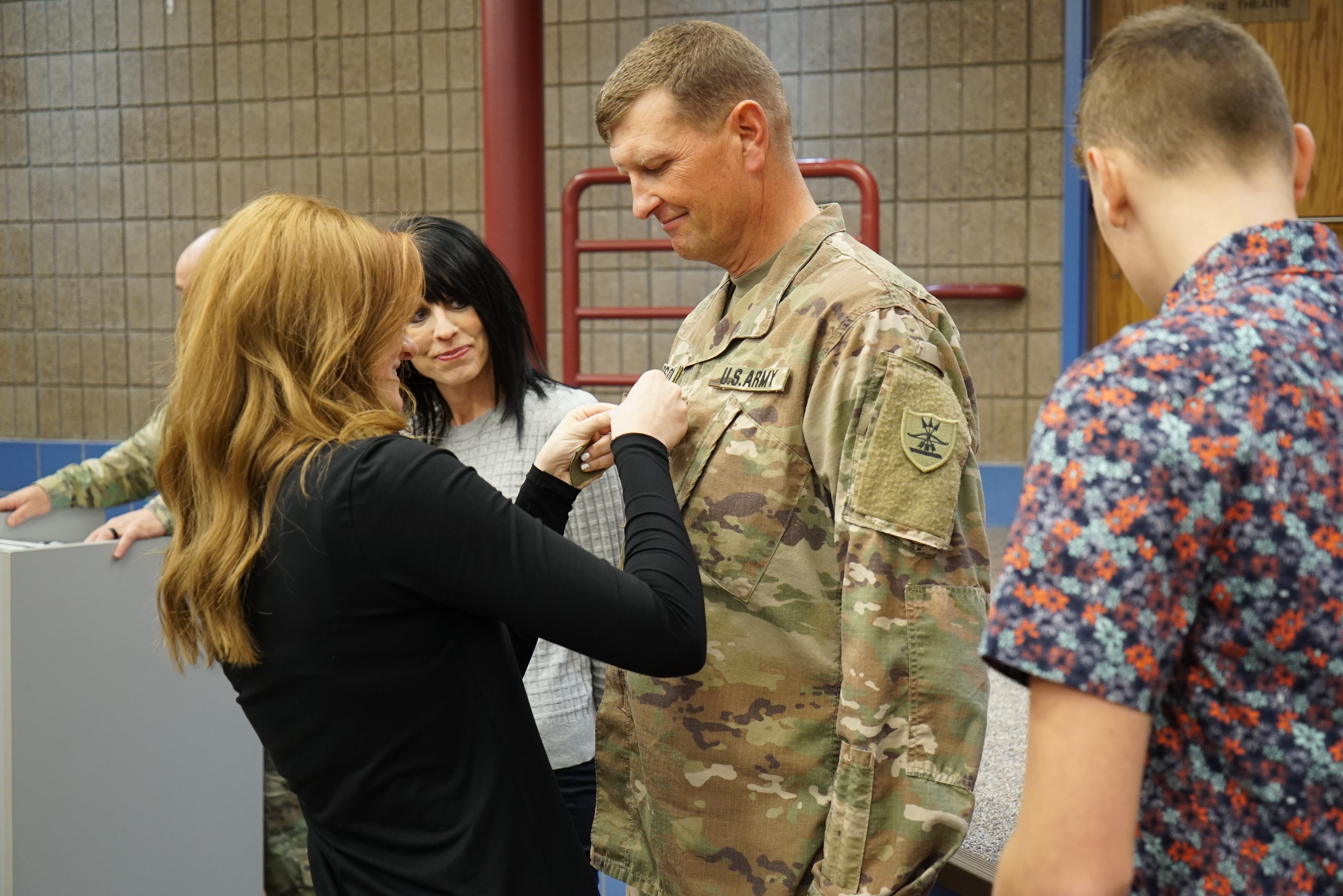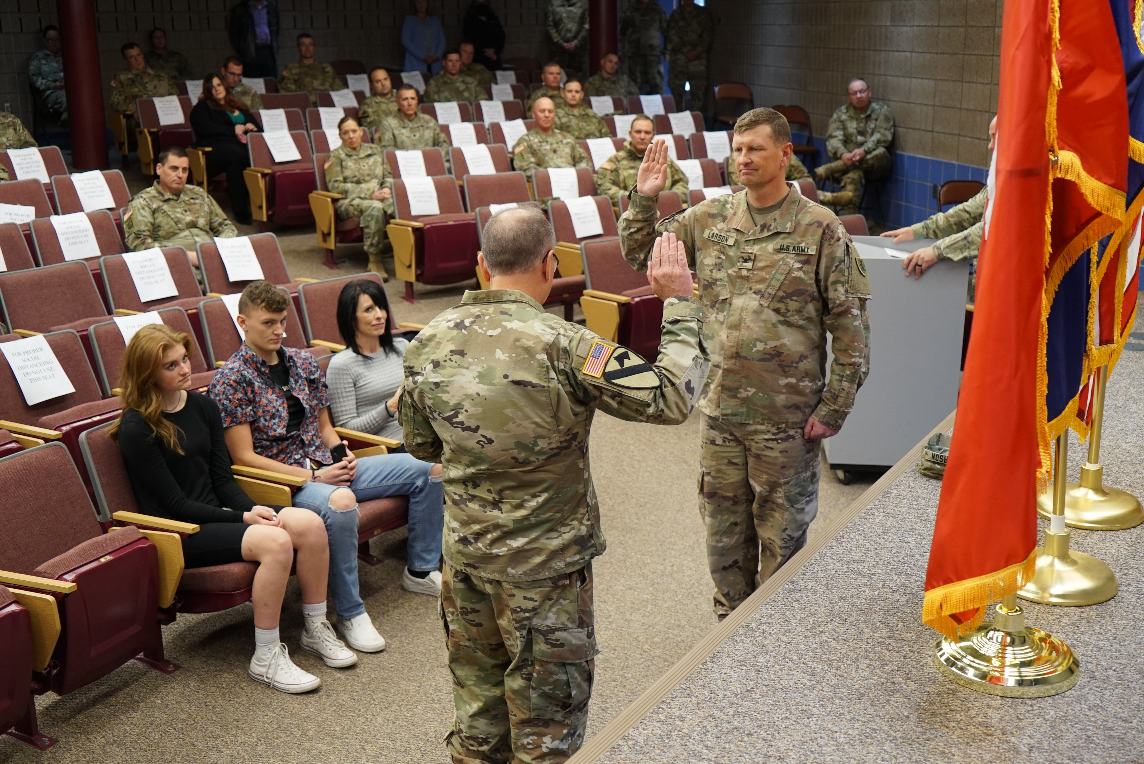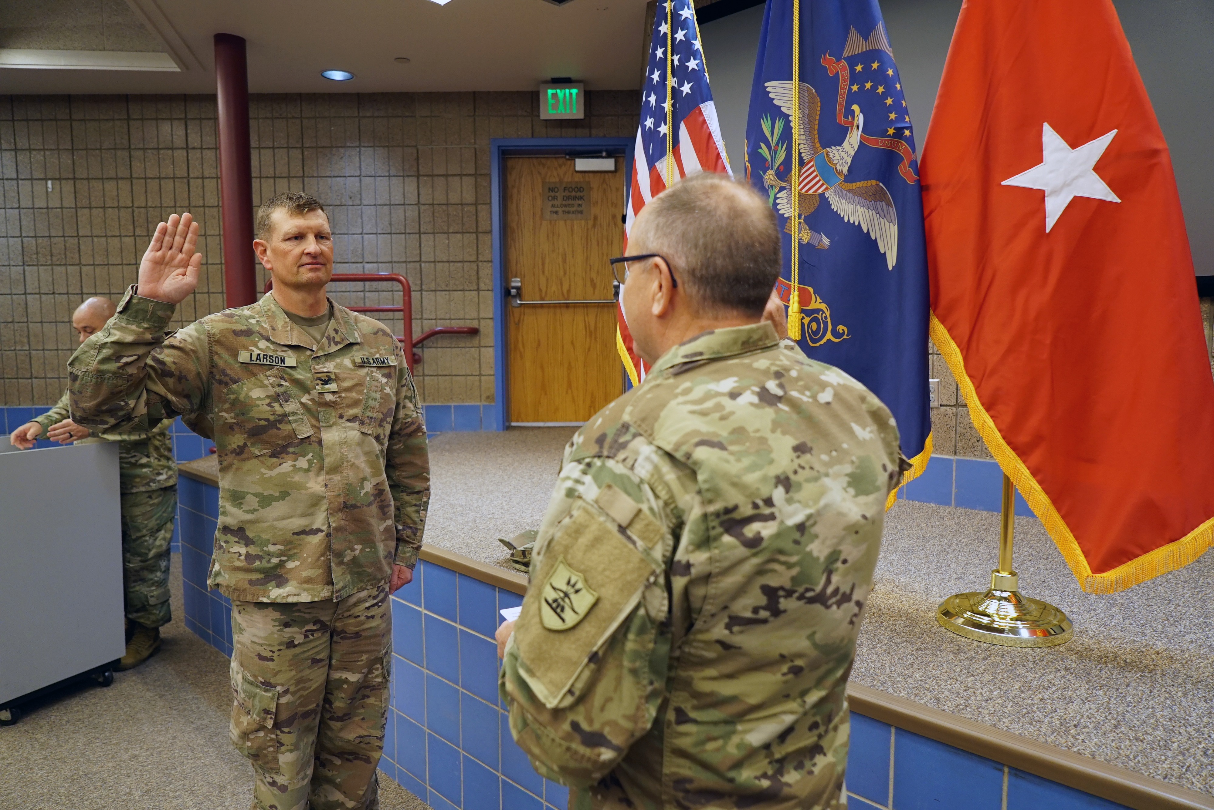 The commander of the N.D. National Guard's 68th Troop Command Brock Larson was promoted to colonel at the Raymond J. Bohn in Bismarck on Oct. 14, 2020. Larson also serves as the full-time director of J-5/9 Plans and Policies in the Joint Force Headquarters. (U.S. National Guard story and photos by Sgt. 1st Class Charles Highland, N.D. National Guard Public Affairs)