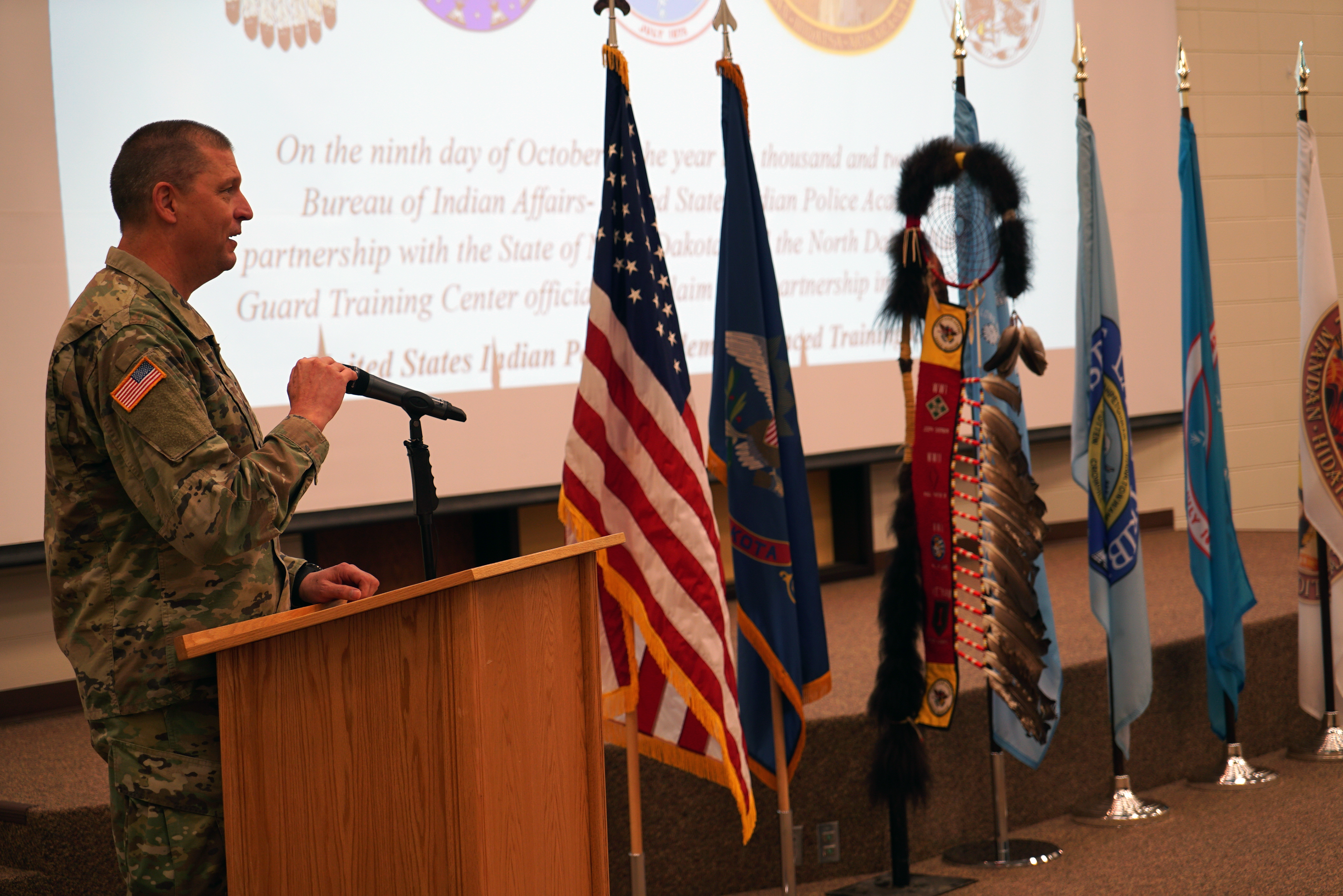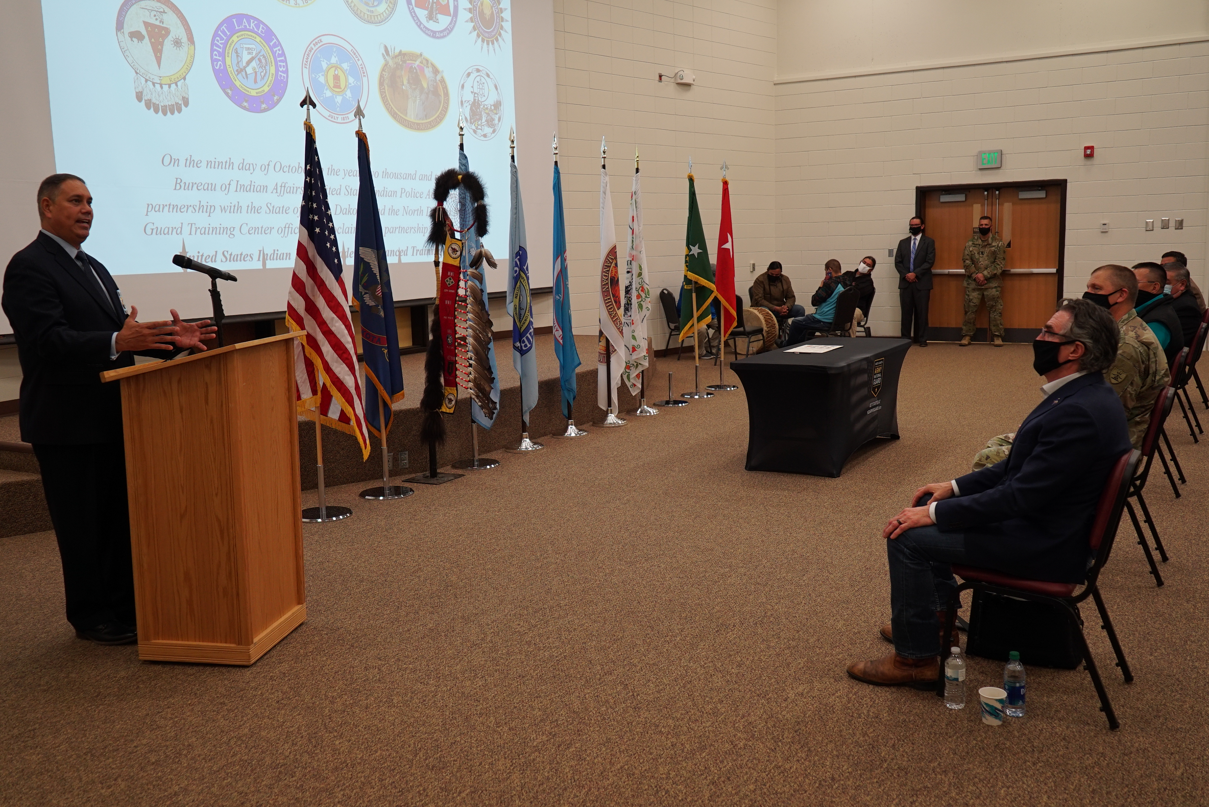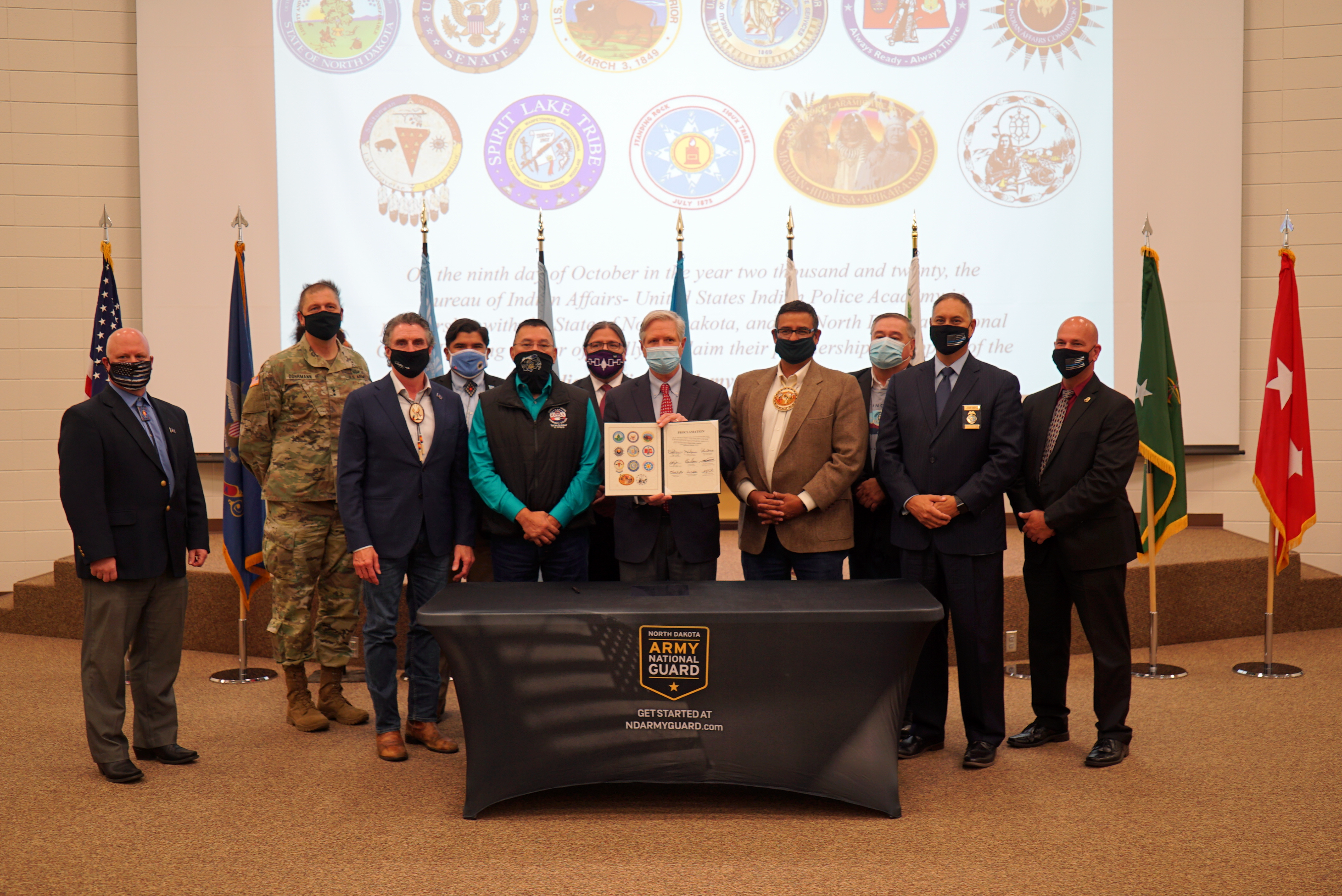 Maj. Gen. Alan Dohrmann, N.D. National Guard adjutant general, hosted Gov. Doug Burgum, U.S. Sen. John Hoeven, Bureau of Indian Affairs (BIA) Office of Justice Services Director Charles Addington, N.D. Indian Affairs Commission Executive Director Scott Davis, U.S. Indian Police Academy Director Steven Juneau, Tribal Nation representatives and other officials at Camp Grafton Training Center (CGTC) on Oct. 9, 2020. Those present participated in a proclamation ceremony celebrating the partnership between the Bureau of Indian Affairs - U.S. Indian Police Academy, the State of North Dakota, and the N.D. National Guard. The proclamation also included the Sisseton Wahpeton Oyate Nation, Spirit Lake Nation, Standing Rock Sioux Tribe, Three Affiliated - MHA Nation, and the Turtle Mountain Band of Chippewa. Specifically, the partnership will allow the BIA to conduct classes for its law enforcement officers at CGTC and is in keeping with strengthening the governor's Tribal Partnerships initiative. For more information please see "Burgum applauds opening of new U.S. Indian Police Academy to address law enforcement needs."