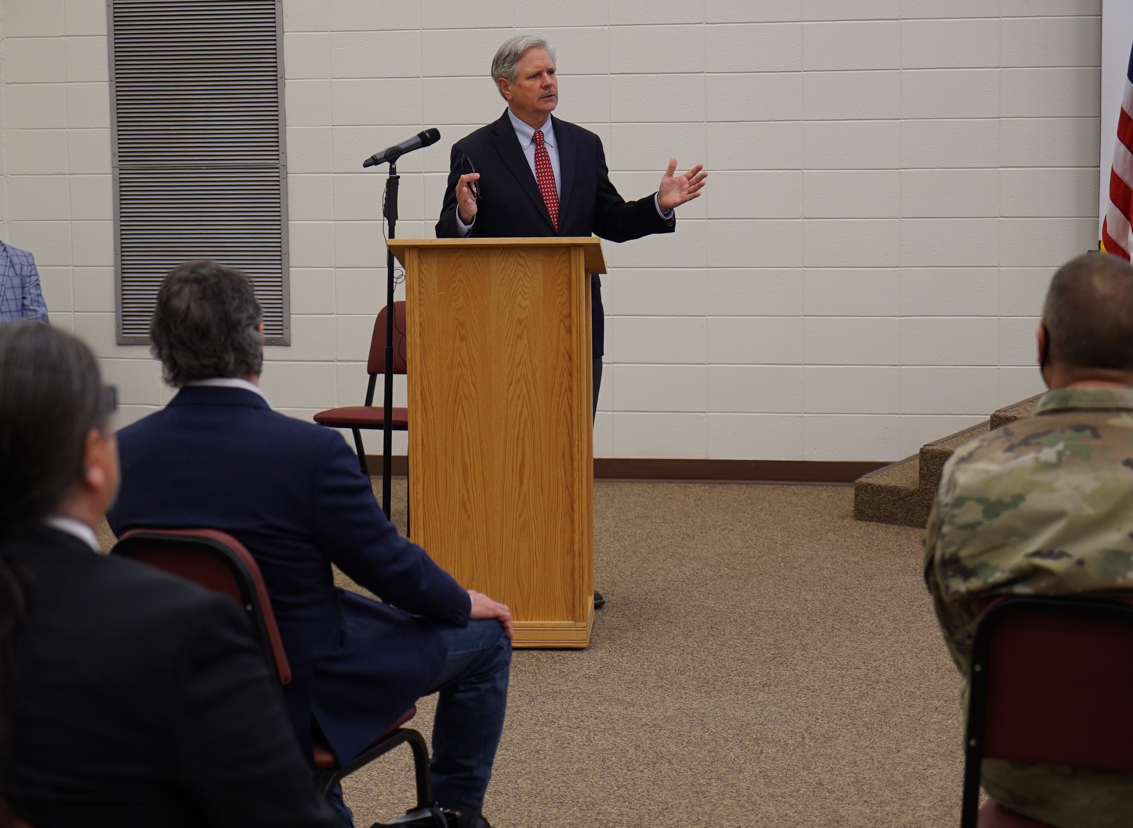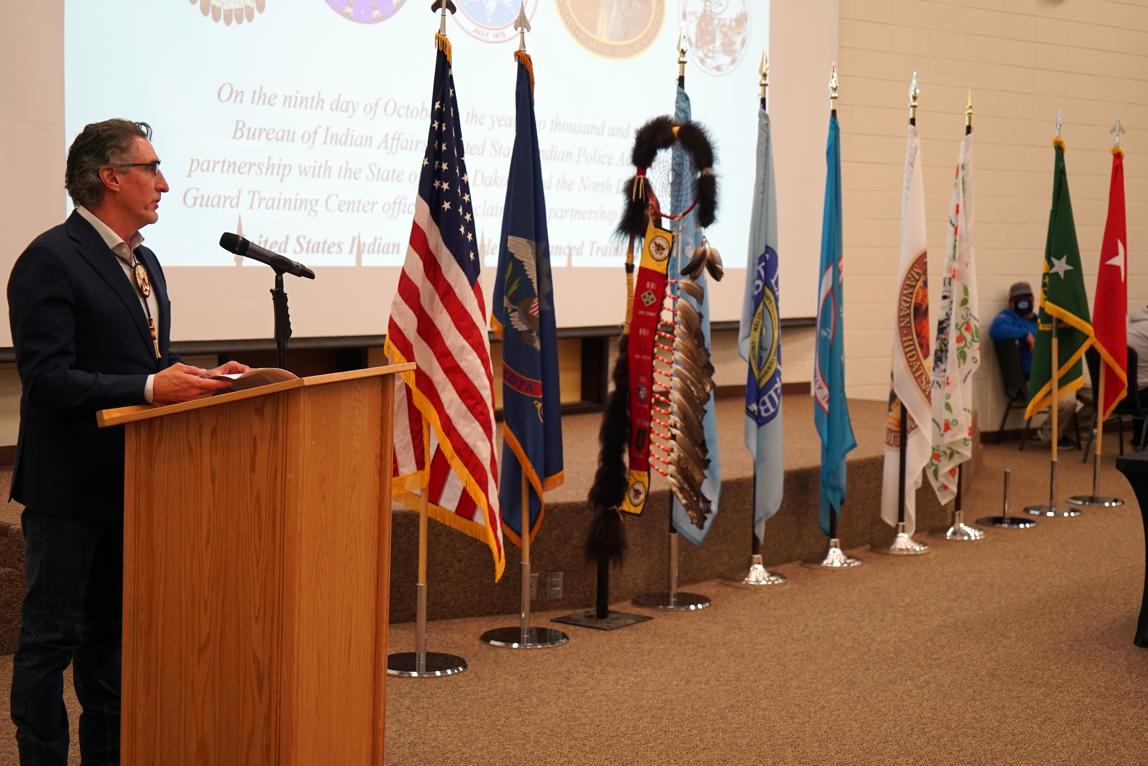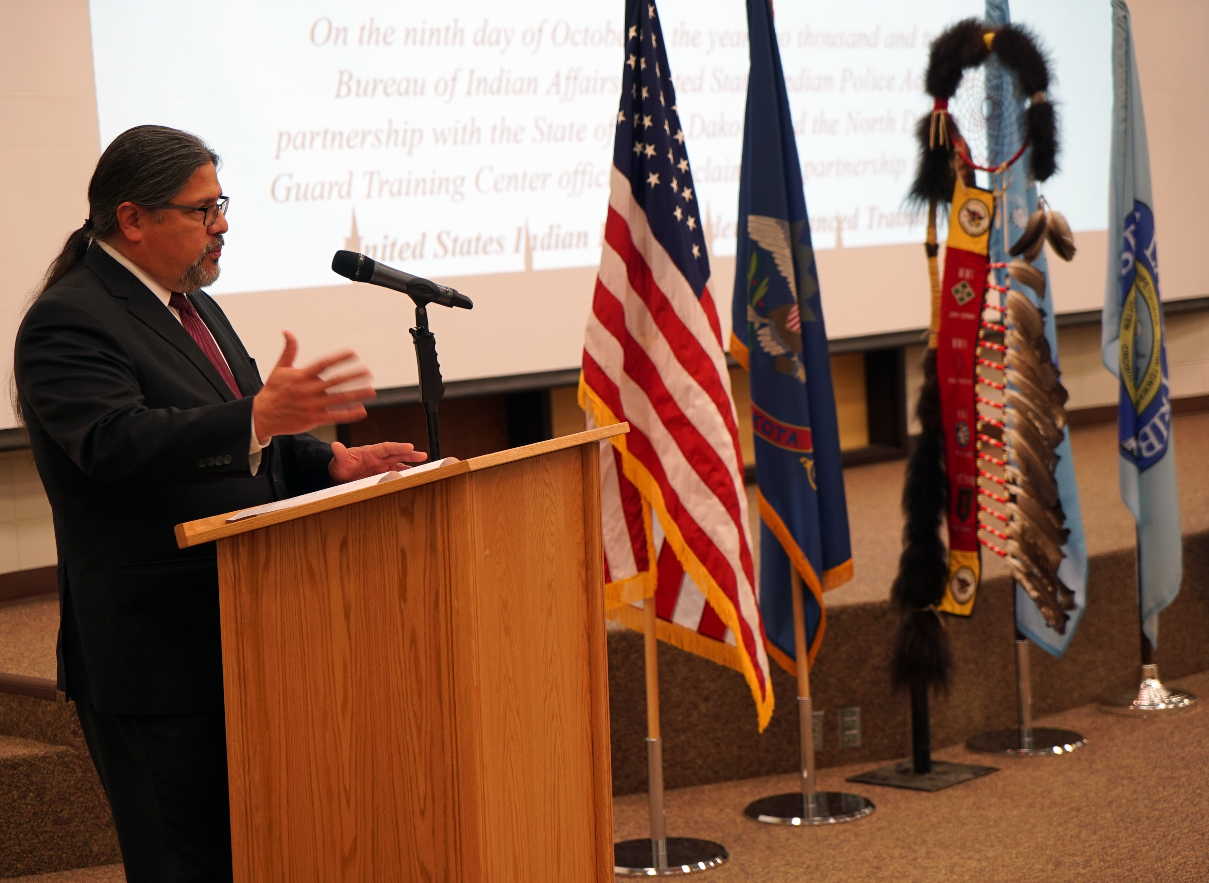 Maj. Gen. Alan Dohrmann, N.D. National Guard adjutant general, hosted Gov. Doug Burgum, U.S. Sen. John Hoeven, Bureau of Indian Affairs (BIA) Office of Justice Services Director Charles Addington, N.D. Indian Affairs Commission Executive Director Scott Davis, U.S. Indian Police Academy Director Steven Juneau, Tribal Nation representatives and other officials at Camp Grafton Training Center (CGTC) on Oct. 9, 2020. Those present participated in a proclamation ceremony celebrating the partnership between the Bureau of Indian Affairs - U.S. Indian Police Academy, the State of North Dakota, and the N.D. National Guard. The proclamation also included the Sisseton Wahpeton Oyate Nation, Spirit Lake Nation, Standing Rock Sioux Tribe, Three Affiliated - MHA Nation, and the Turtle Mountain Band of Chippewa. Specifically, the partnership will allow the BIA to conduct classes for its law enforcement officers at CGTC and is in keeping with strengthening the governor's Tribal Partnerships initiative. For more information please see "Burgum applauds opening of new U.S. Indian Police Academy to address law enforcement needs."