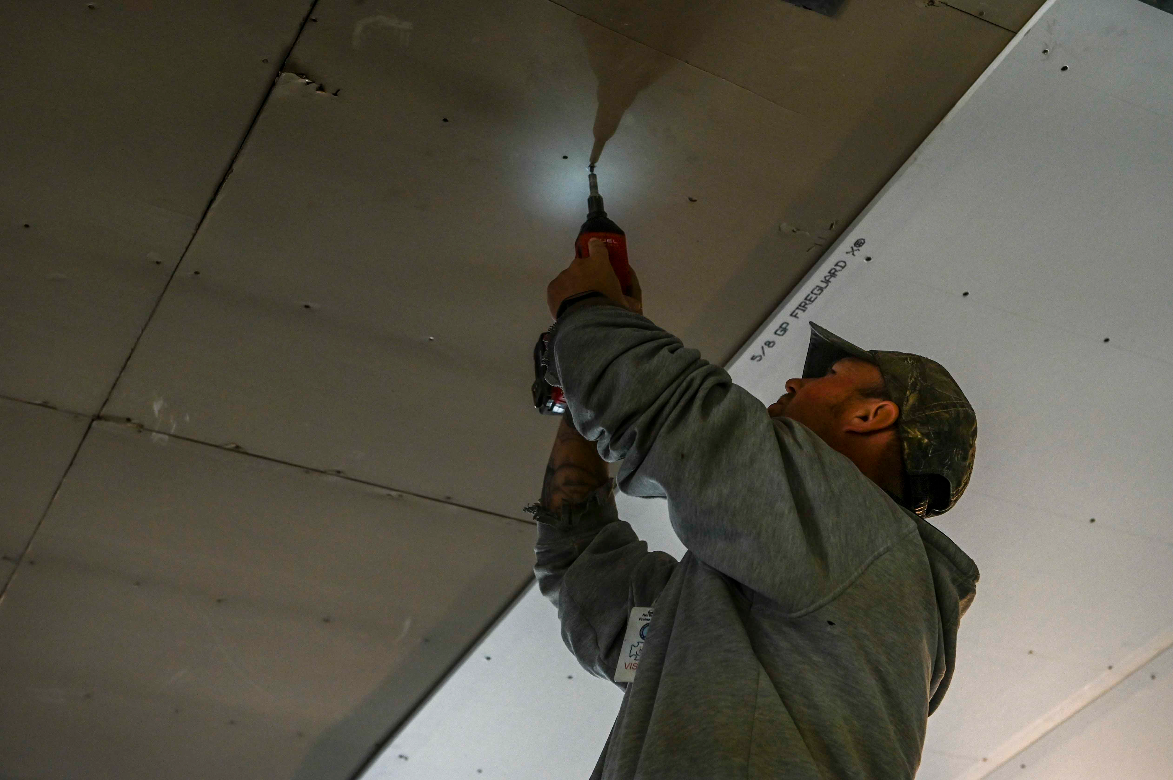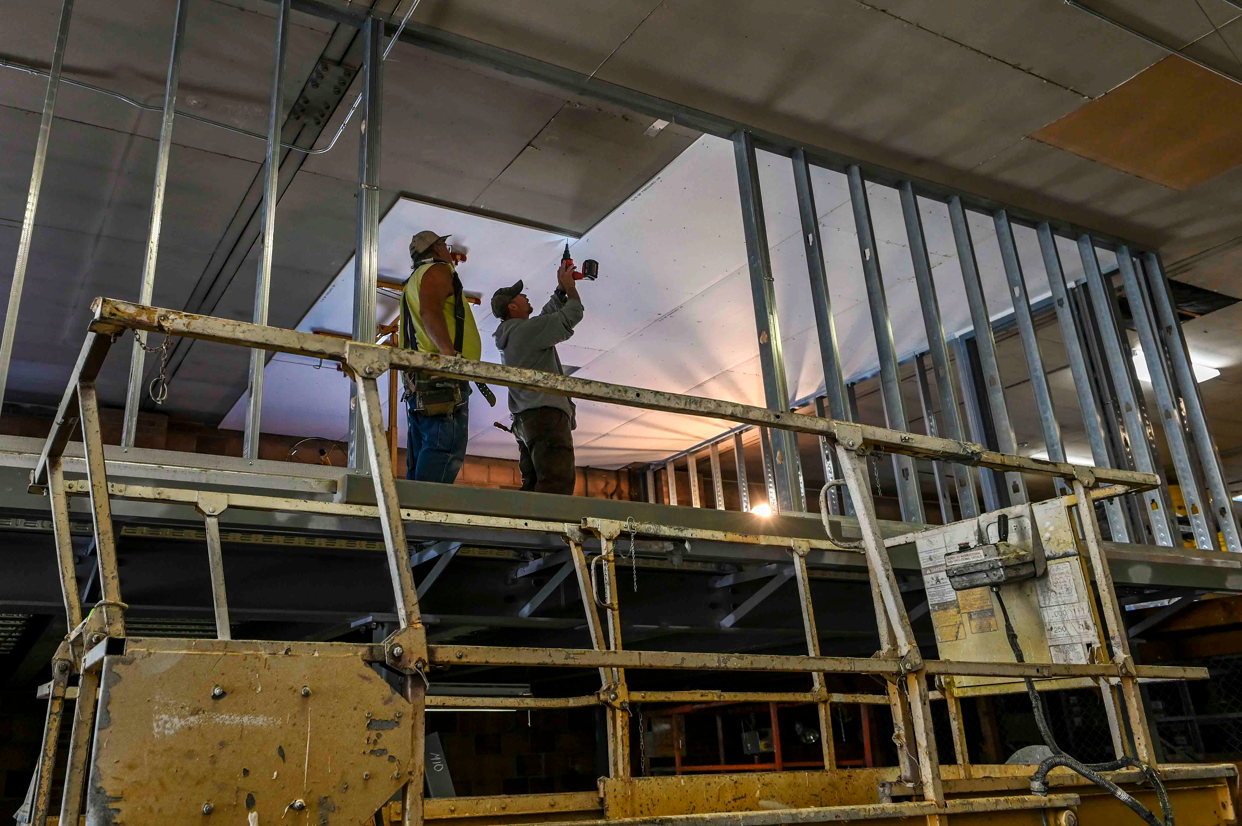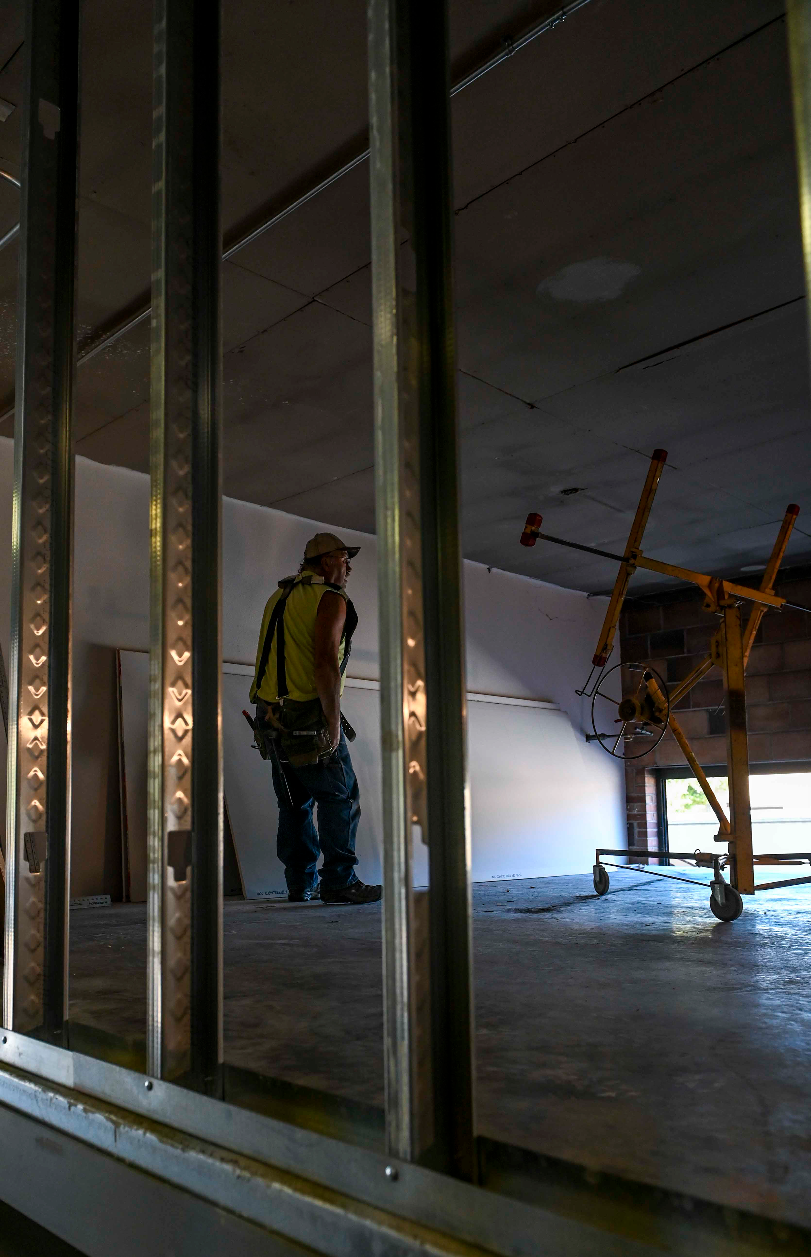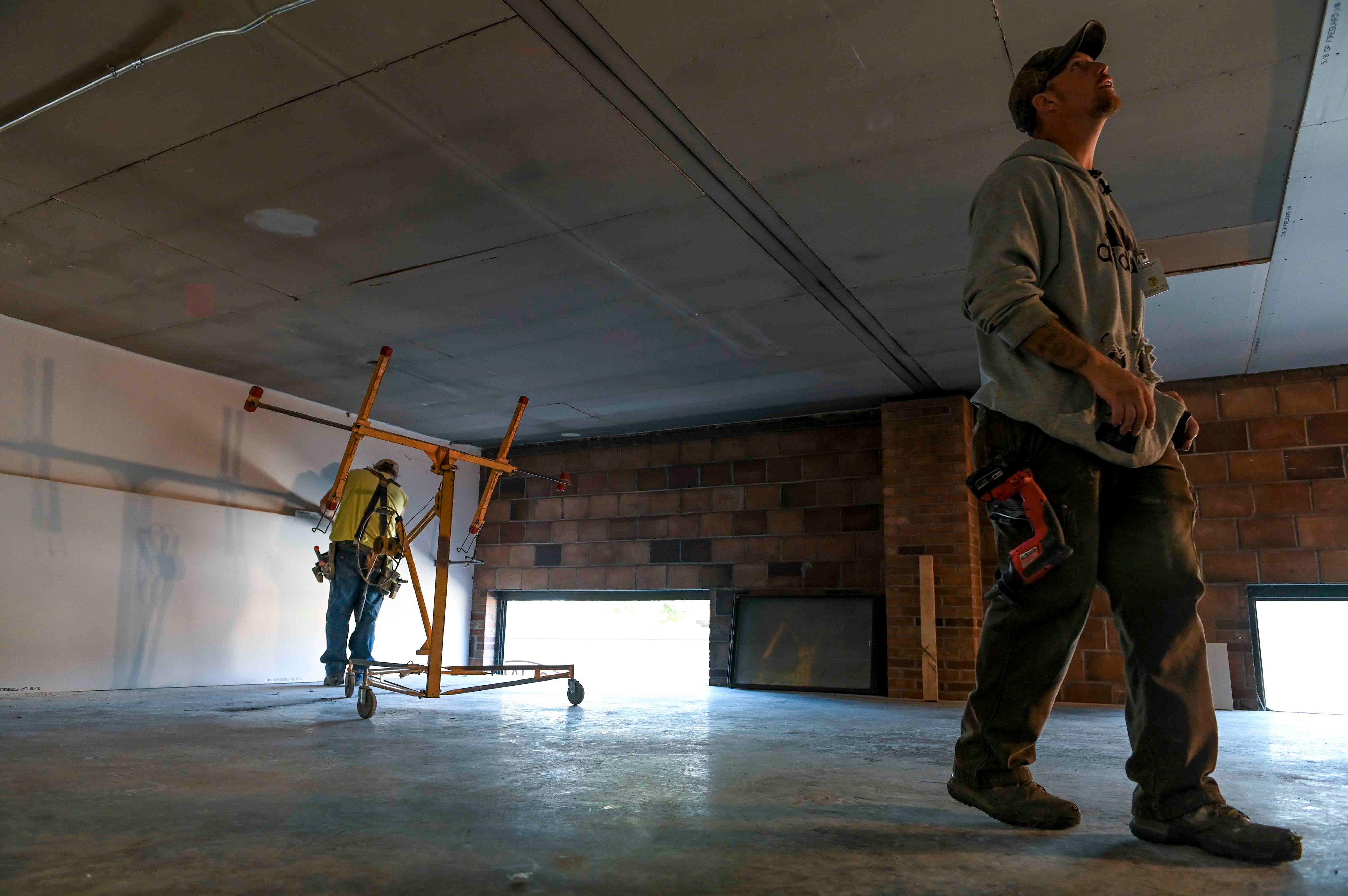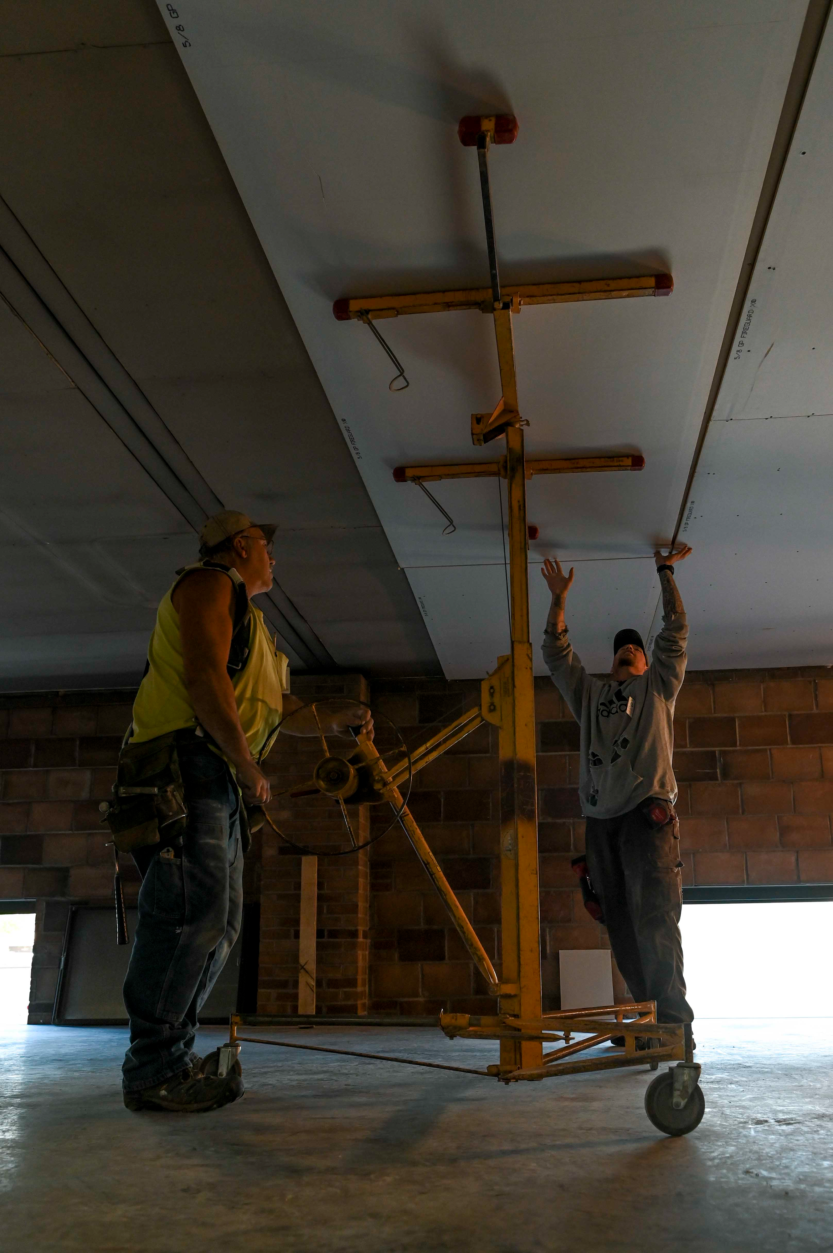 Bill Kukuk (left) and Mike Kopp of Capital City Construction install sheet rock in the new records storage area being built inside building 280 at Fraine Barracks, in Bismarck, N.D., on Aug. 10, 2020.
