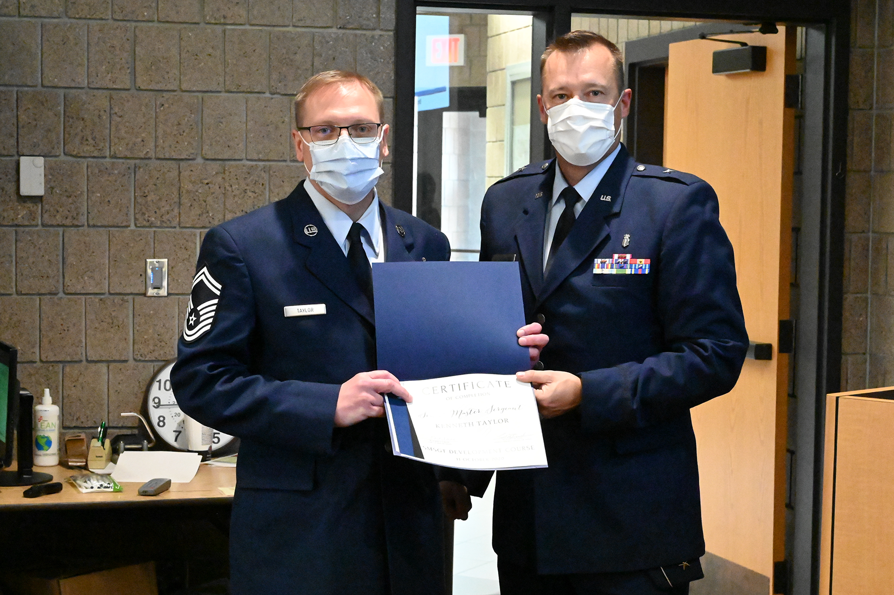 Senior Master Sergeant Ken Taylor, 119th Operations Group, receives a certificate of completion for the Senior Master Sergeant Development Course on Oct. 11, 2020.