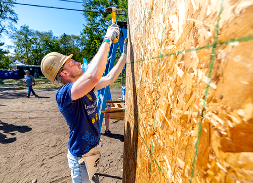 On Wednesday, September 18, 2024, a dozen Hesburgh Libraries faculty and staff members joined volunteers from across the University of Notre Dame as part of a week-long Habitat for Humanity build. A culmination of the events surrounding the inauguration of the University’s 18th president, Rev. Robert A. Dowd, C.S.C., volunteers worked to erect five homes on the 700 block of Harrison Ave. on South Bend’s near northwest side. The homes are expected to be ready in the spring.