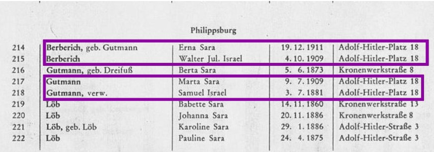 Zurück zu den Namen auf dem Grabstein. Die beiden Todesdaten von Walter Berberich und Marta Gutmann - 1942 - deuten darauf hin , dass sie Opfer der Verfolgung während der Zeit des Nationalsozialismus wurden. Gelingt es Nähres über die Familie zu erfahren? Was geschah mit Marta und Walter? Und welches Schicksal hatte Samuel Gutmann, der 1961 verstarb?