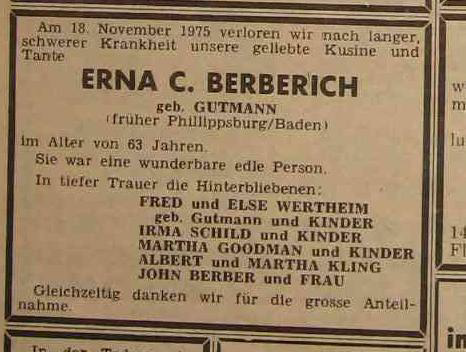 Während Walter Julius Berberich und seine Schwägerin Marta umgekommen sind, haben Samuel Gutmann und seine Tochter Erna (die Ehefrau von Walter Julius Berberich) überlebt; sie wanderten von Frankreich 1946 in die USA aus.