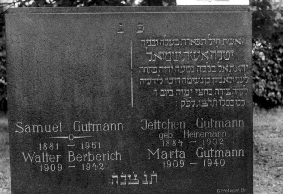 Auf diesem Grabstein der Familie Gutmann sind mehrere Personen benannt. Samuel und Jettchen Gutmann, sowie Marta Gutmann und Walter Berberich.