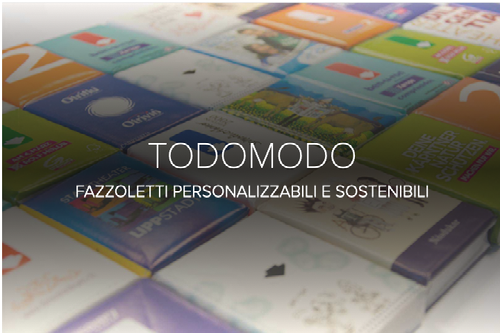 TodoModo, il fazzoletto dall'involucro in carta completamente personalizzabile, si propone per offrire un'occasione in più per veicolare e diffondere in modo rapido e simpatico il brand dei vostri clienti.