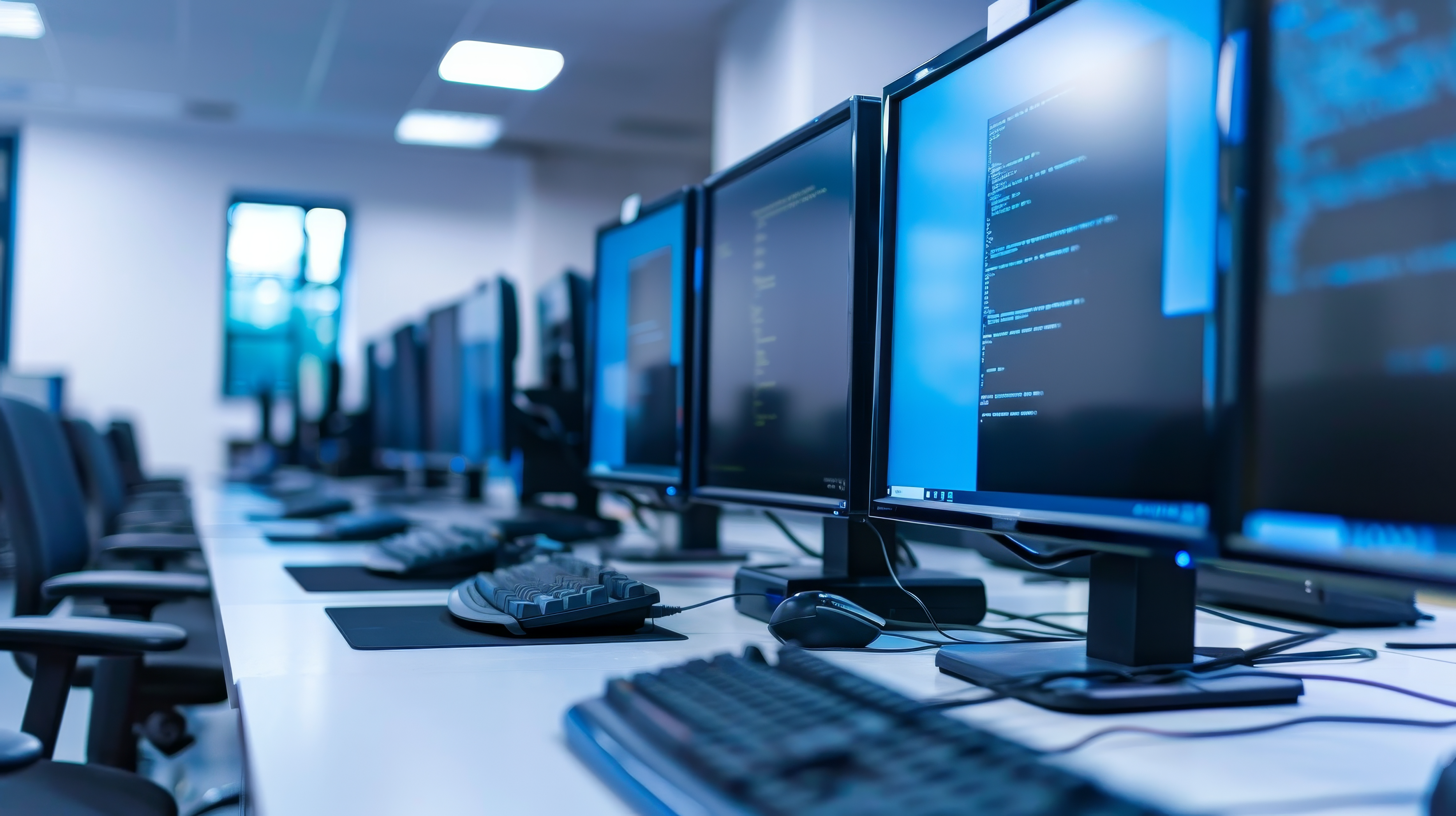 Created with an image by Paul - "Close-up of a high-tech computer lab, rows of monitors and computers arranged for digital learning, modern education environment"