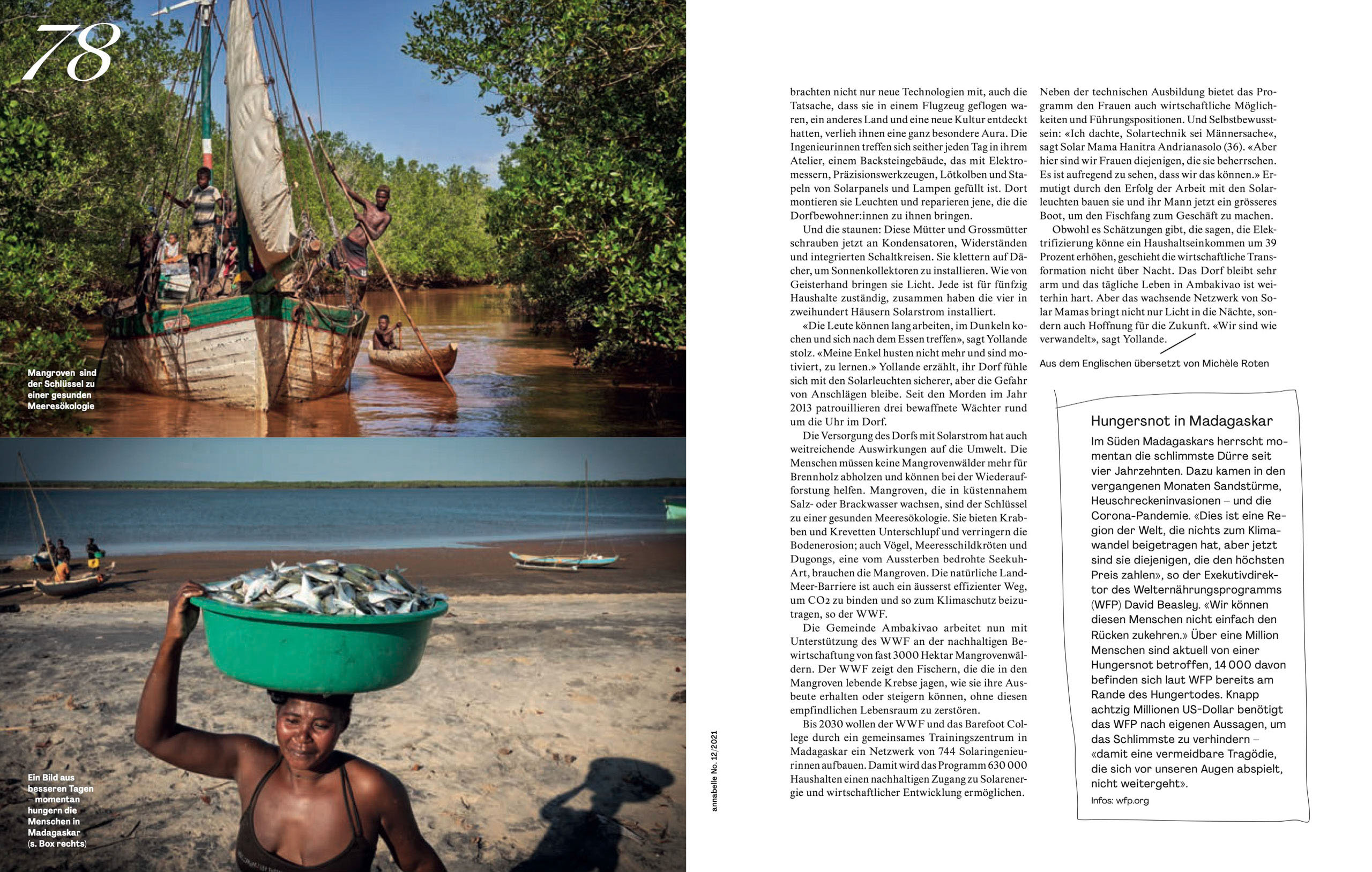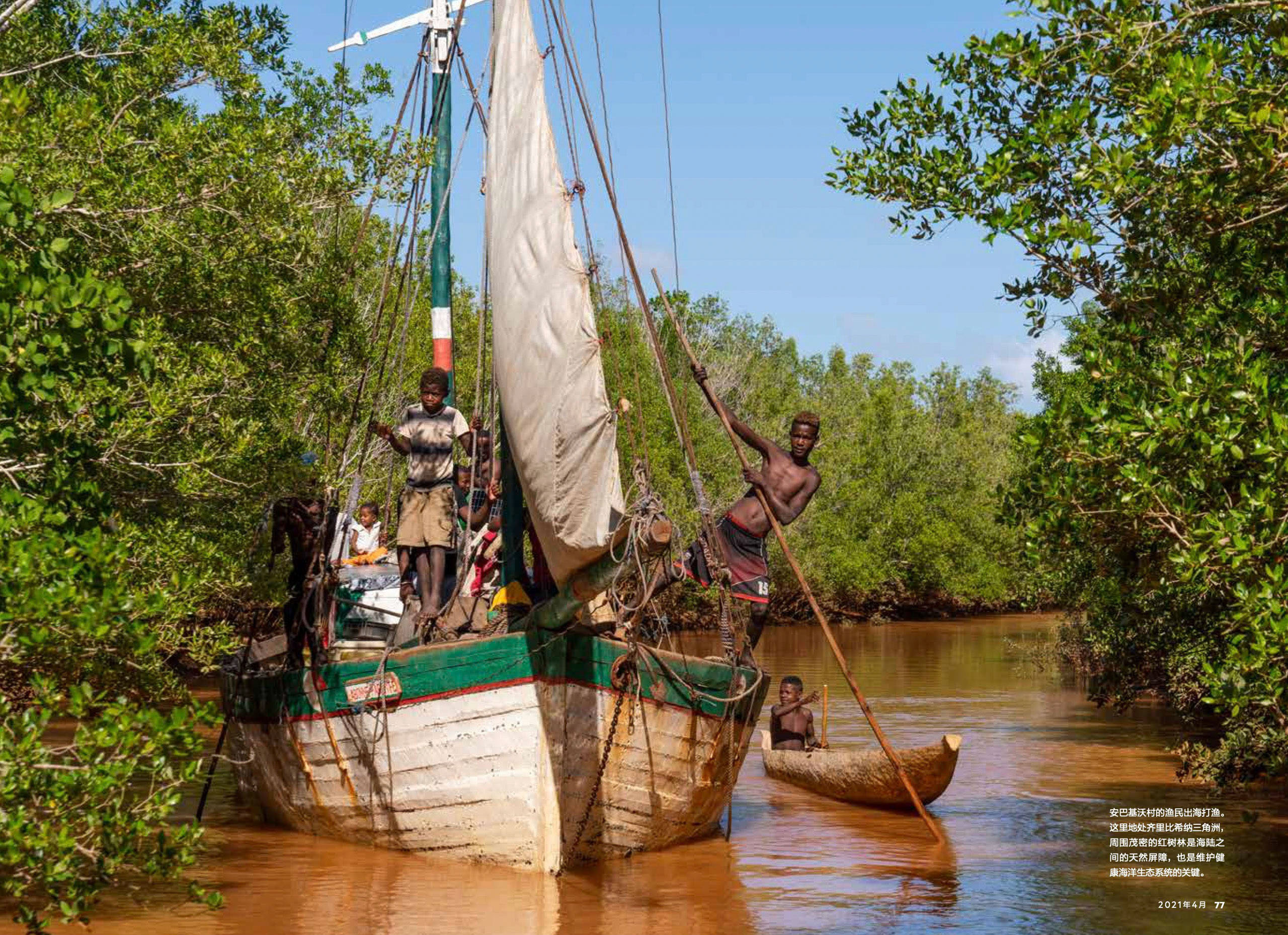 Madagascar is one of the world's most bio-diverse countries. Yet the lack of electricity is forcing people to cut wood for fire, destroying mangroves that are critical barriers between land and sea. Here people are navigating a mangrove stream to head out to the sea.