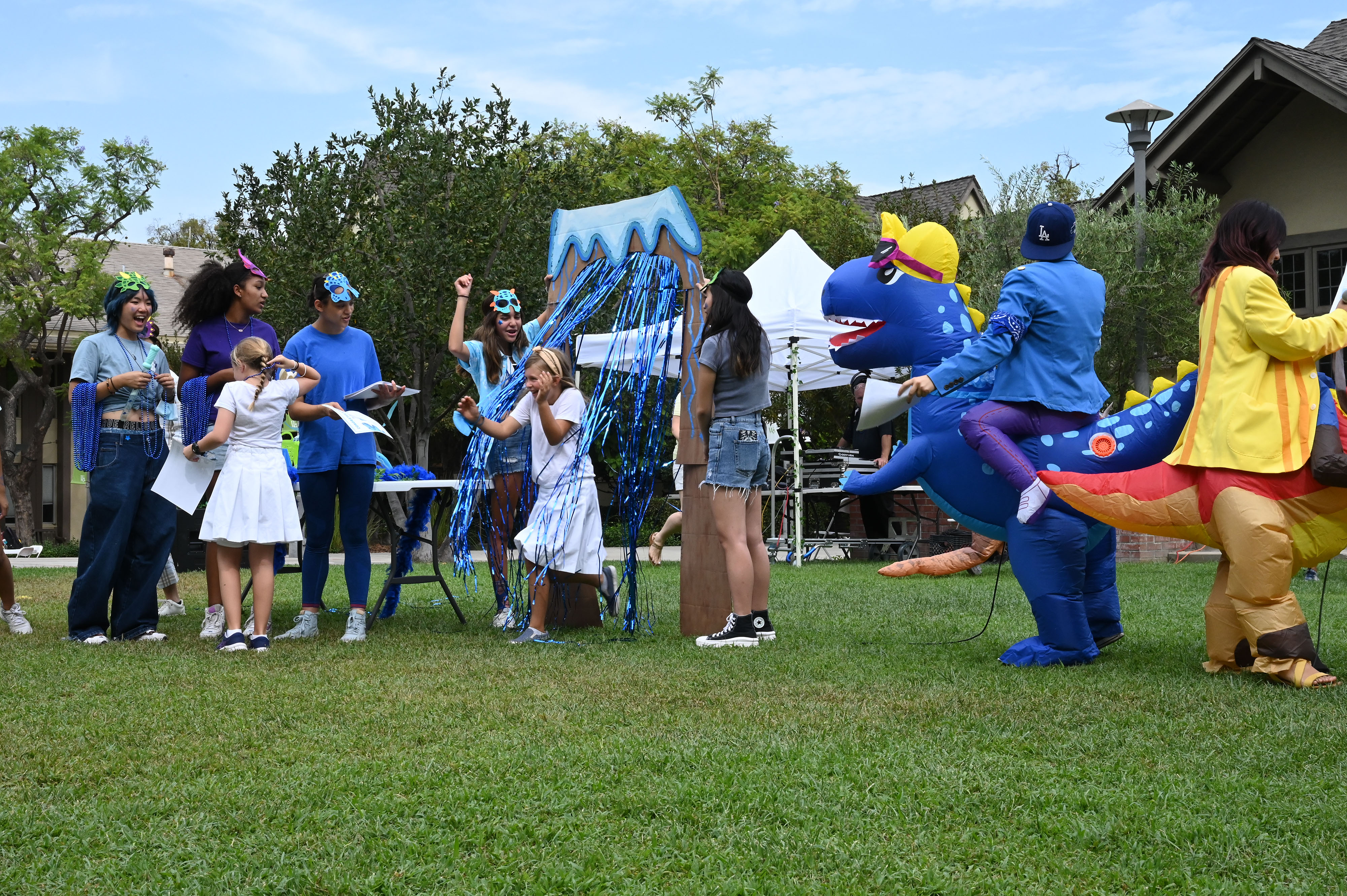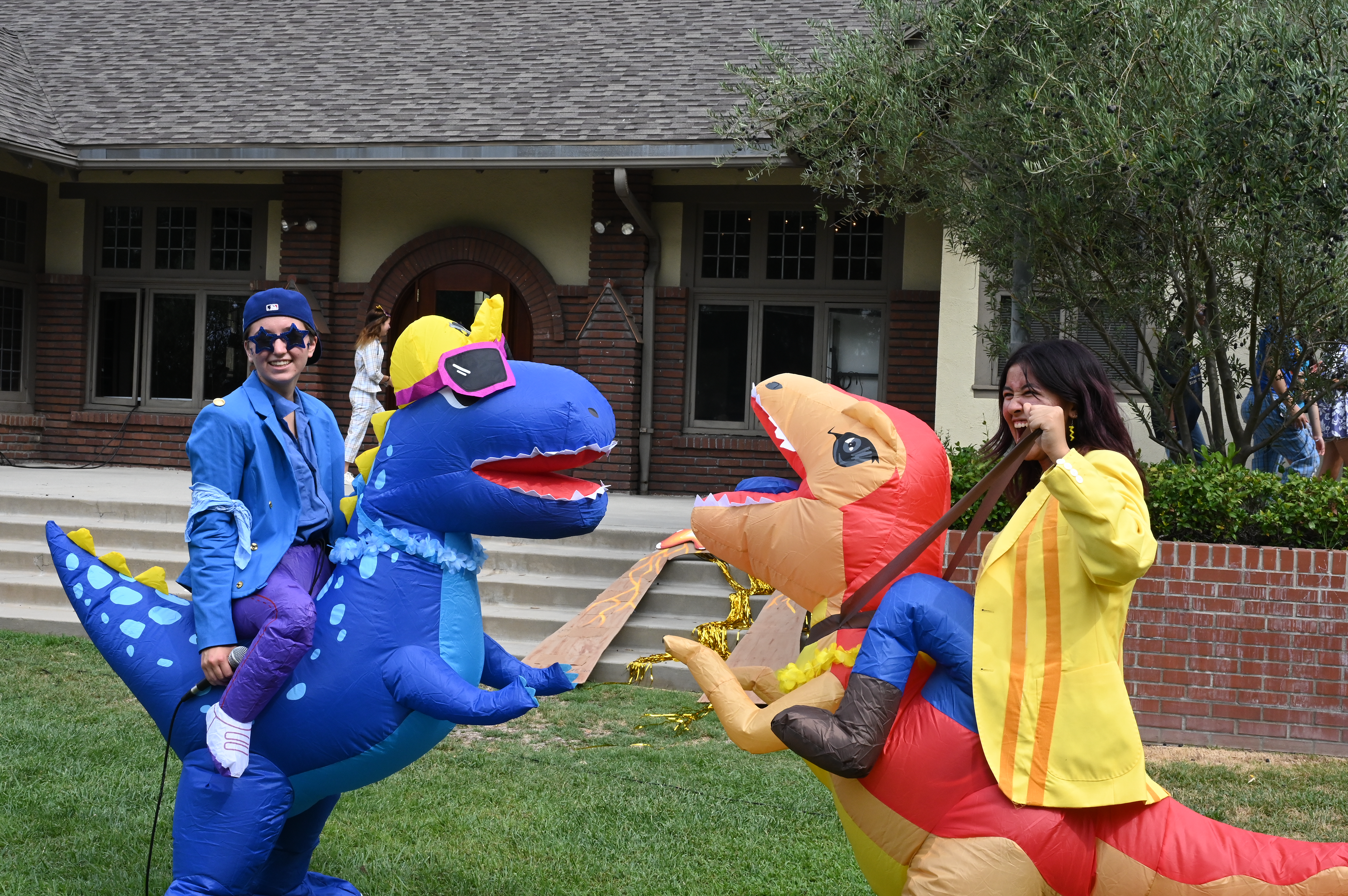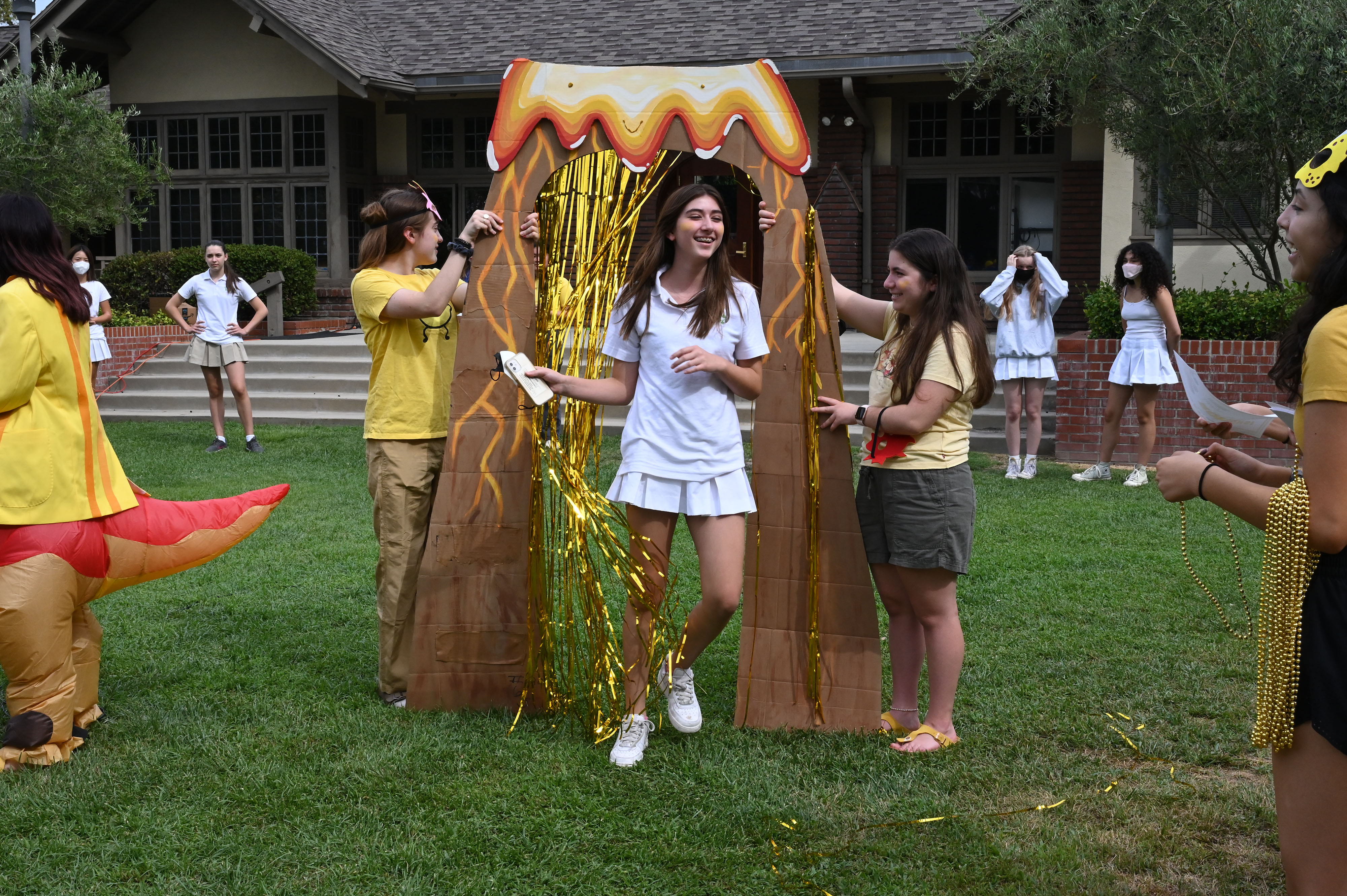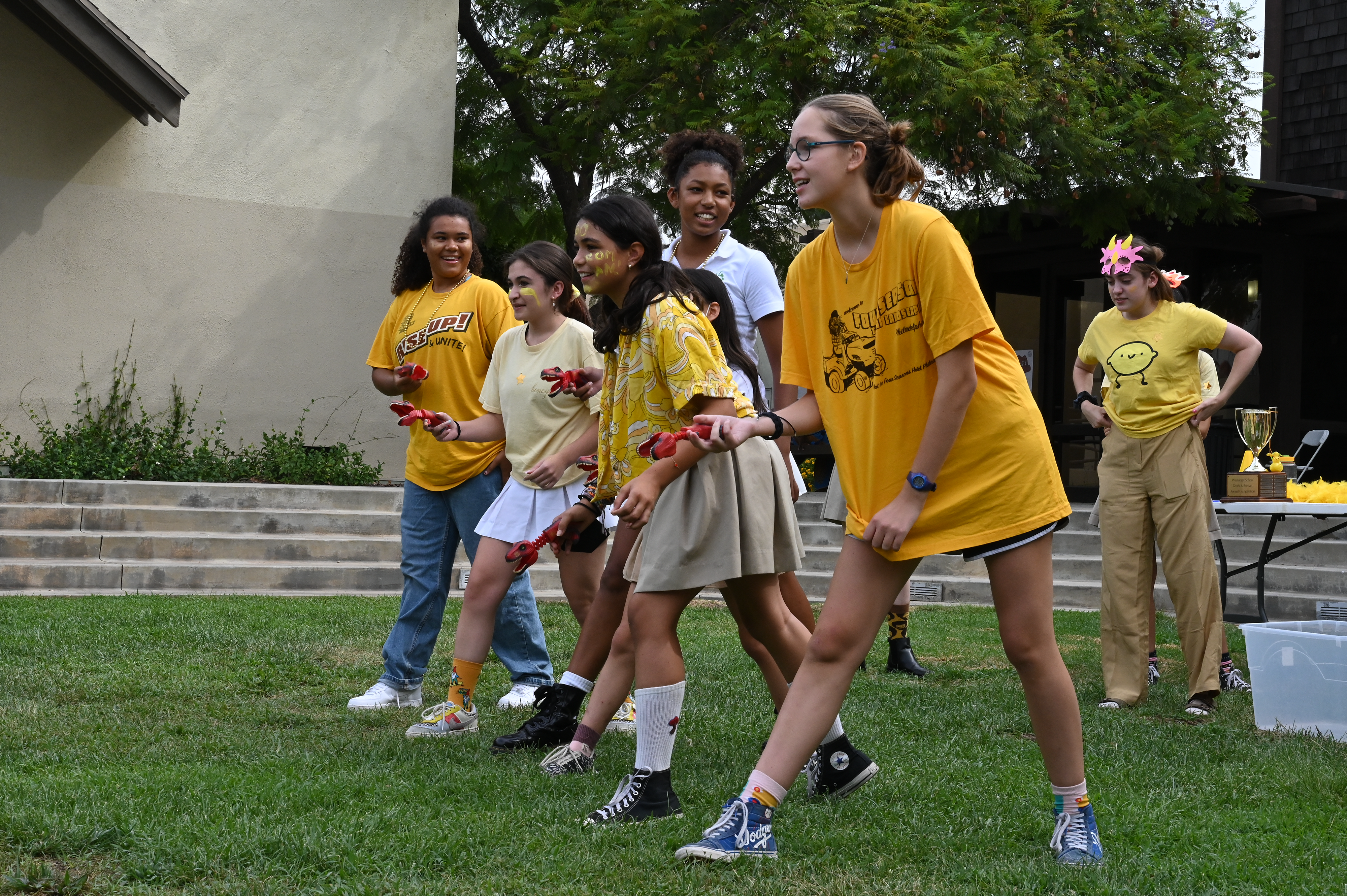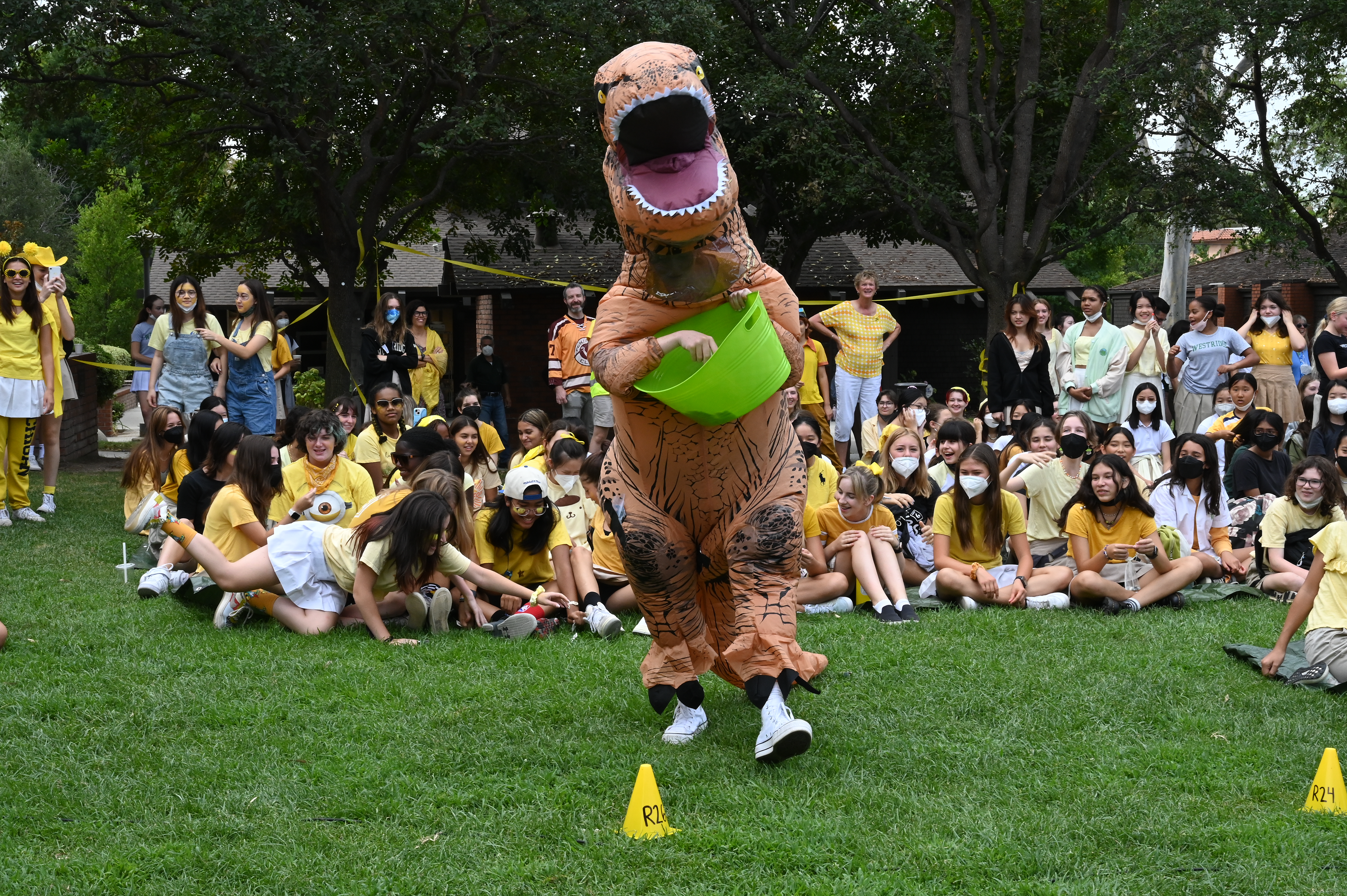 This year, the theme for Greek and Roman initiation was “Dinosaurs.” ASB Greek and Roman Heads Sunday L. ’23 and Athena N. ’23 dressed in blowup dinosaur costumes, and Greek and Roman grade-level representatives, as well as other members of Westridge’s Associated Student Body were decked out in yellow and blue dinosaur-themed attire.