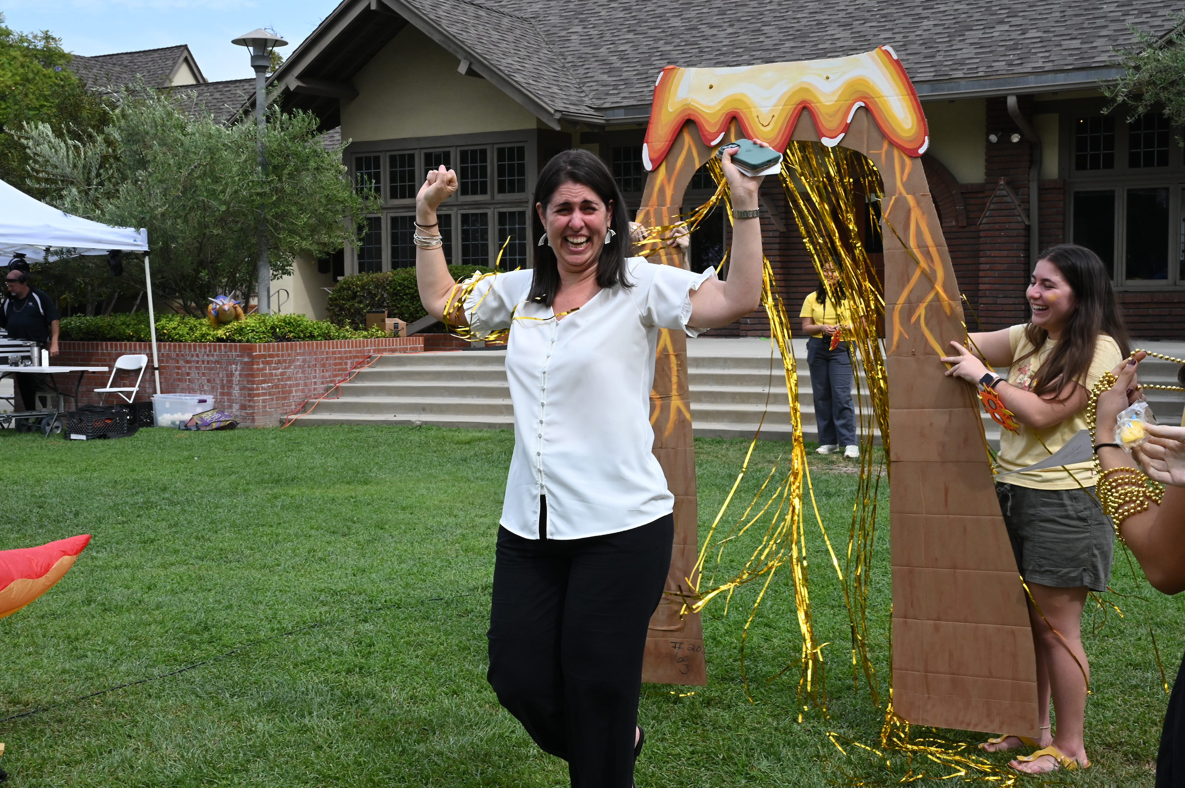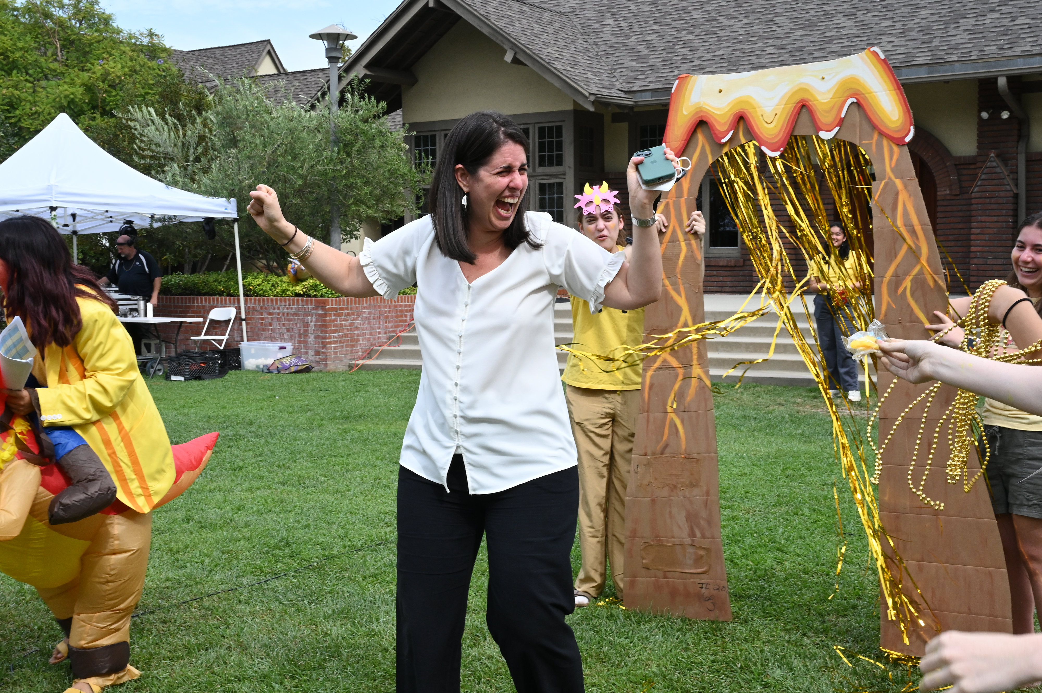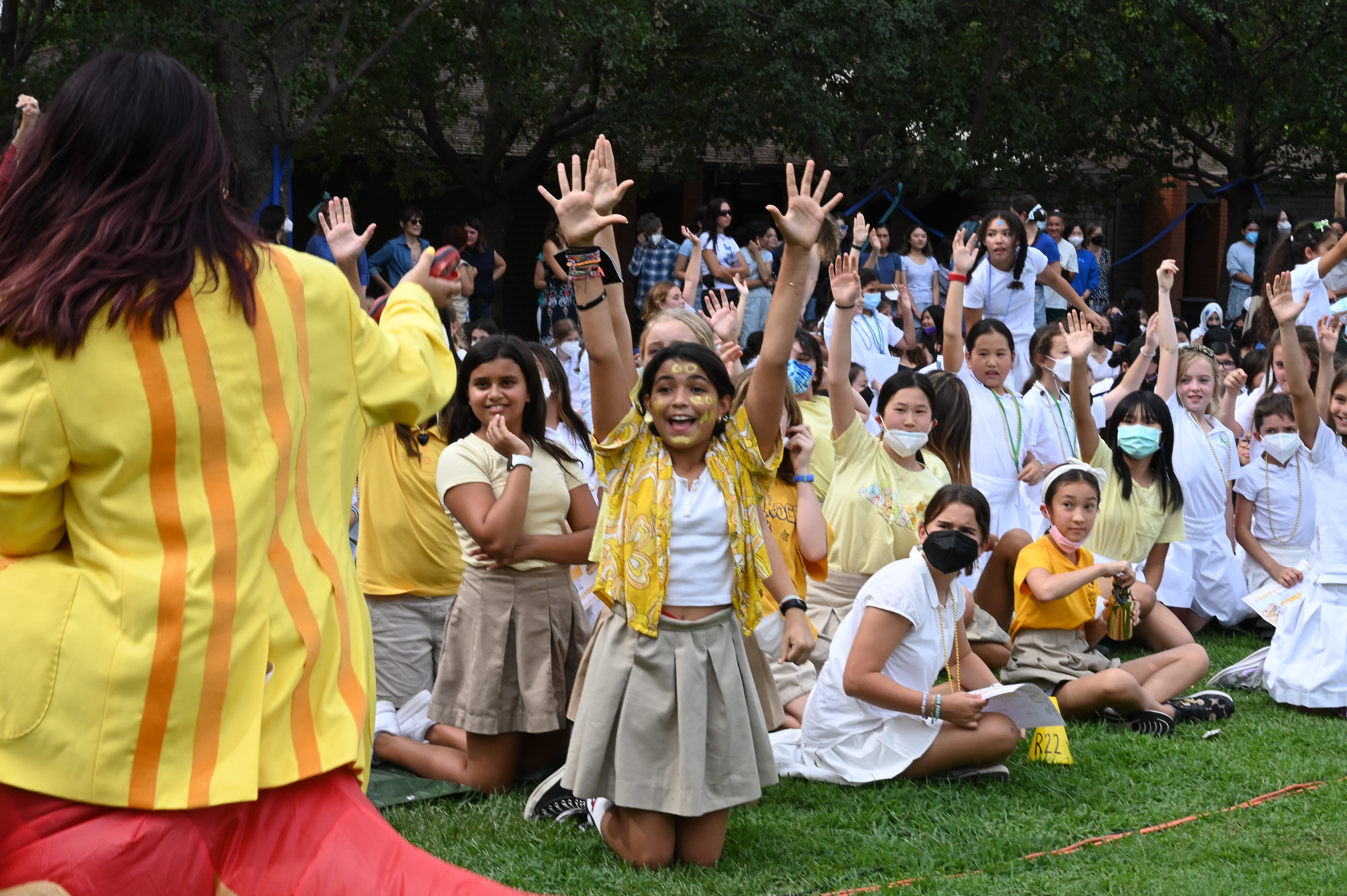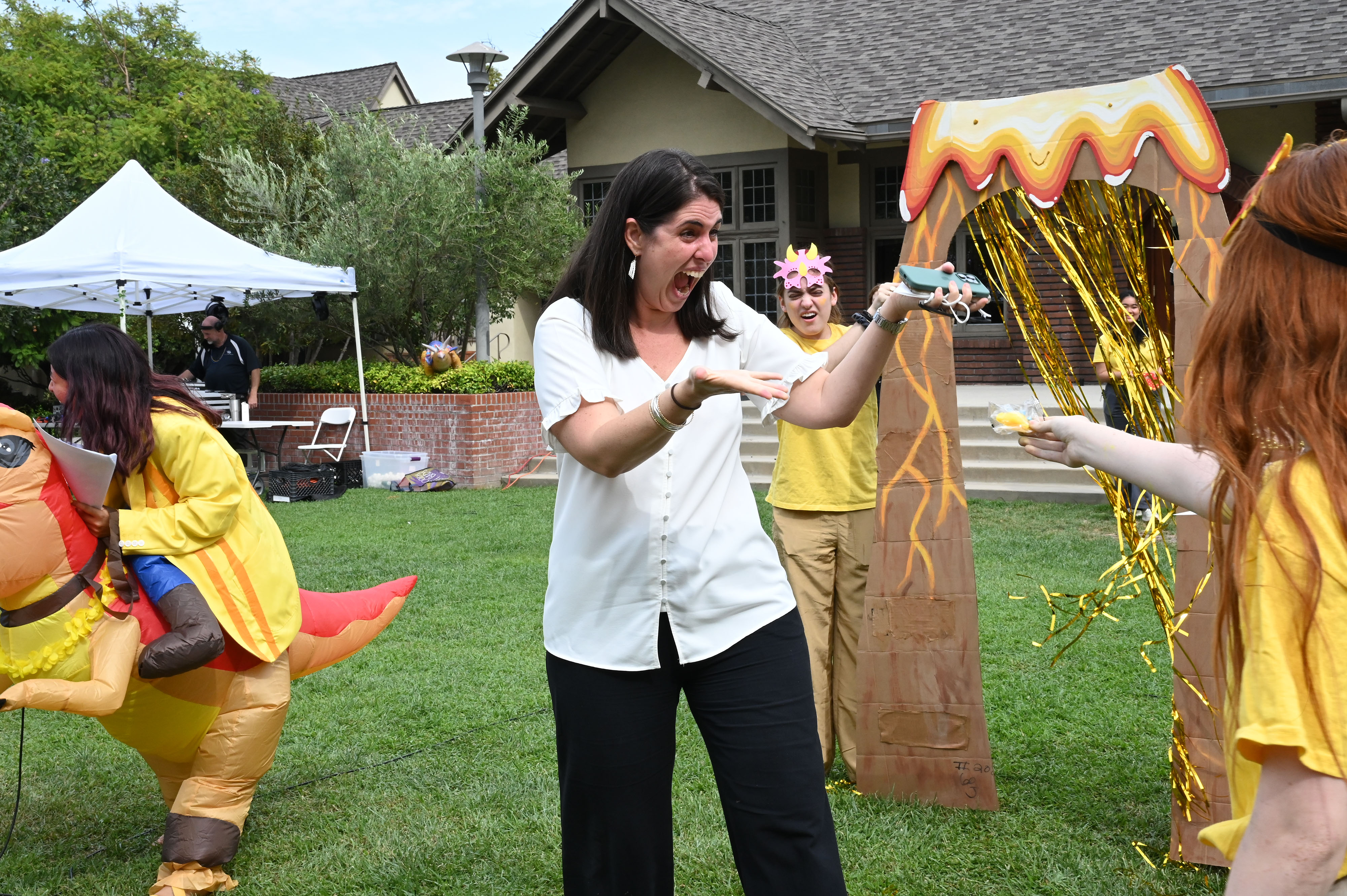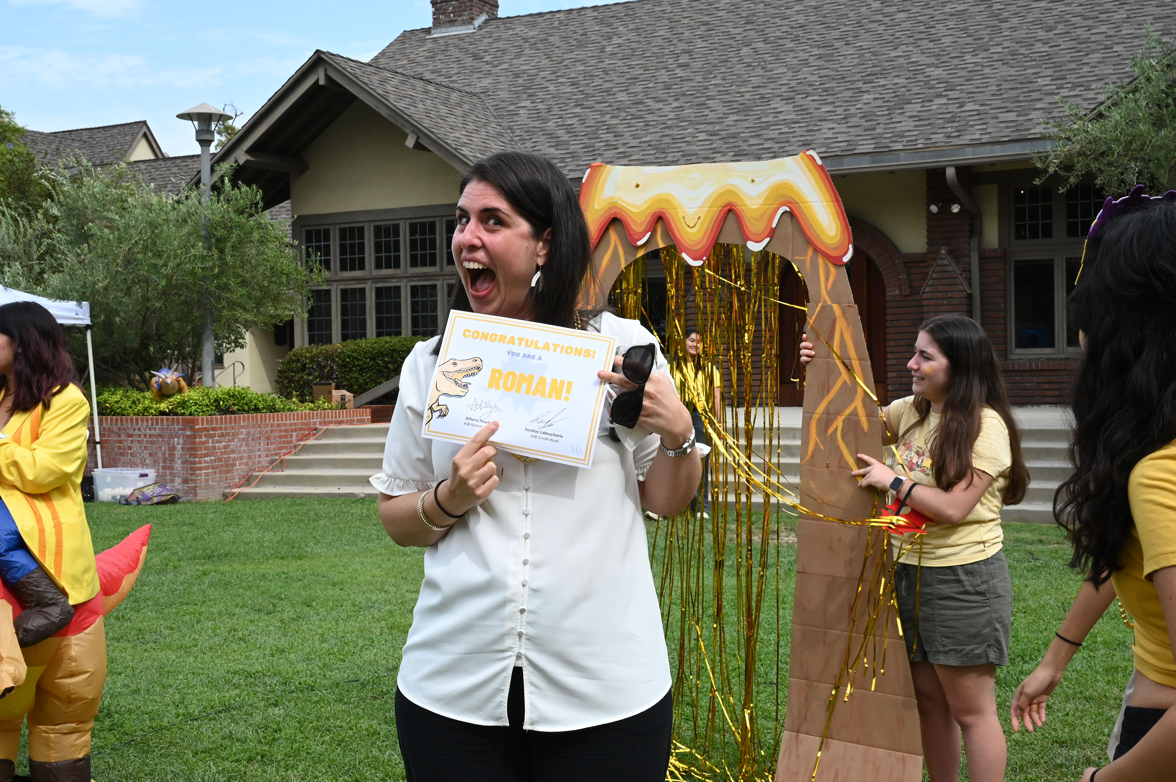 This year, the theme for Greek and Roman initiation was “Dinosaurs.” ASB Greek and Roman Heads Sunday L. ’23 and Athena N. ’23 dressed in blowup dinosaur costumes, and Greek and Roman grade-level representatives, as well as other members of Westridge’s Associated Student Body were decked out in yellow and blue dinosaur-themed attire.