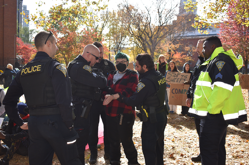 Adam Nussbaum ’25, who has been supporting the encampment with Yale’s Endowment Justice Collective, is arrested after refusing to abandon his tent.