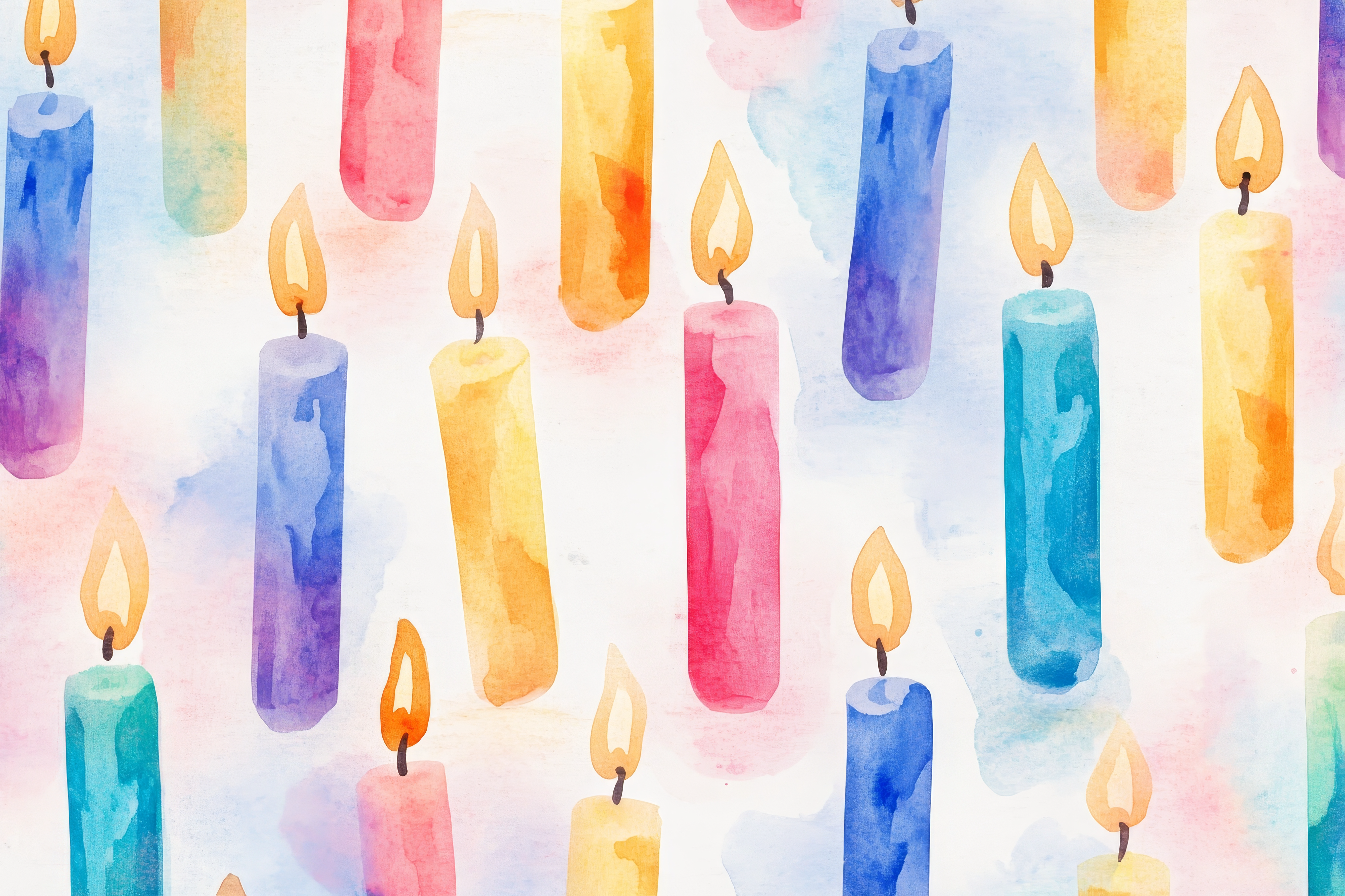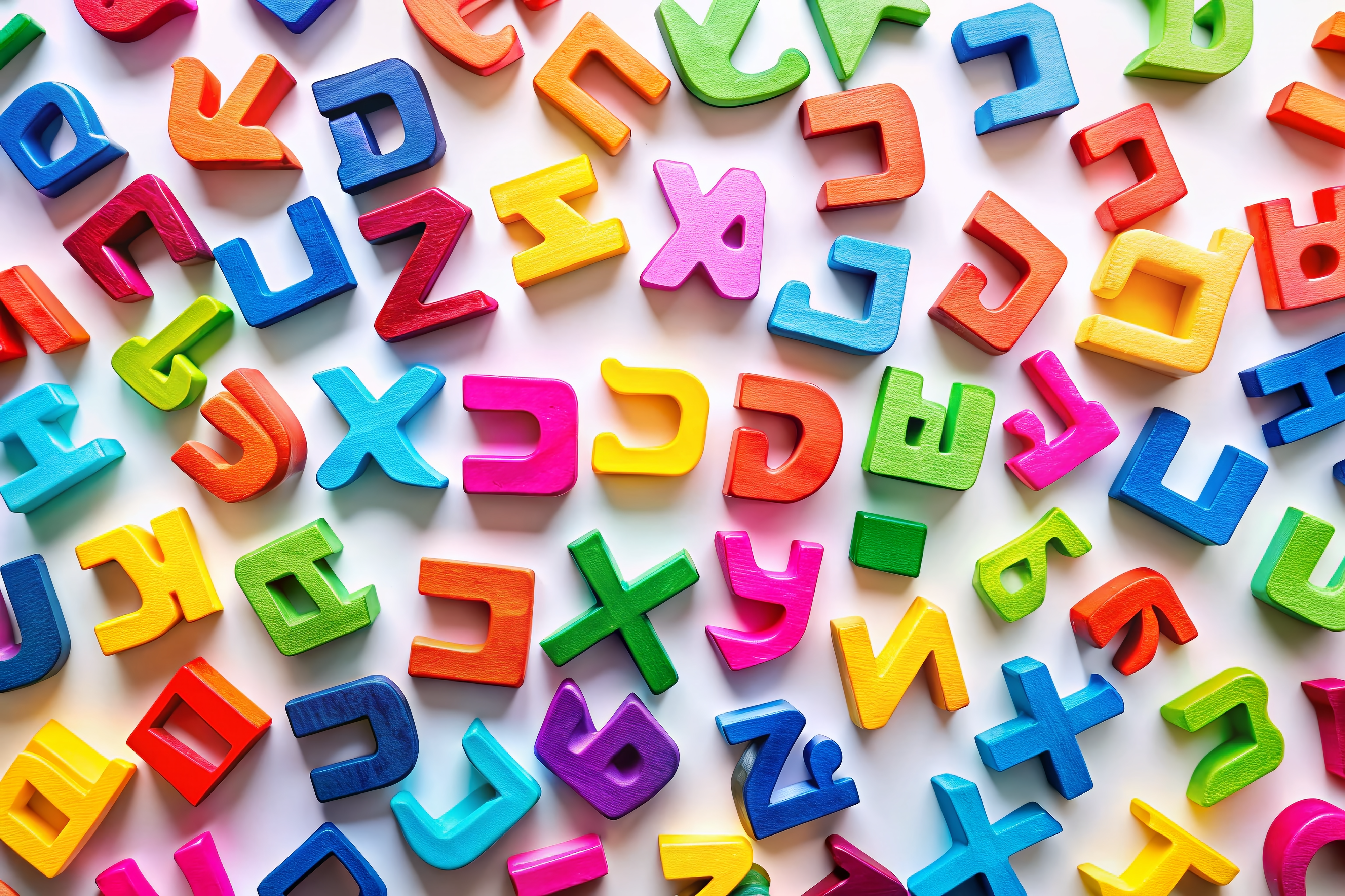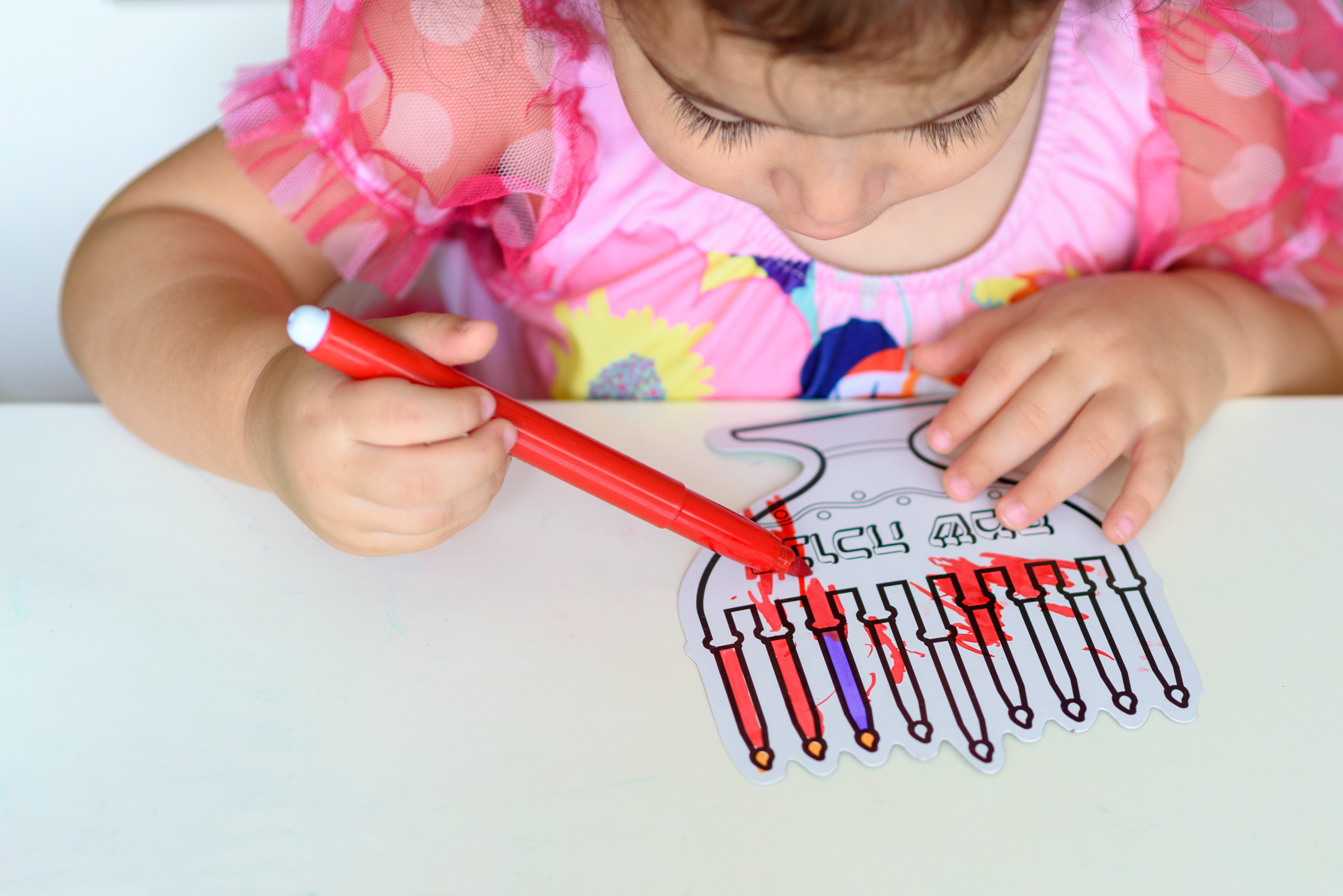 Created with images by Daria - "3d watercolor seamless tiles with hanukkah soy wax candles for sustainable holiday decor" • Man888 - "Colorful Hebrew Alphabet Letters on a White Background for Educational and Creative Use" • Inna - "Curly brunette cute little toddler girl painting with color pen paper menorah and candle Jewish holiday Chanukah. Hebrew text : Happy Hanukkah!" • BillionPhotos.com - "Woman typing computer."