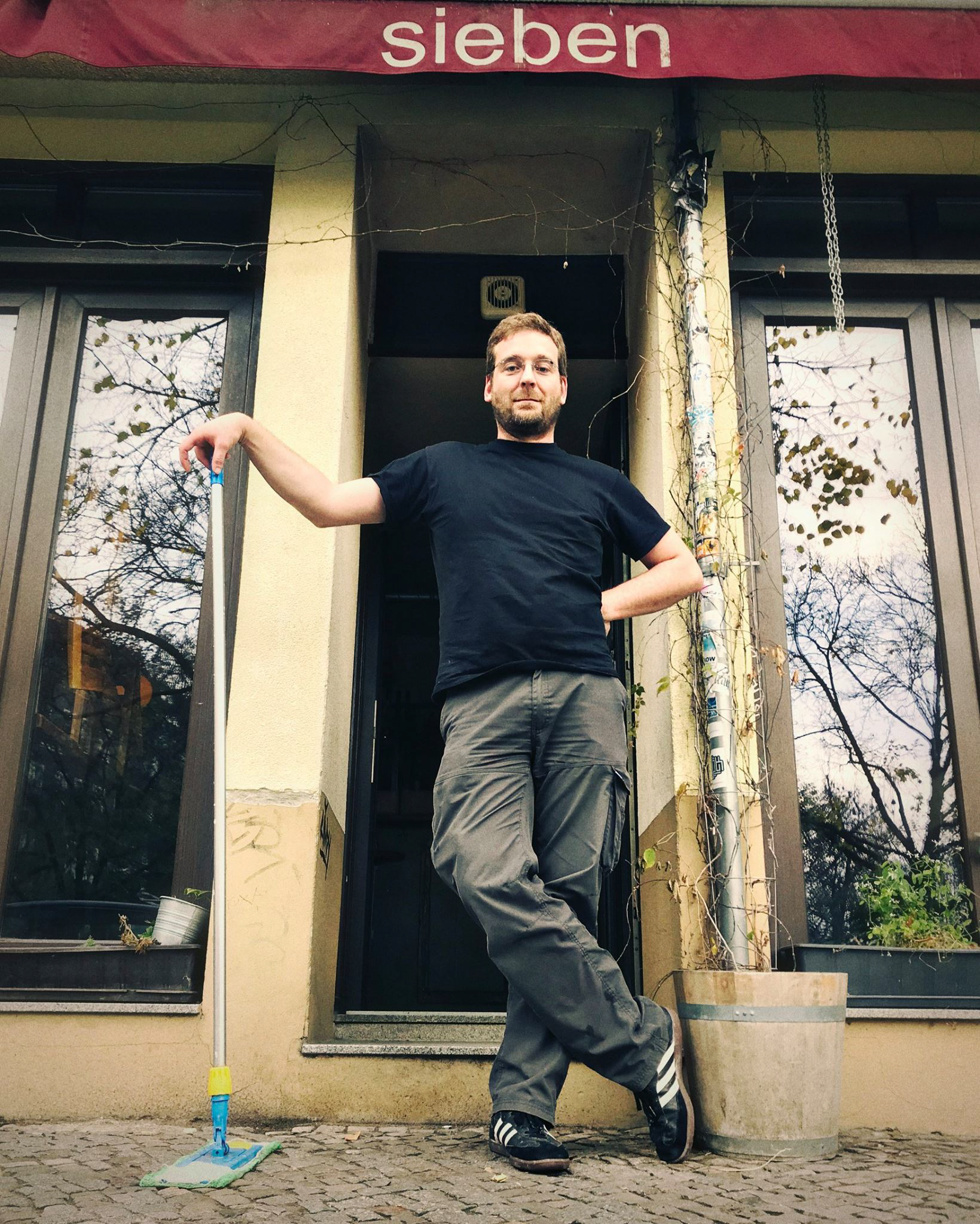 D: Ich komme jeden Tag von Beelitz hier her. Ich bin Haushandwerker bei Borger & Partner. Wir sind seit Anfang der 2000er-Jahre hier. Sonntagstrasse, Böklinstrasse, Lehnbachstrasse und Grünberger. Ich mach kleine Reparaturen, aber mein Hauptgebiet ist eigentlich Heizung-Sanitär. Aber auch Fenster, Türen, kleine Sachen. Natürlich Graffiti-Beseitigung.
