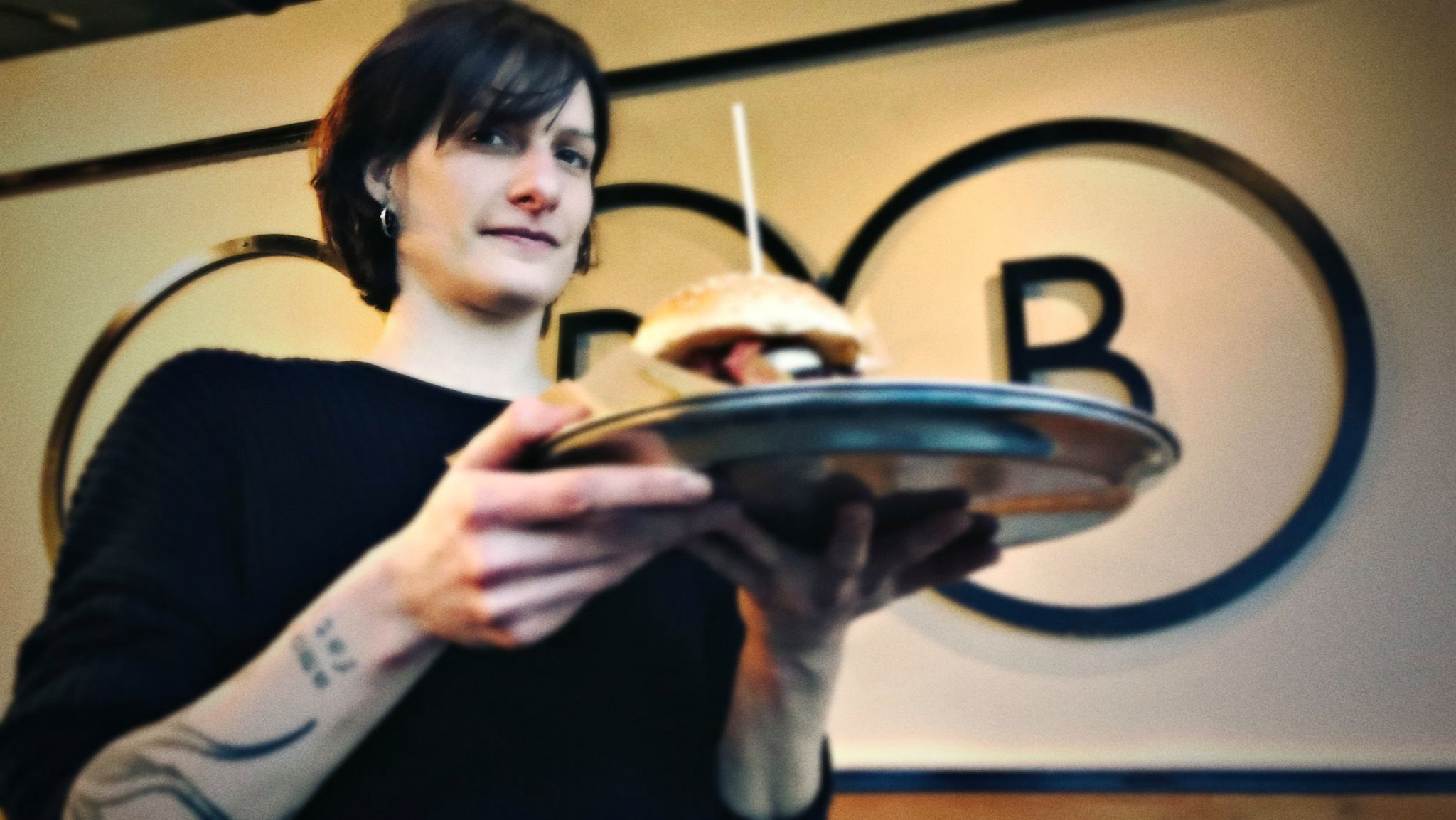 R: In mindestens 20 verschiedenen Strassen hier in der Gegend. Sonntagabend haben viele Leute Lust auf Burger. Darum hole ich ihnen einen, beispielsweise hier bei BBB.