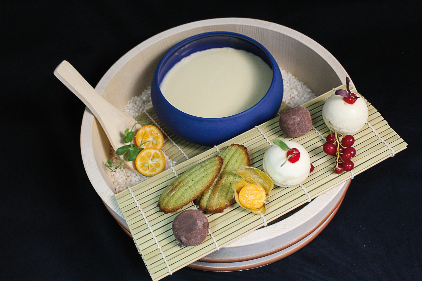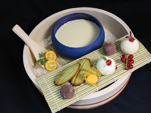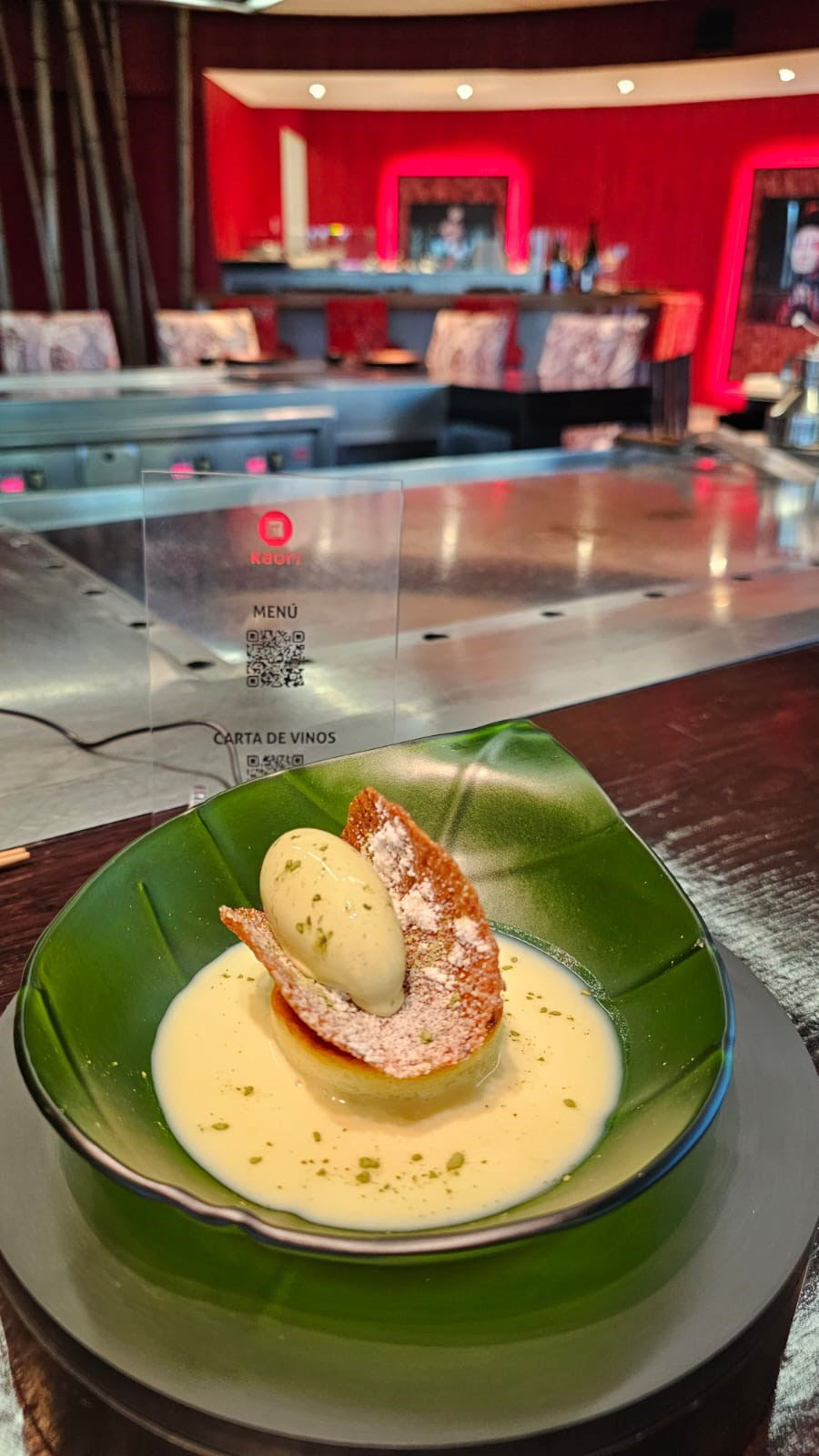 HELADO DE TE MATCHA SOBRE TEJA DE ALMENDRA Y COCO SENTADA SOBRE BIZCOCHO JAPONES DE QUESO Y COULIS DE FRAMBUESA, TODO ELLO SOBRE UNA SOPA DE CHOCOLATE BLANCO. - 6,00€